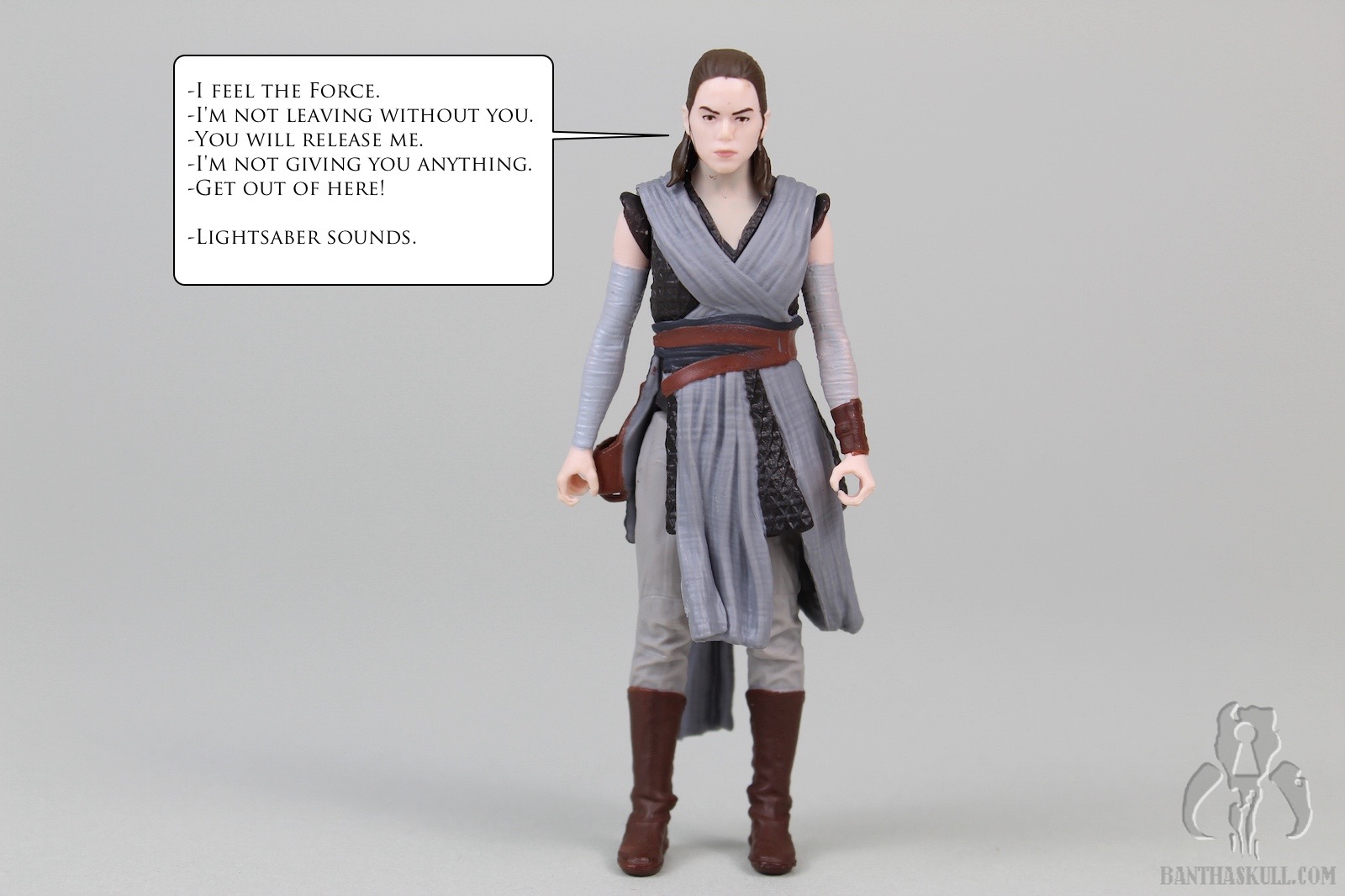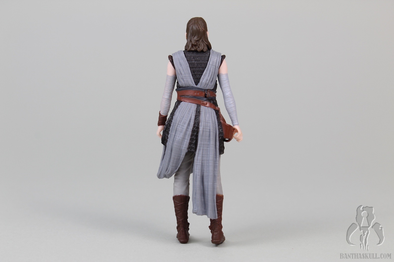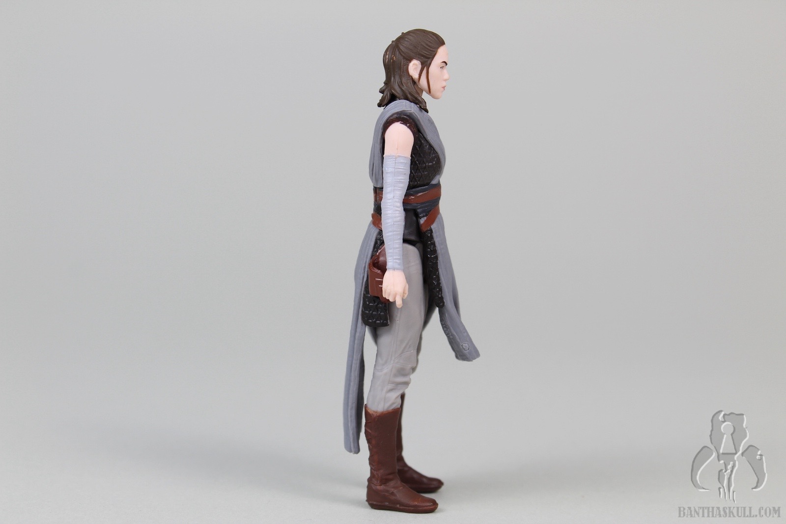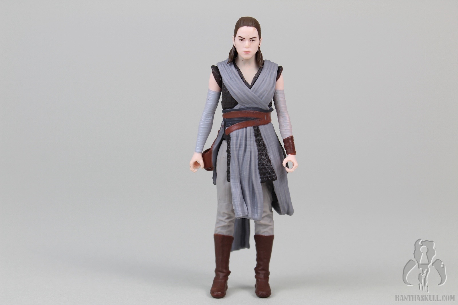 The pros: Rey has a reasonably complex design, with her mostly separately sculpted (non removeable) cross-body robes and belt. The different fabric textures are well done. The various colors don’t exactly “pop”, but are way more appealing than many of the other characters we’ve seen in the sequels. Paint is applied well, although my sample has some stray marks around the head and neck. The likeness isn’t terrible; she has a stern look on her face that seems suitable given the few short bits of promotional media we’ve seen so far. Three accessories are included. Rey tightly grips her magic pistol, and it fits snugly in the holster. Her staff has two colors and she can grip it in either hand. Her lightsaber can be held tightly, and it includes a sculpted loop at the base of the hilt.