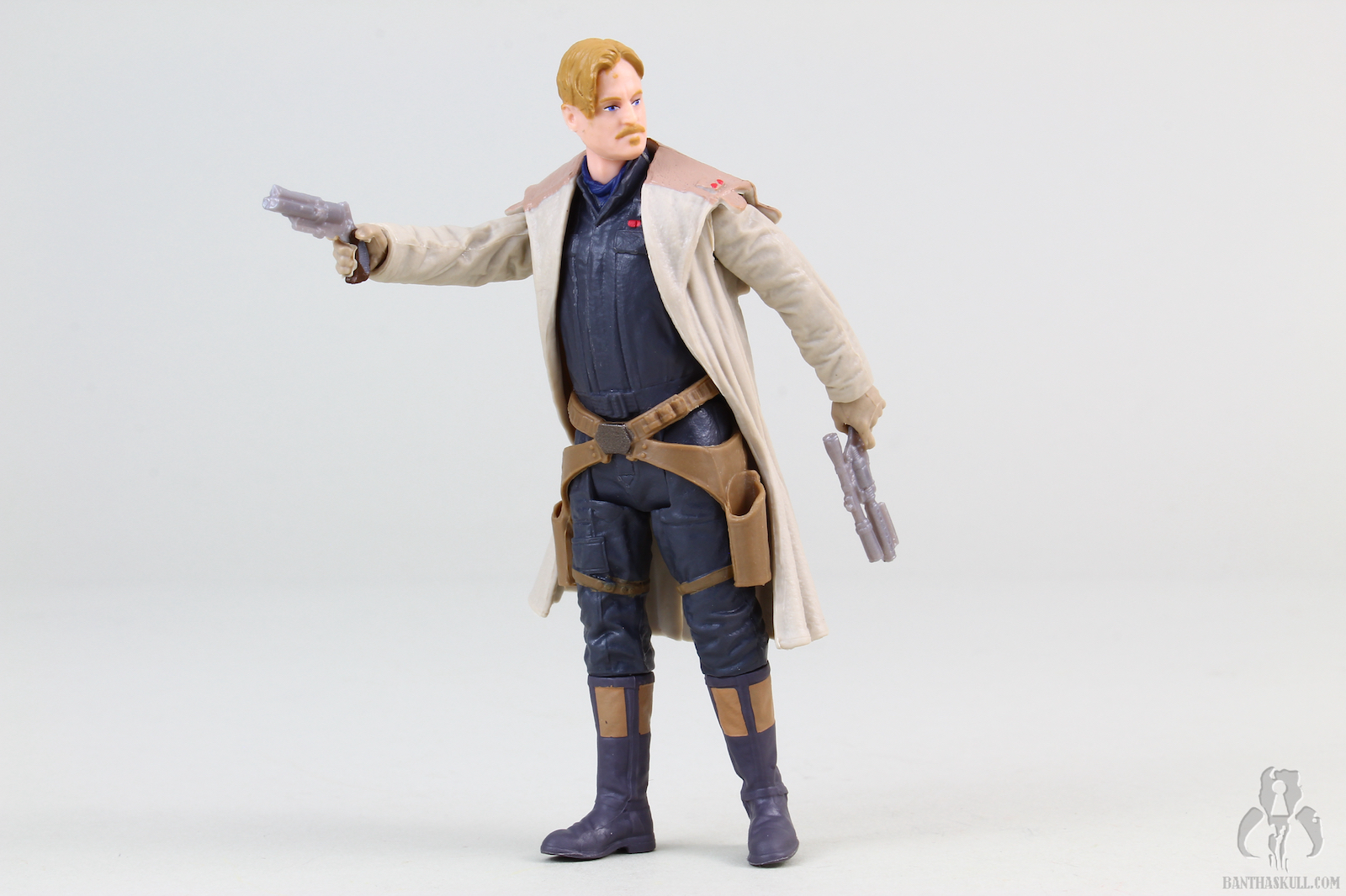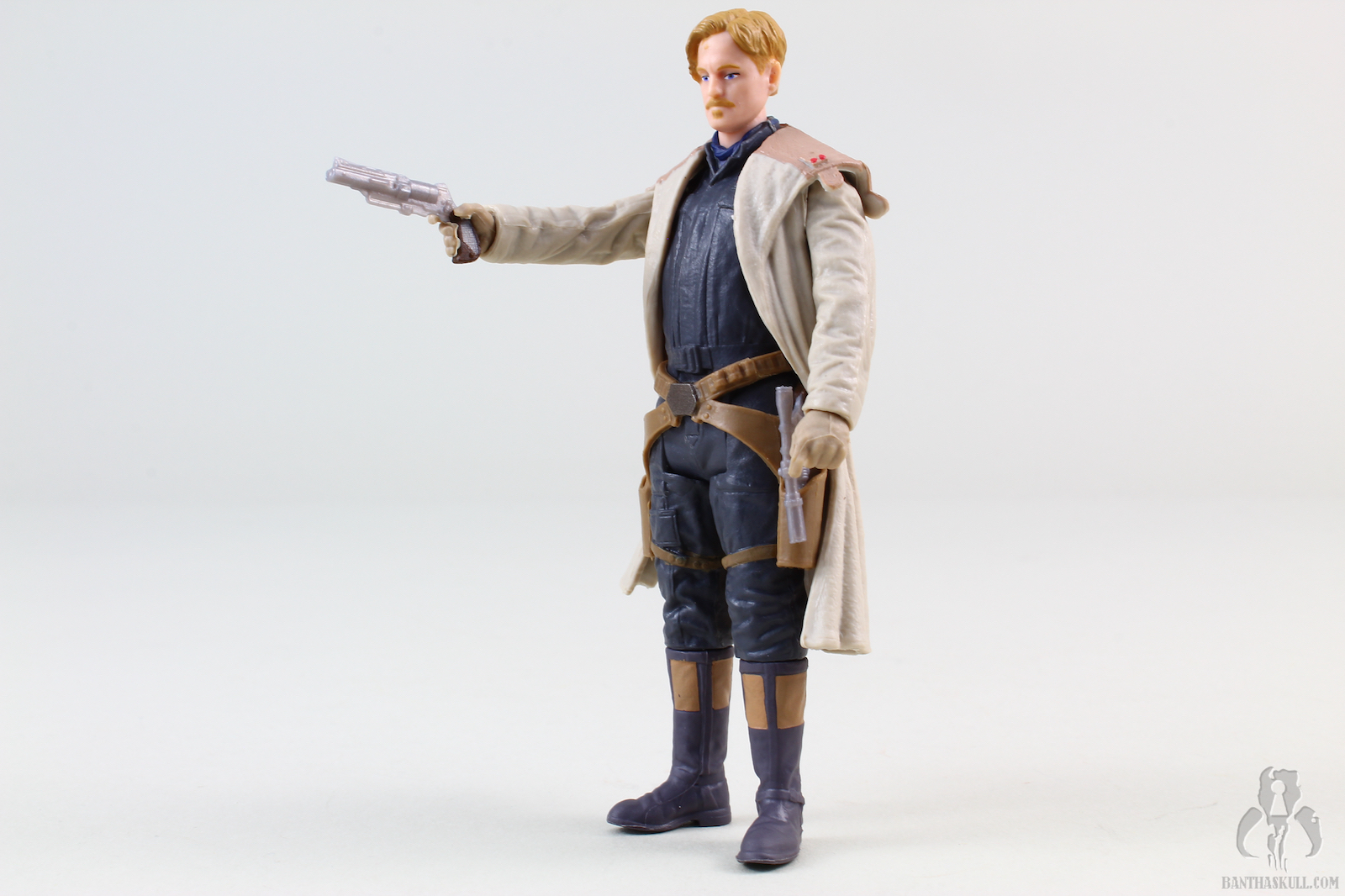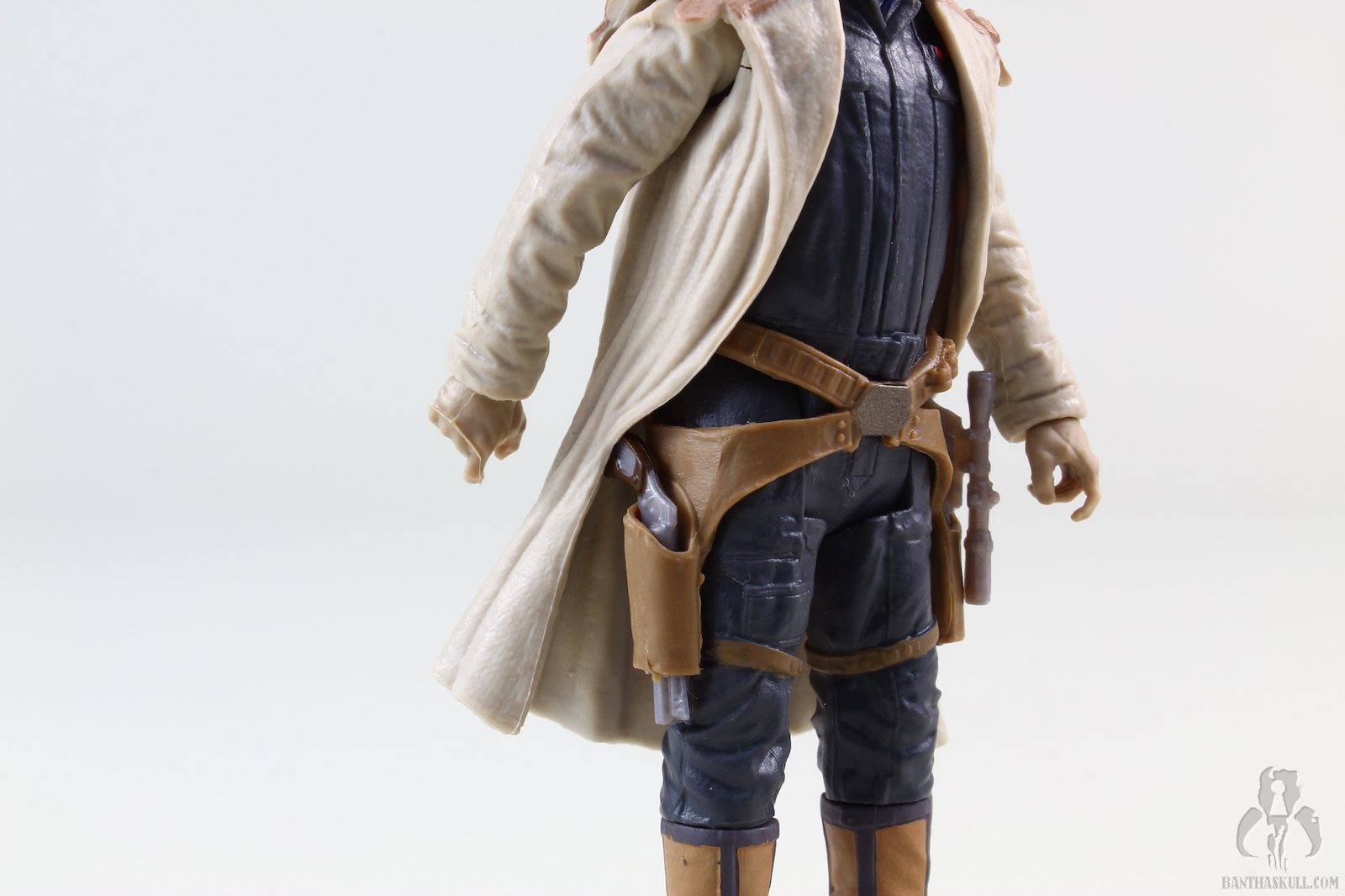 This is Tobias Beckett, who mentored Han Solo for a bit, before betraying him. The face somewhat vaguely resembles Woody Harrelson, but I’ve seen better from Hasbro. The sculpt is otherwise very good. Beckett is wearing his signature duster. The main part of the coat is separately sculpted and can be removed, but since the sleeves are left behind, there’s no point in doing so. Nevertheless, it does add some nice depth to the look of the figure. Also separately sculpted is the belt and double holster assembly, which looks great.