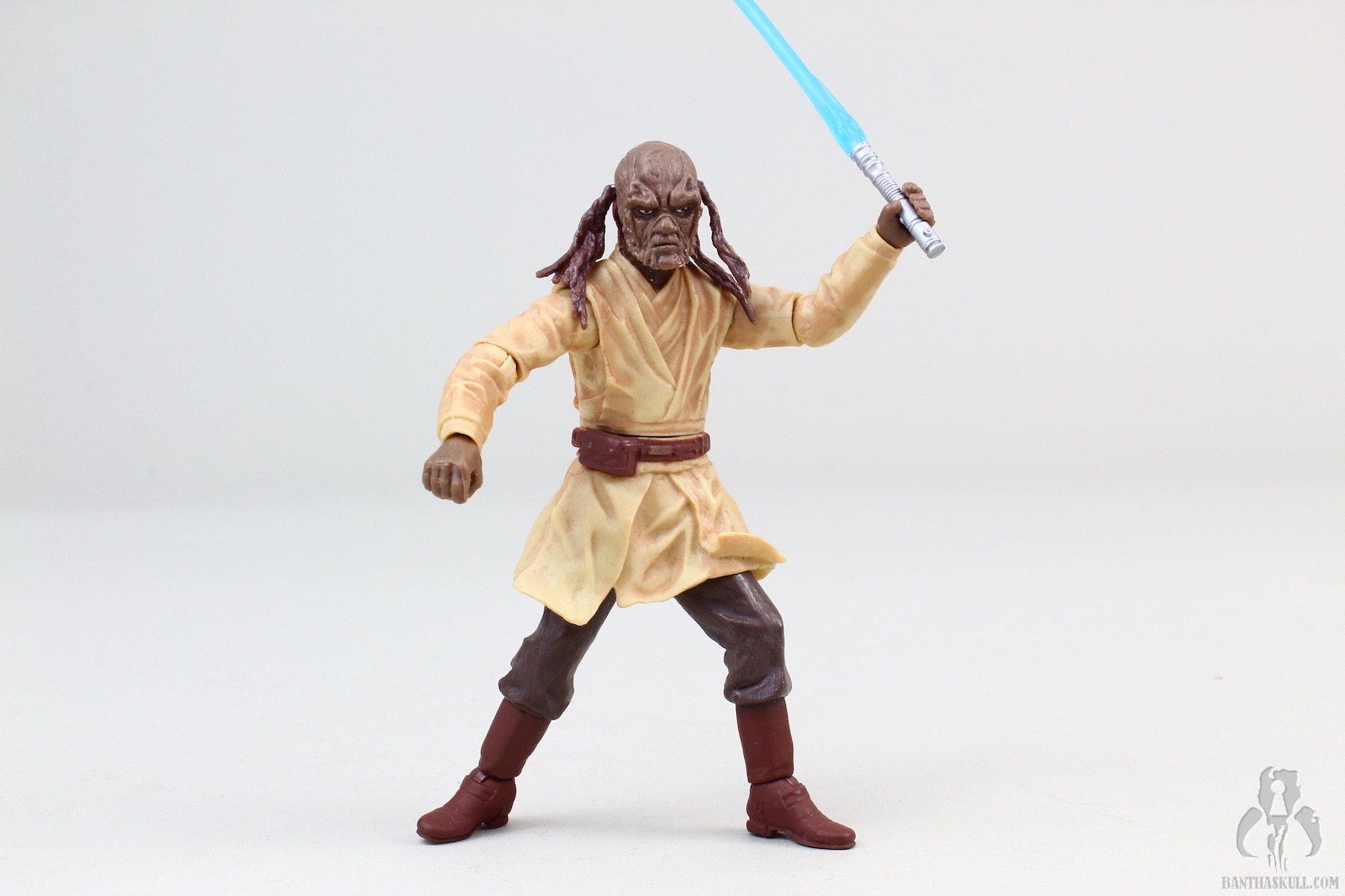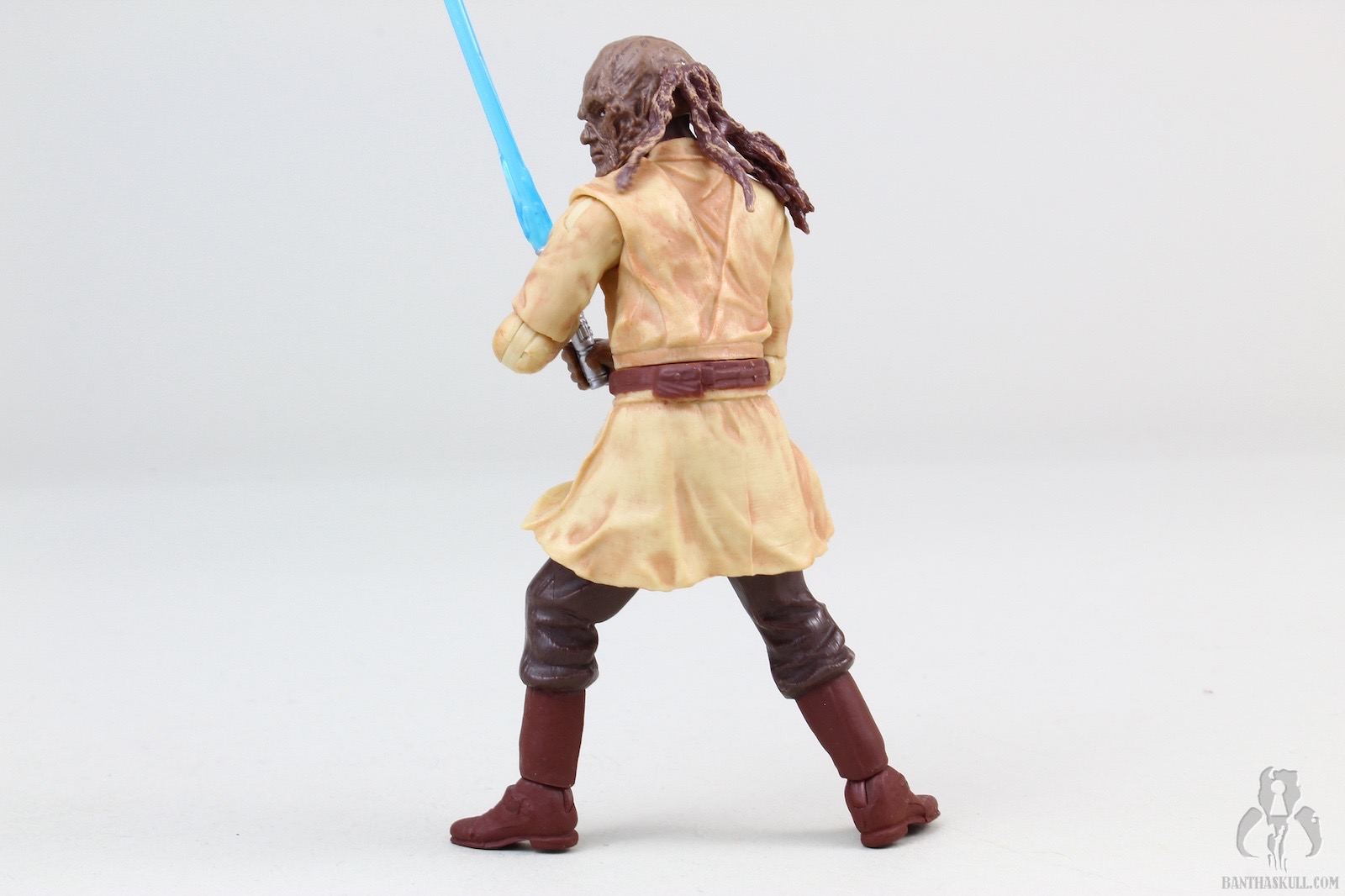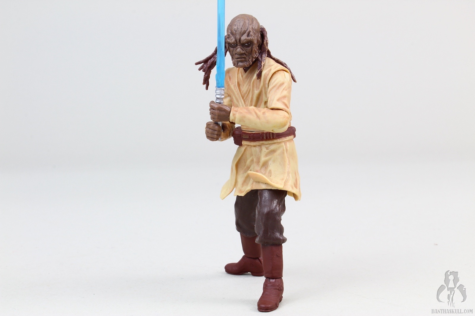 The sculpt of this figure is outstanding. The head/face, in particular, is extremely well done. The face is highly detailed, with an excellent Weequay sculpt. The hair/braiding is also well done, and looks great It is made of a bit of a soft plastic, so that the movement of the head is not hindered, as is often the case with characters that have long hair. The body is more or less a standard Jedi sculpt, except for one major flaw: the figure lacks articulated knees. In an effort to make up for this, the legs have been pre-posed into an action stance. It’s all kinds of terrible by today’s standards. The figure does look good, but posing options are very limited. The upper body does have what we expect, with otherwise full articulation. Sora can perform a convincing THWG, and can wield the lightsaber in either hand assuredly.