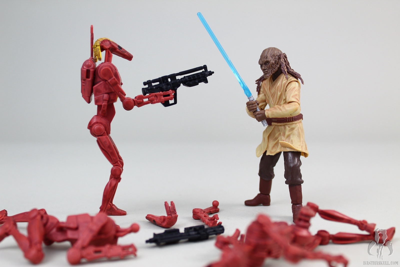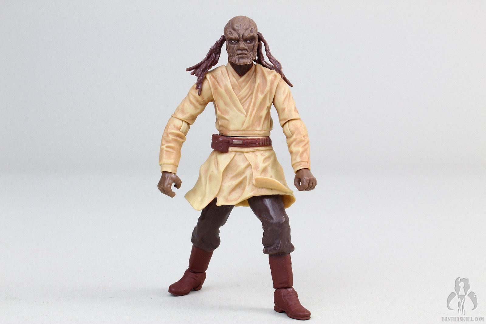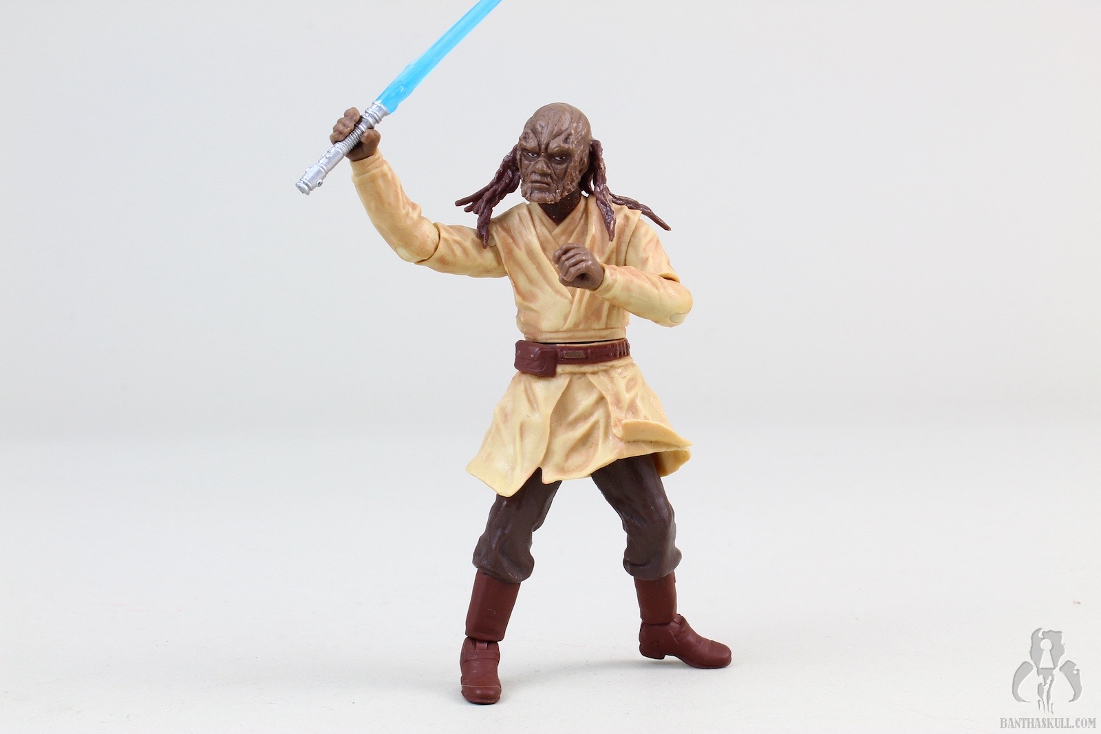 The sculpt of this figure is outstanding. The head/face, in particular, is extremely well done. The face is highly detailed, with an excellent Weequay sculpt. The hair/braiding is also well done, and looks great It is made of a bit of a soft plastic, so that the movement of the head is not hindered, as is often the case with characters that have long hair. The body is more or less a standard Jedi sculpt, except for one major flaw: the figure lacks articulated knees. In an effort to make up for this, the legs have been pre-posed into an action stance. It’s all kinds of terrible by today’s standards. The figure does look good, but posing options are very limited. The upper body does have what we expect, with otherwise full articulation. Sora can perform a convincing THWG, and can wield the lightsaber in either hand assuredly.