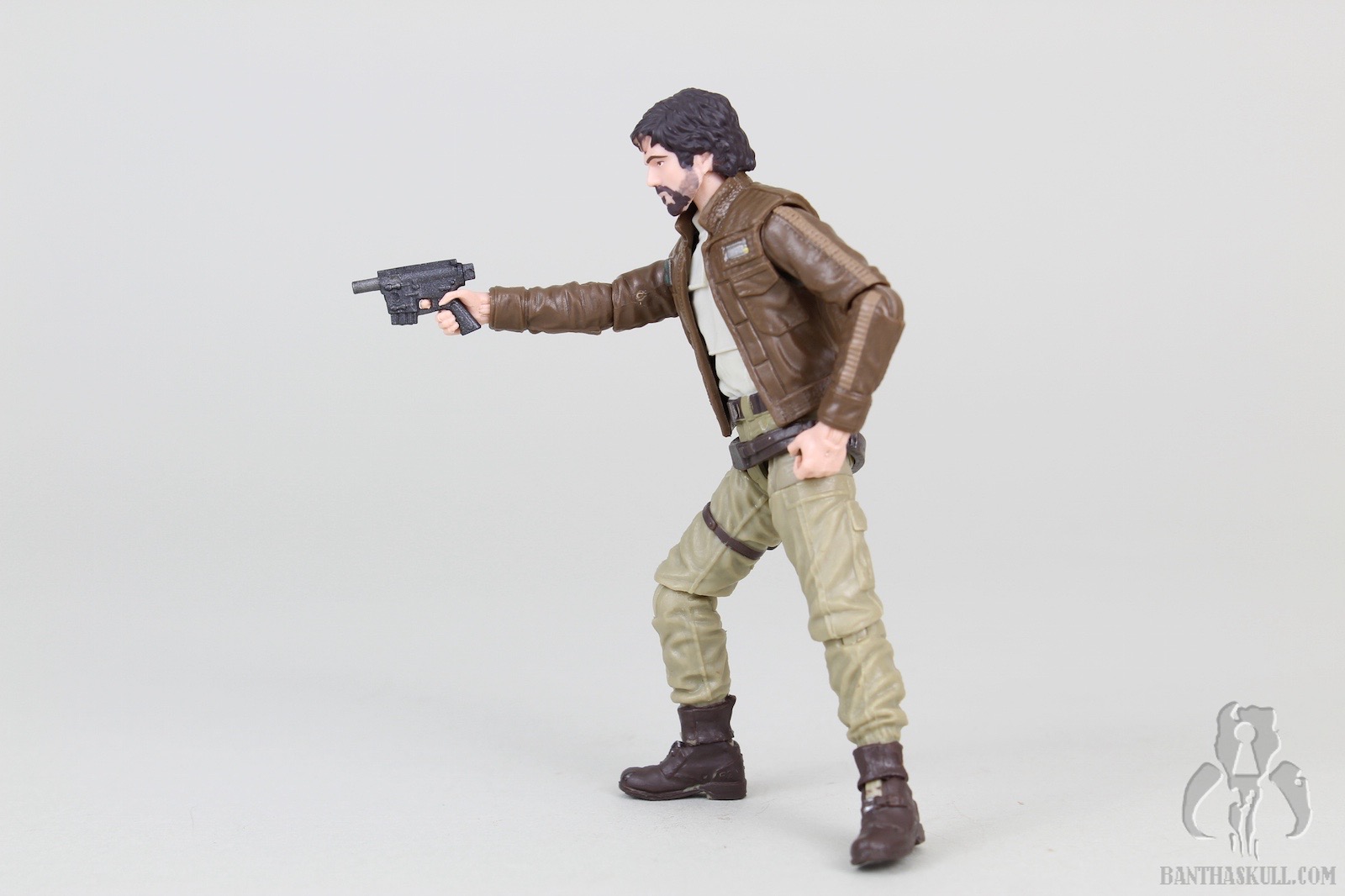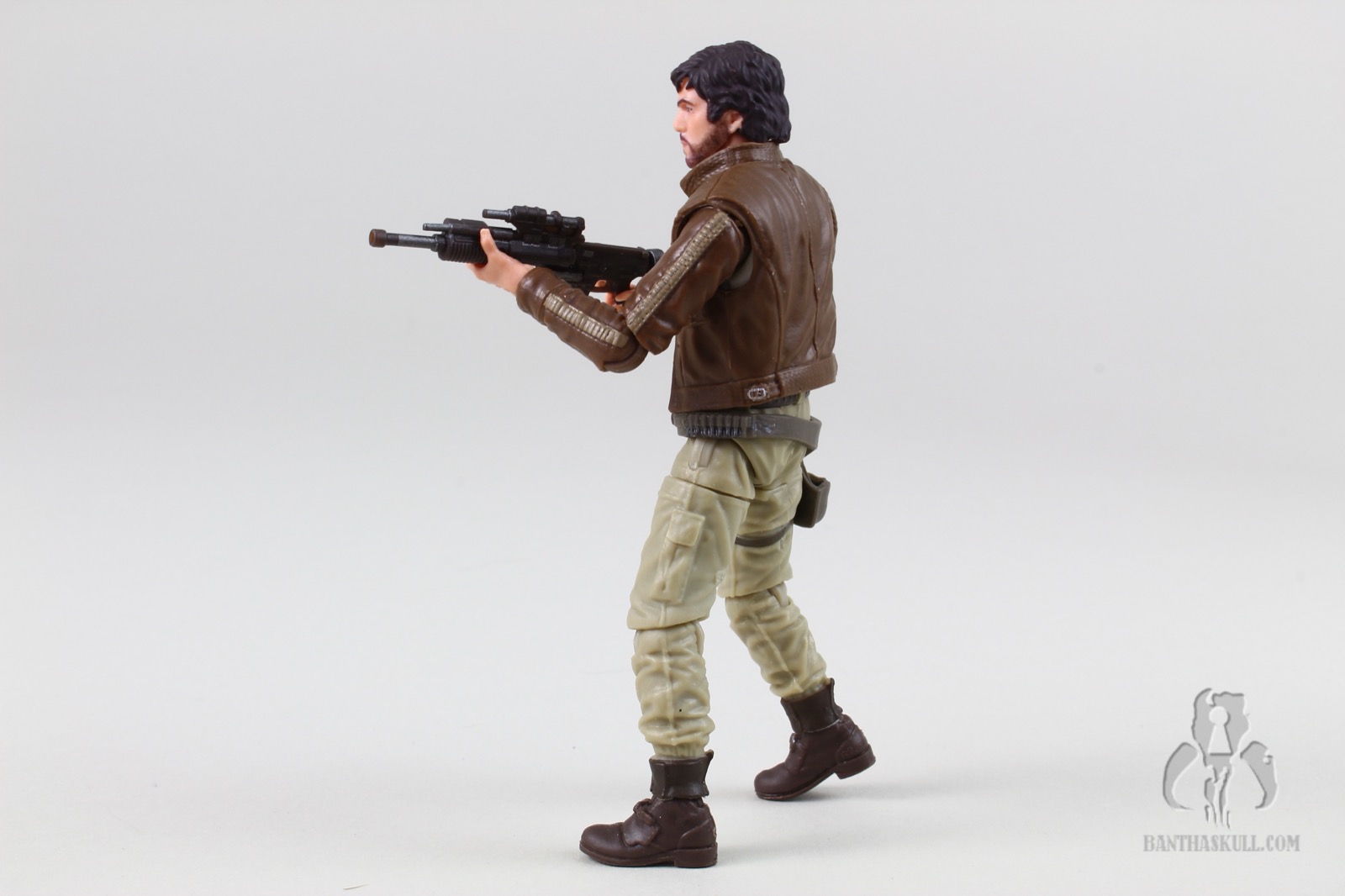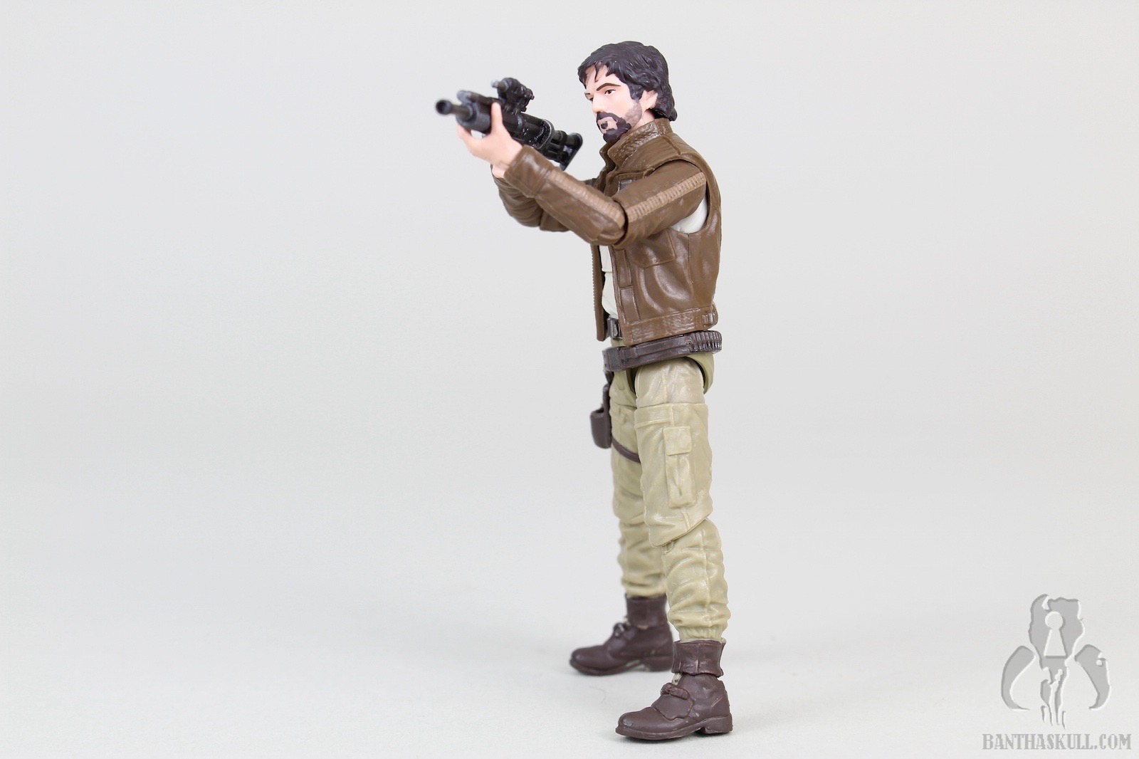 Cassian comes with a pistol, but the pistol also serves as 1 of 3 parts to a larger rifle. A stock can be added, as well as a barrel. The figure’s left hand is sculpted so that it can hold the barrel firmly, thus able to perform the always awesome two-handed weapon grip. Take that, 5POA! It’s a thing of beauty.