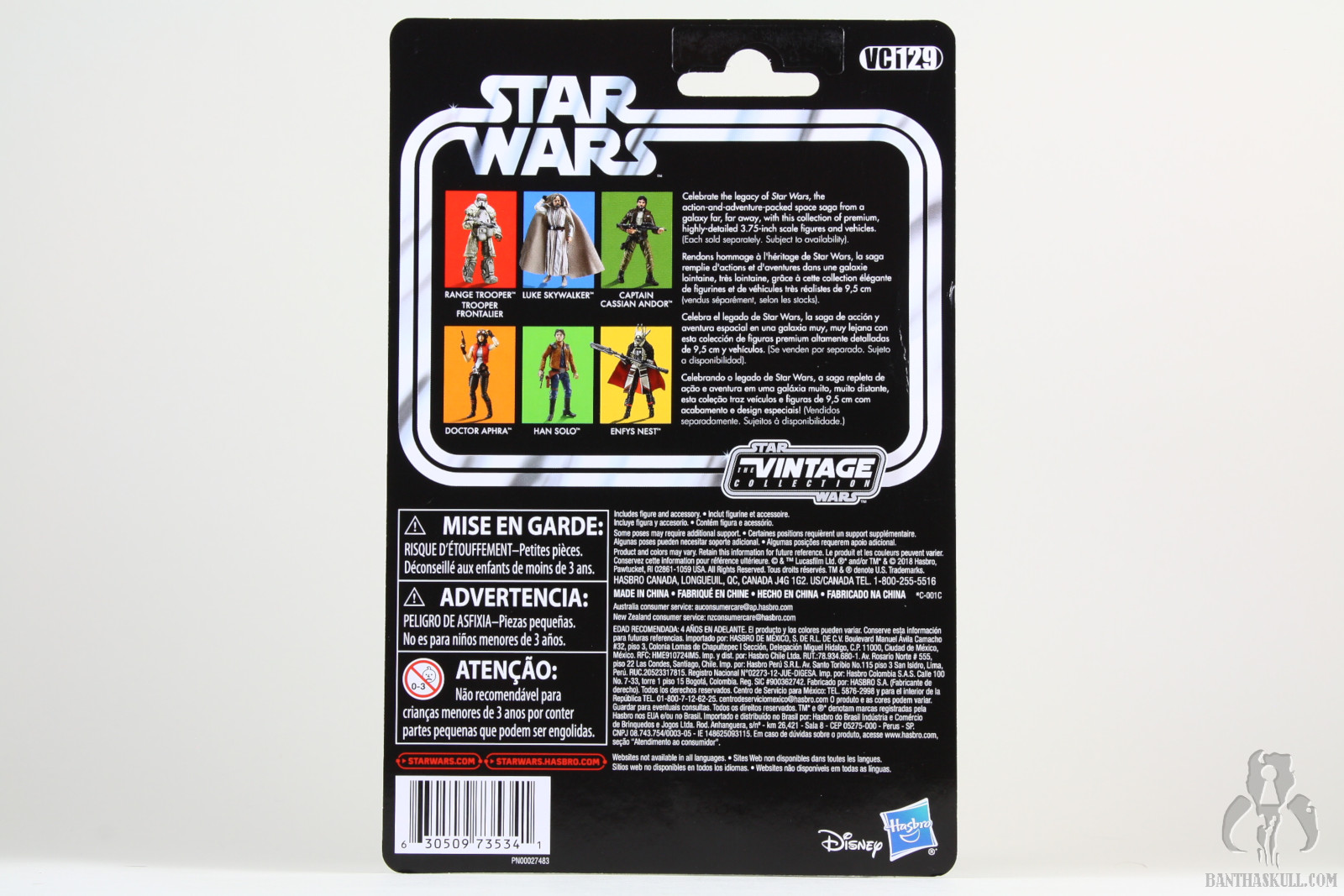 Single carded commentary (Chris): When the carded sample was shown at this year’s San Diego Comic Con, it sent a minor ripple through the fan base. Placing an Expanded Universe character on the base Star Wars card was viewed as sacrilegious since that is viewed as the A New Hope card. I’m not personally upset about this. I view this card as “non-denominational” and thus could be used as a generic catch all, but perhaps a concession could have been made by removing the Hildebrandt Luke and Leia from the upper right corner. I view the double racetrack Star Wars card as the absolute best design in the history of the the vintage Kenner and Vintage Collection cards, so that may lead me to being more permissive of its use outside of Episode IV characters. It’s a subject of debate, and Bantha Skull reader, Scott, submitted some suggestions for alternative cards to use for Expanded Universe characters. One day when my day job schedule is more accommodating, I hope to publish his suggestions. In this case, I think it’s another stunning Vintage Collection design, and similar to nomad’s Shae Vizla review, I think the depiction of the character on the card back is much more attractive than the figure representation.