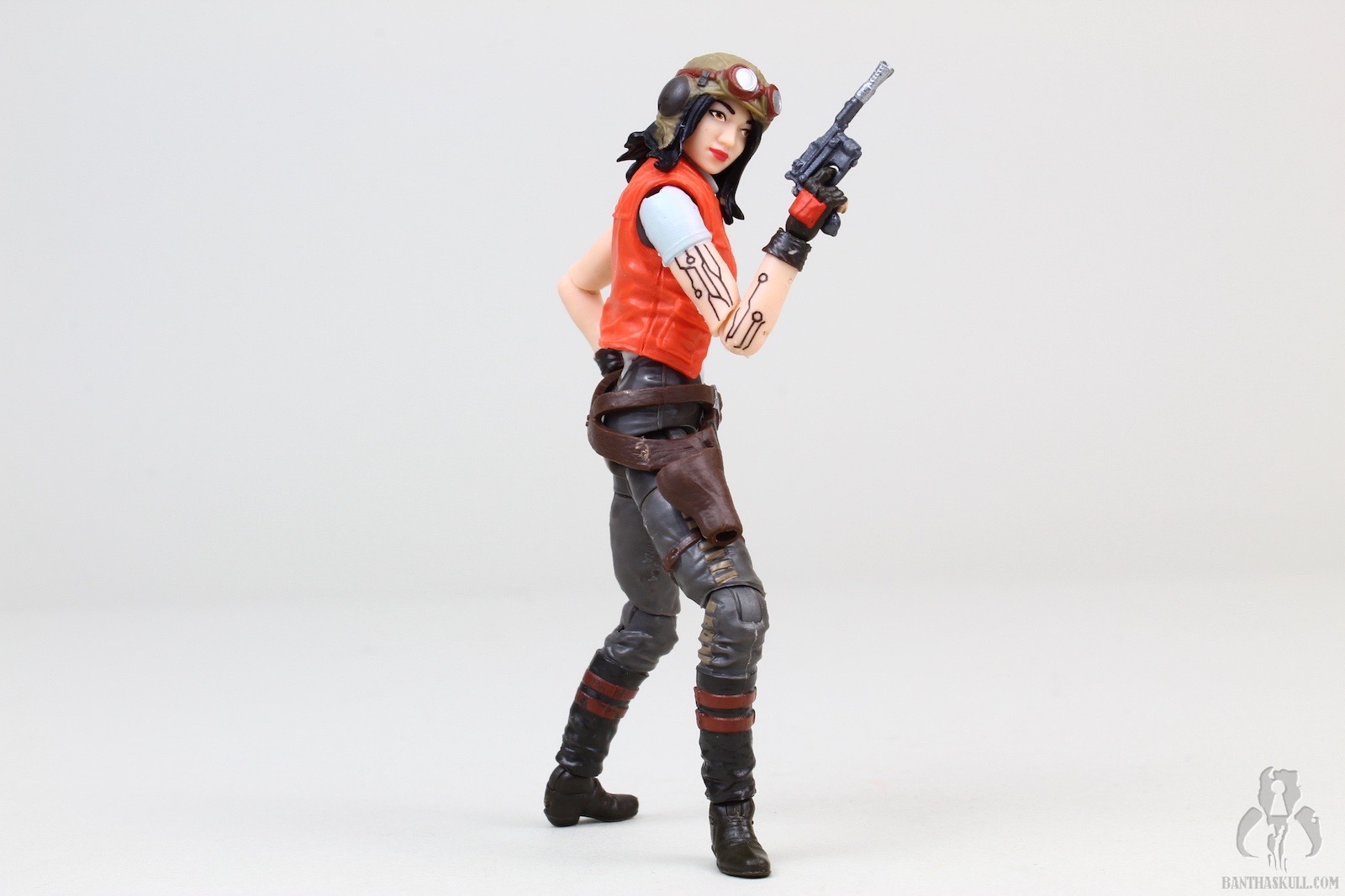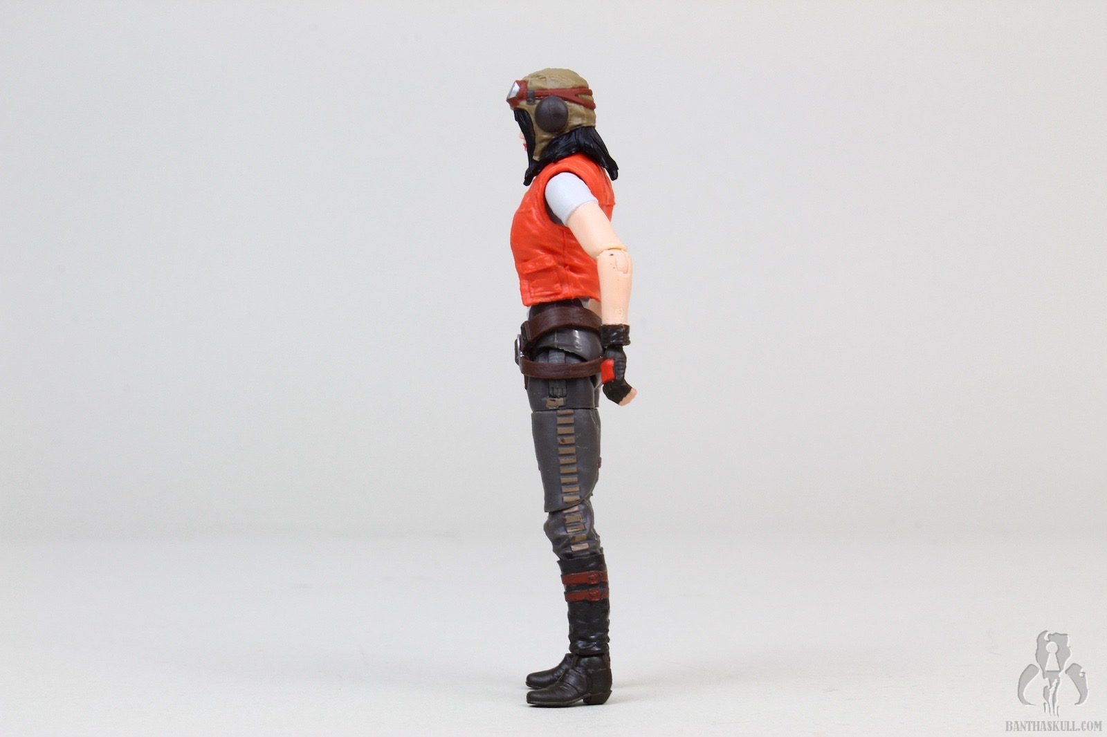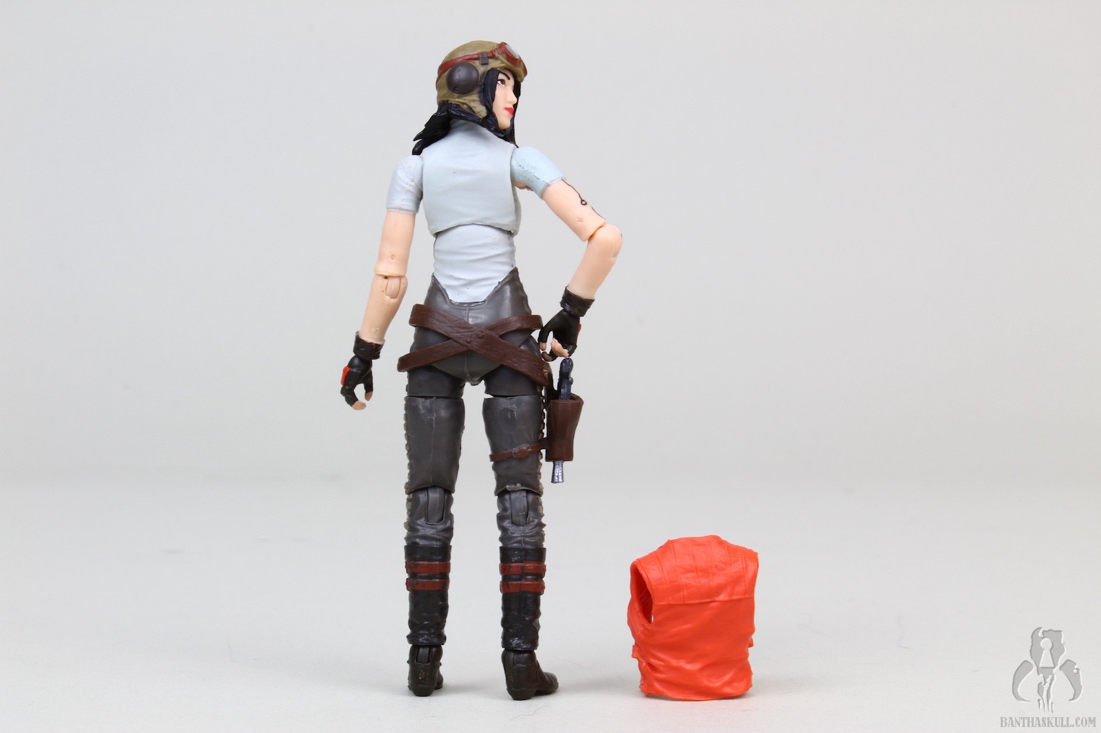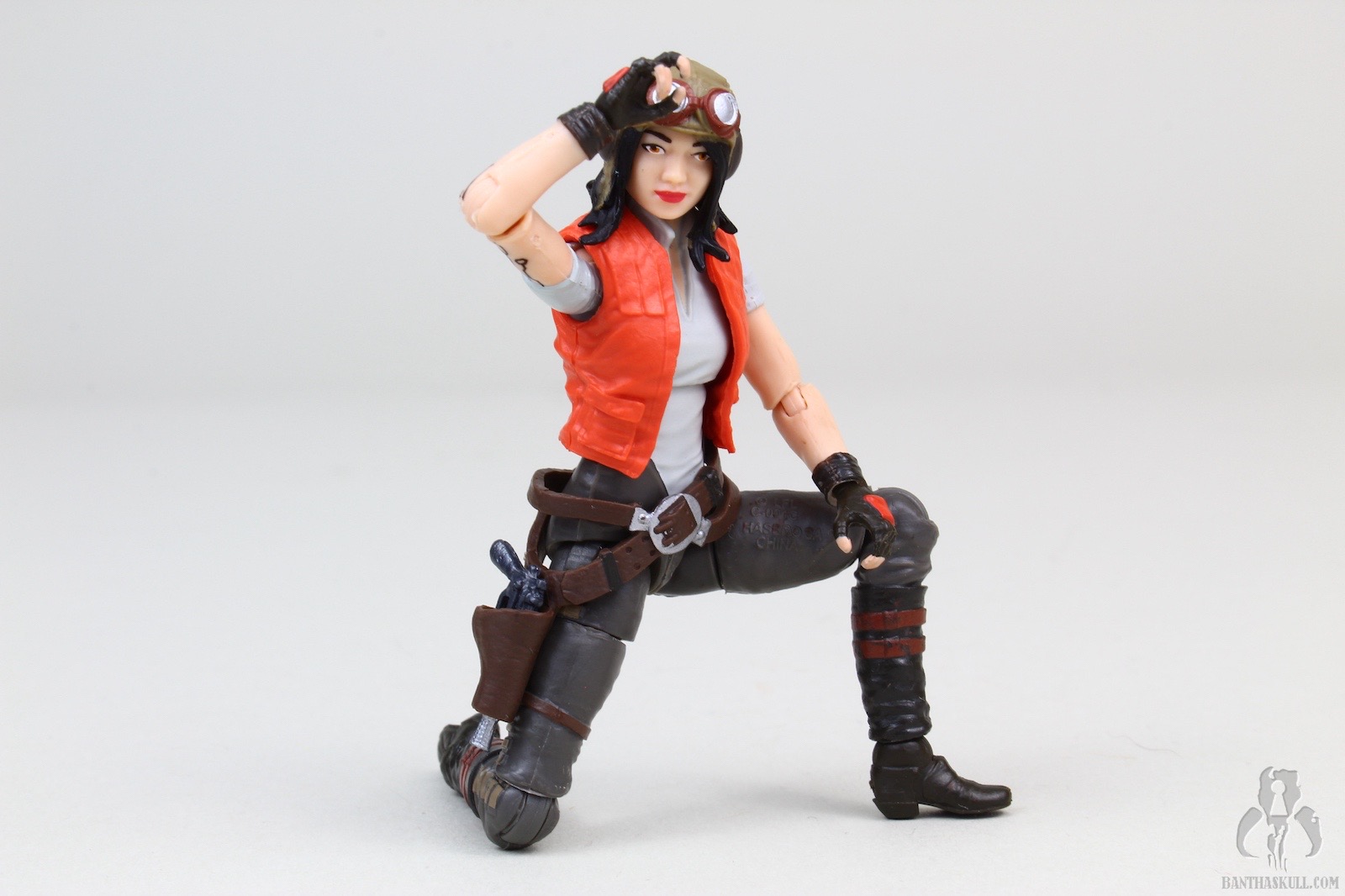 Aphra is an outstanding figure. The sculpt is excellent. It has all the articulation you should expect. The only thing lacking is ball-jointed wrists, but the figure doesn’t scream for them. It is well balanced, and can achieve a variety of advanced positions, including kneeling, leaning, and a THWG (Two-handed weapon grip). The elbow joints are designed to flex a little more than the typical figure, so Aphra can actually put her hands behind her head in a rather natural manner, and her hands even come close to reaching her face so she could be posed to look like she is lifting the goggles off her eyes. The “diaper crotch” is present, but well-disguised under the separately sculpted double-belt/holster combo. This is an outstanding piece that accessorizes the figure. The holster holds the blaster a bit too loosely for my tastes, but it isn’t too bad. Aphra grips the pistol perfectly in her right hand, and the floating index finger fits nicely into the trigger guard. The paint applications are not mind-blowing, but are pretty solid. The striping down the pant legs is a little messy, as are some of the edges elsewhere. Aphra’s face and head sculpt are appealing, although as I am not too familiar with her various incarnations at the hands of the many comic book artists, I can’t say if the result would be a likeness that is satisfying to fans of the character. Likeness aside, the face sculpt and paint are decent, although you do witness the recurring issue that we see where the “lipstick” is applied differently than the sculpt would seem to warrant. The skullcap and goggles are clearly inspired by Flick and that kid who likes the Tin Man: