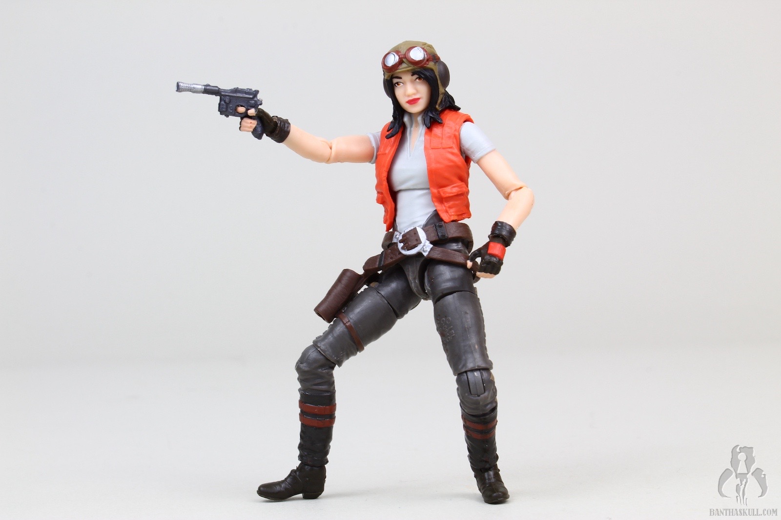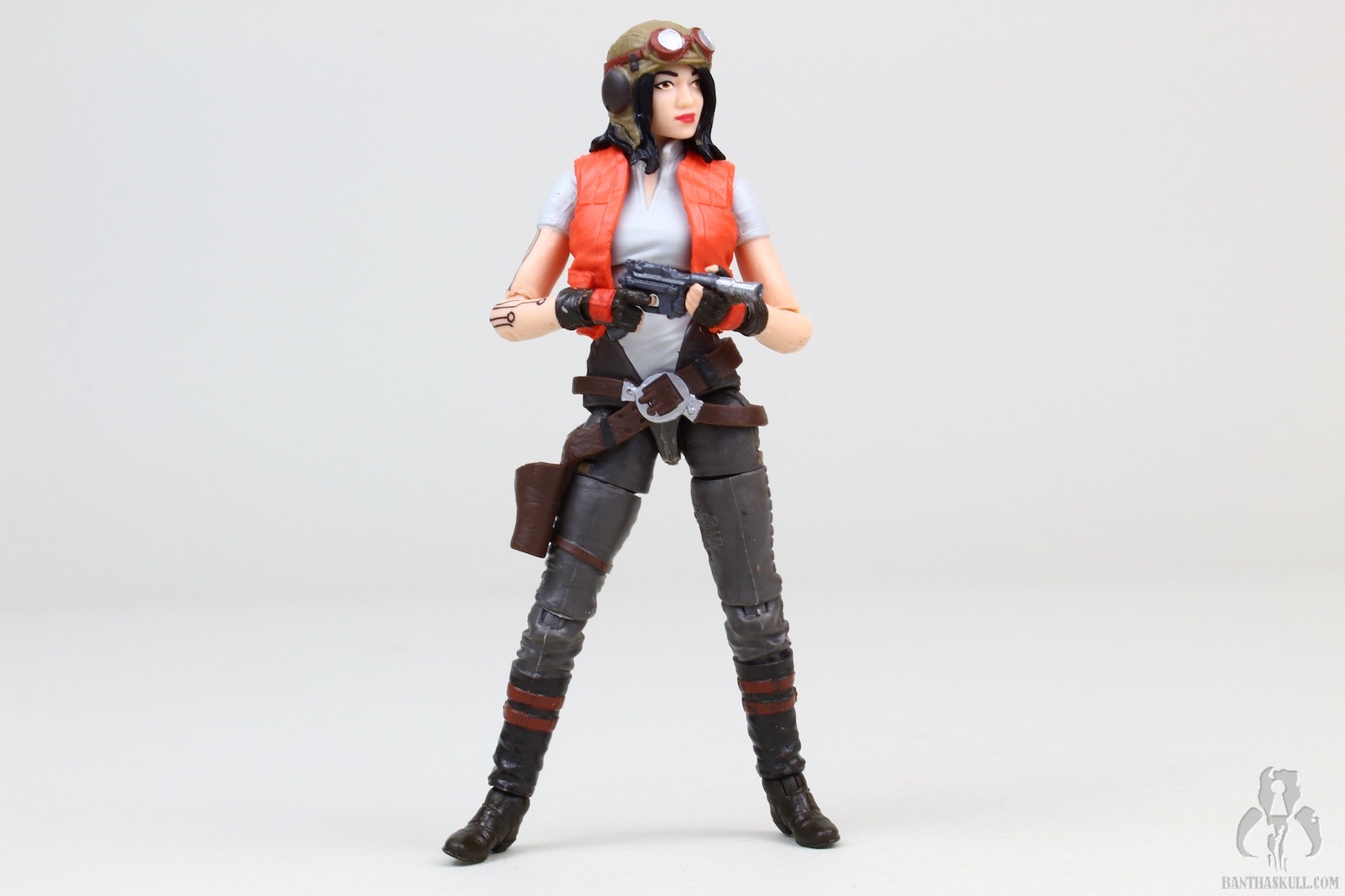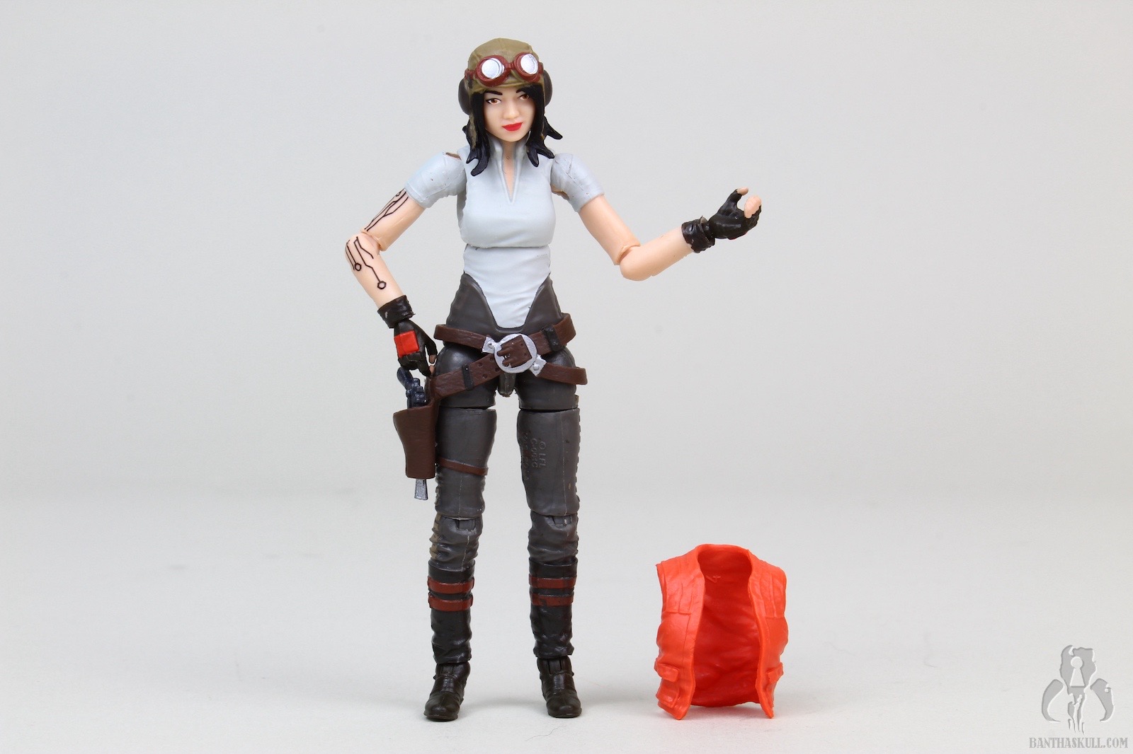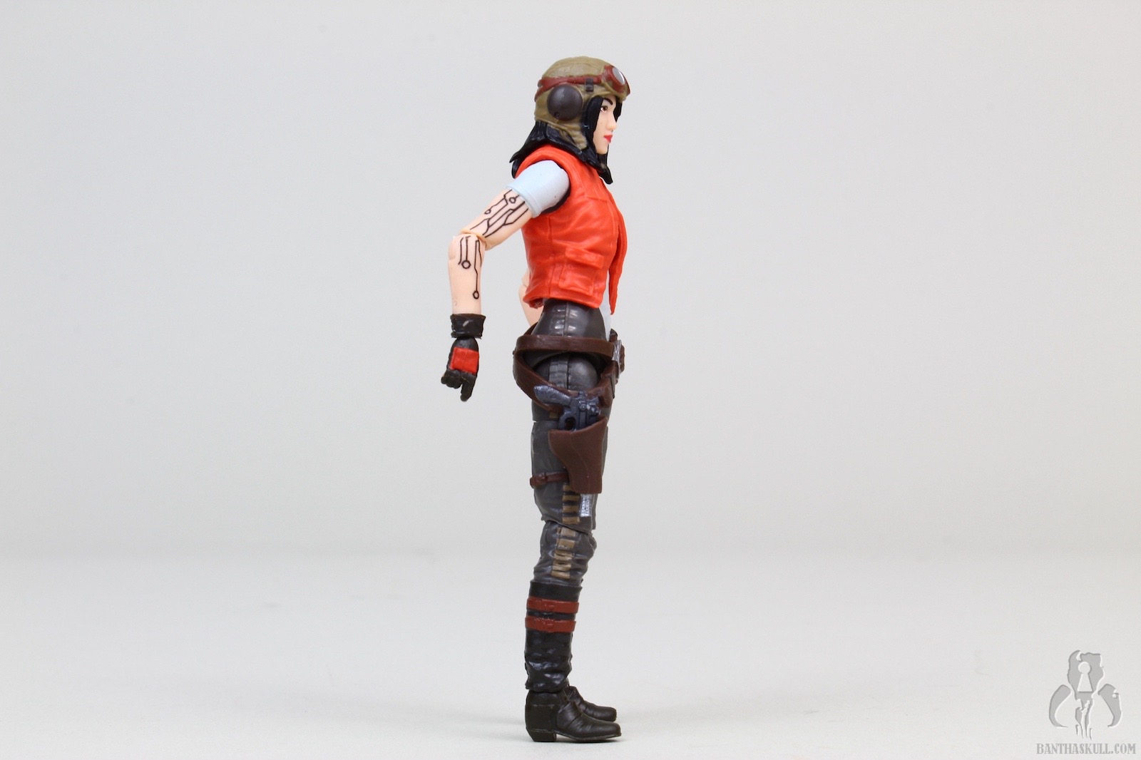 Aphra is an outstanding figure. The sculpt is excellent. It has all the articulation you should expect. The only thing lacking is ball-jointed wrists, but the figure doesn’t scream for them. It is well balanced, and can achieve a variety of advanced positions, including kneeling, leaning, and a THWG (Two-handed weapon grip). The elbow joints are designed to flex a little more than the typical figure, so Aphra can actually put her hands behind her head in a rather natural manner, and her hands even come close to reaching her face so she could be posed to look like she is lifting the goggles off her eyes. The “diaper crotch” is present, but well-disguised under the separately sculpted double-belt/holster combo. This is an outstanding piece that accessorizes the figure. The holster holds the blaster a bit too loosely for my tastes, but it isn’t too bad. Aphra grips the pistol perfectly in her right hand, and the floating index finger fits nicely into the trigger guard. The paint applications are not mind-blowing, but are pretty solid. The striping down the pant legs is a little messy, as are some of the edges elsewhere. Aphra’s face and head sculpt are appealing, although as I am not too familiar with her various incarnations at the hands of the many comic book artists, I can’t say if the result would be a likeness that is satisfying to fans of the character. Likeness aside, the face sculpt and paint are decent, although you do witness the recurring issue that we see where the “lipstick” is applied differently than the sculpt would seem to warrant. The skullcap and goggles are clearly inspired by Flick and that kid who likes the Tin Man: