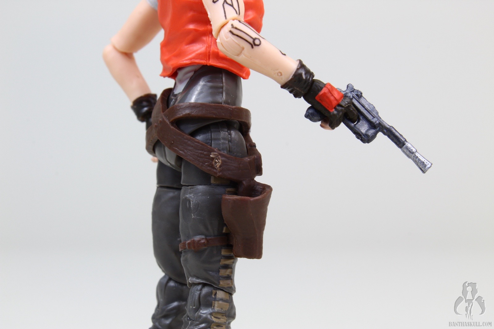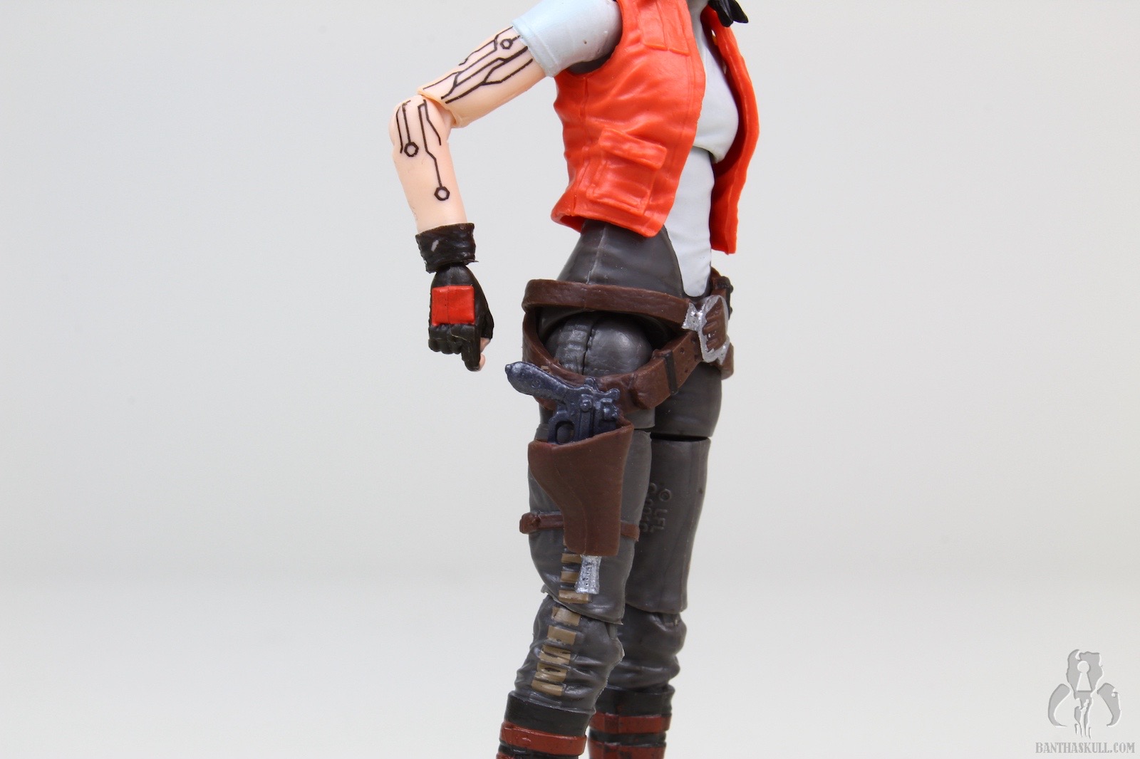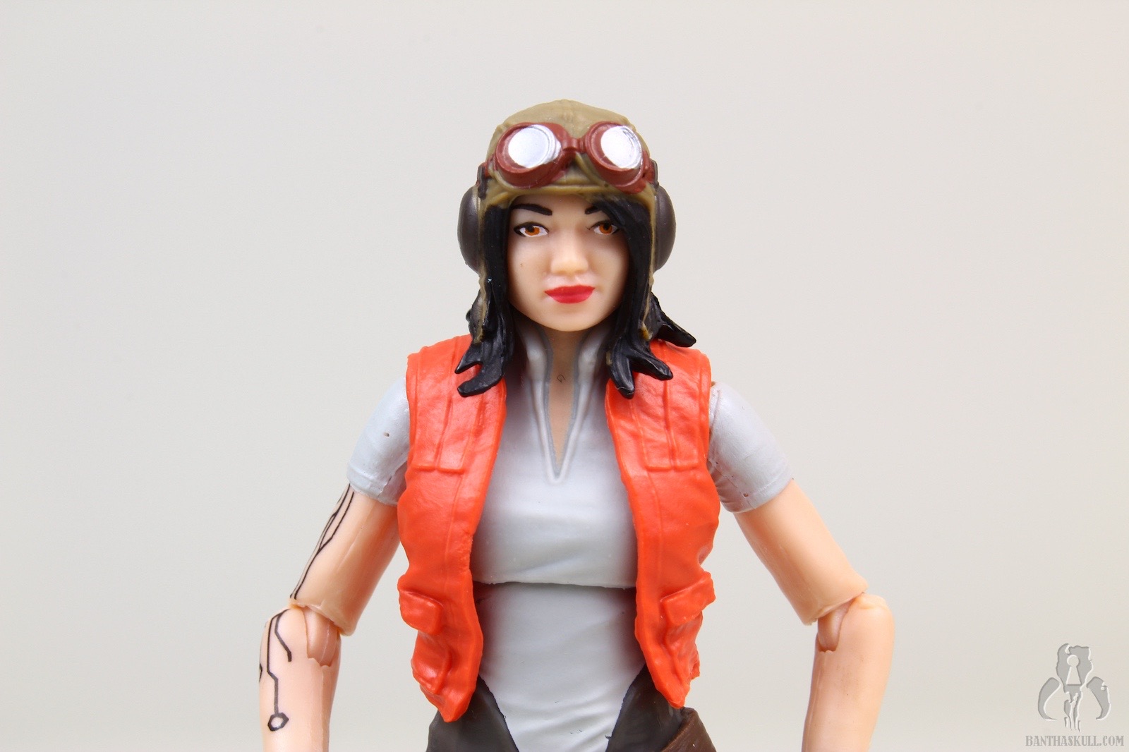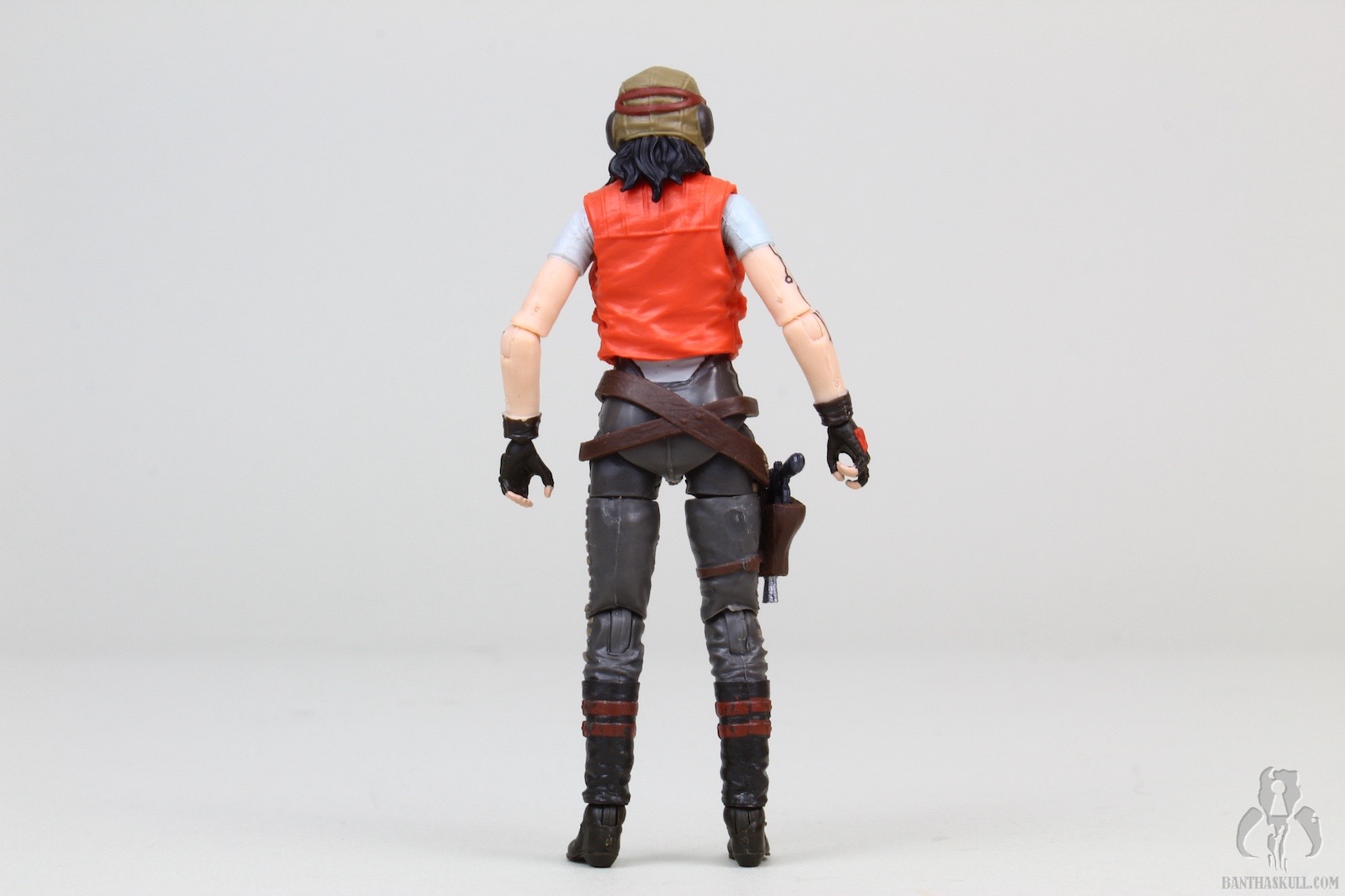 Aphra is an outstanding figure. The sculpt is excellent. It has all the articulation you should expect. The only thing lacking is ball-jointed wrists, but the figure doesn’t scream for them. It is well balanced, and can achieve a variety of advanced positions, including kneeling, leaning, and a THWG (Two-handed weapon grip). The elbow joints are designed to flex a little more than the typical figure, so Aphra can actually put her hands behind her head in a rather natural manner, and her hands even come close to reaching her face so she could be posed to look like she is lifting the goggles off her eyes. The “diaper crotch” is present, but well-disguised under the separately sculpted double-belt/holster combo. This is an outstanding piece that accessorizes the figure. The holster holds the blaster a bit too loosely for my tastes, but it isn’t too bad. Aphra grips the pistol perfectly in her right hand, and the floating index finger fits nicely into the trigger guard. The paint applications are not mind-blowing, but are pretty solid. The striping down the pant legs is a little messy, as are some of the edges elsewhere. Aphra’s face and head sculpt are appealing, although as I am not too familiar with her various incarnations at the hands of the many comic book artists, I can’t say if the result would be a likeness that is satisfying to fans of the character. Likeness aside, the face sculpt and paint are decent, although you do witness the recurring issue that we see where the “lipstick” is applied differently than the sculpt would seem to warrant. The skullcap and goggles are clearly inspired by Flick and that kid who likes the Tin Man: