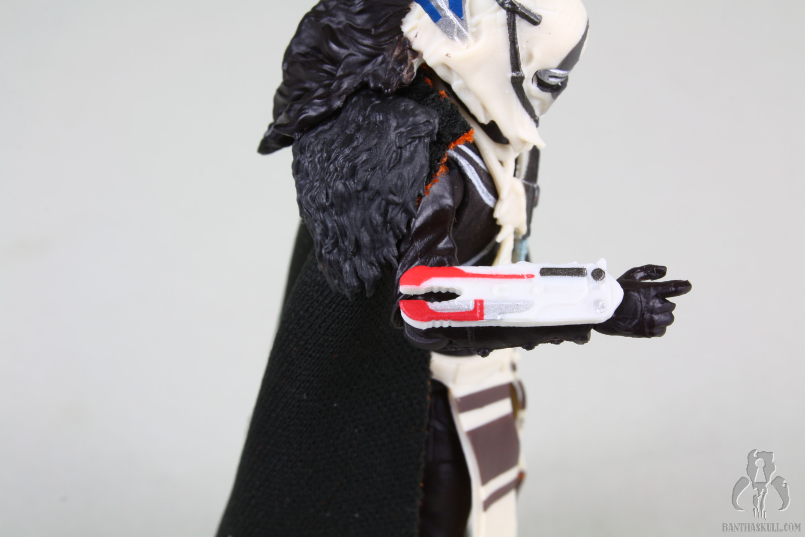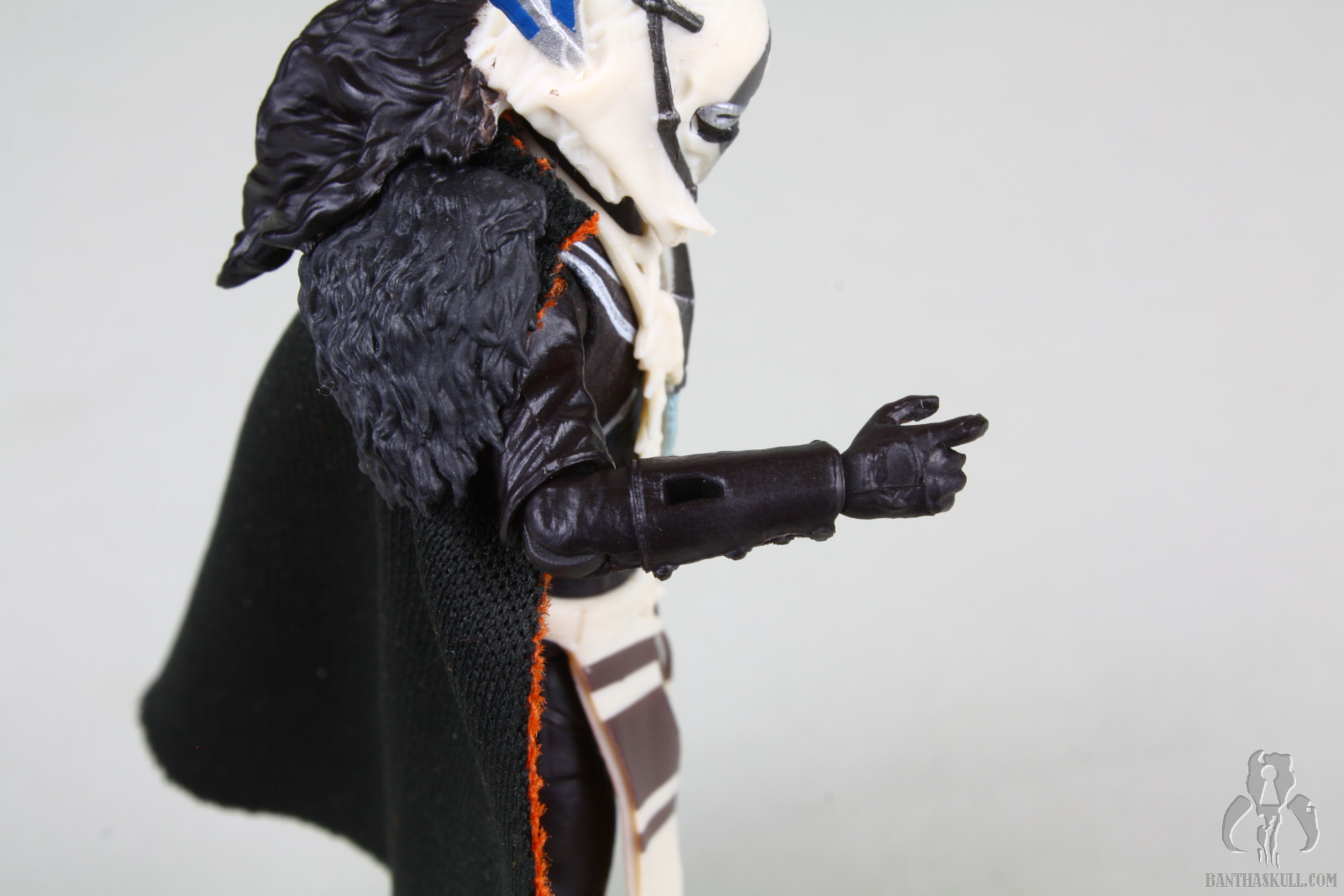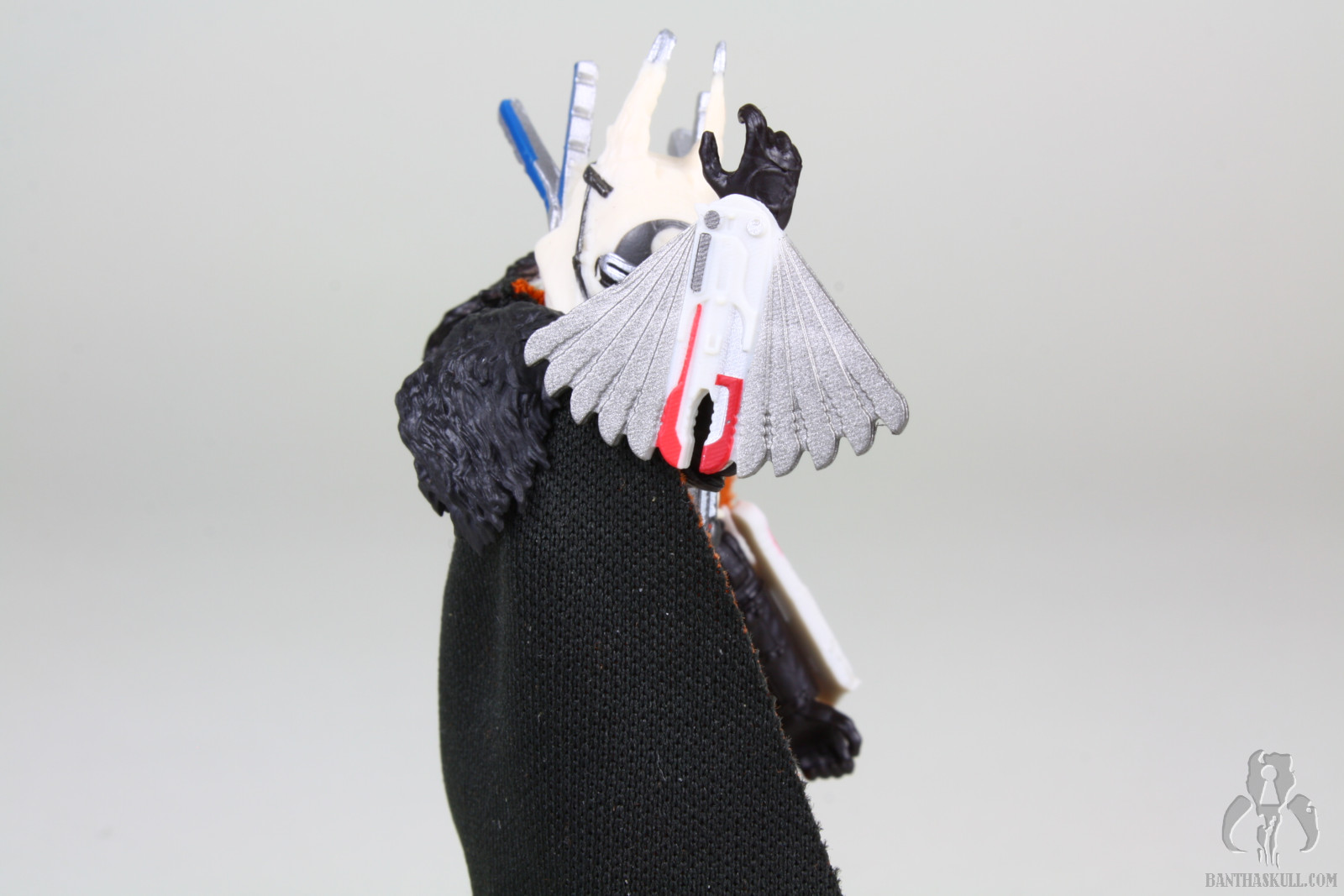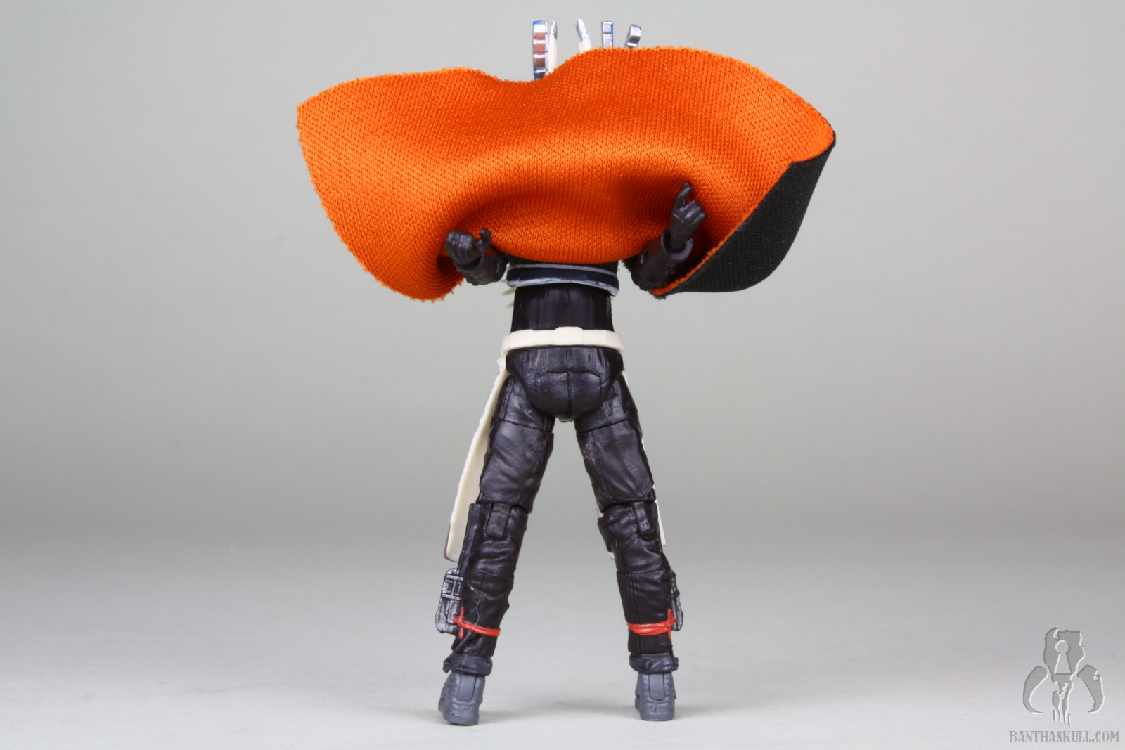 Some people have pointed out that the 5POA Enfys Nest has more paint applications on the head. You can see that in the final picture above, but that’s just it. It has more. My beloved and sainted New England Patriots had more wins than the loathsome New York Jerk Faces Giants in 2007. How did that work out for me? Spoiler alert: NOT WELL. The number of paint applications doesn’t matter as much as the accuracy and appearance. As you can see from the inset left, Enfys has a very subtle Aurebesh inscription on the top of the helmet. This is what the 5POA figure was trying to capture, but did it with the subtly of an air horn. The TVC figure would have definitely benefited from some carefully applied paint apps and a dirty wash on the helmet, but given the two alternatives, I prefer no paint application over the overly done paint application of the 5POA figure. The 5POA figure also has the tusks on the helmet painted. That is wrong. In addition to the articulation, another way the TVC figure is elevated over its 5POA counterpart is with the cape. The 5POA figure as a solid black cape whereas the TVC figure has an orange liner. It’s pretty neat and really pops.