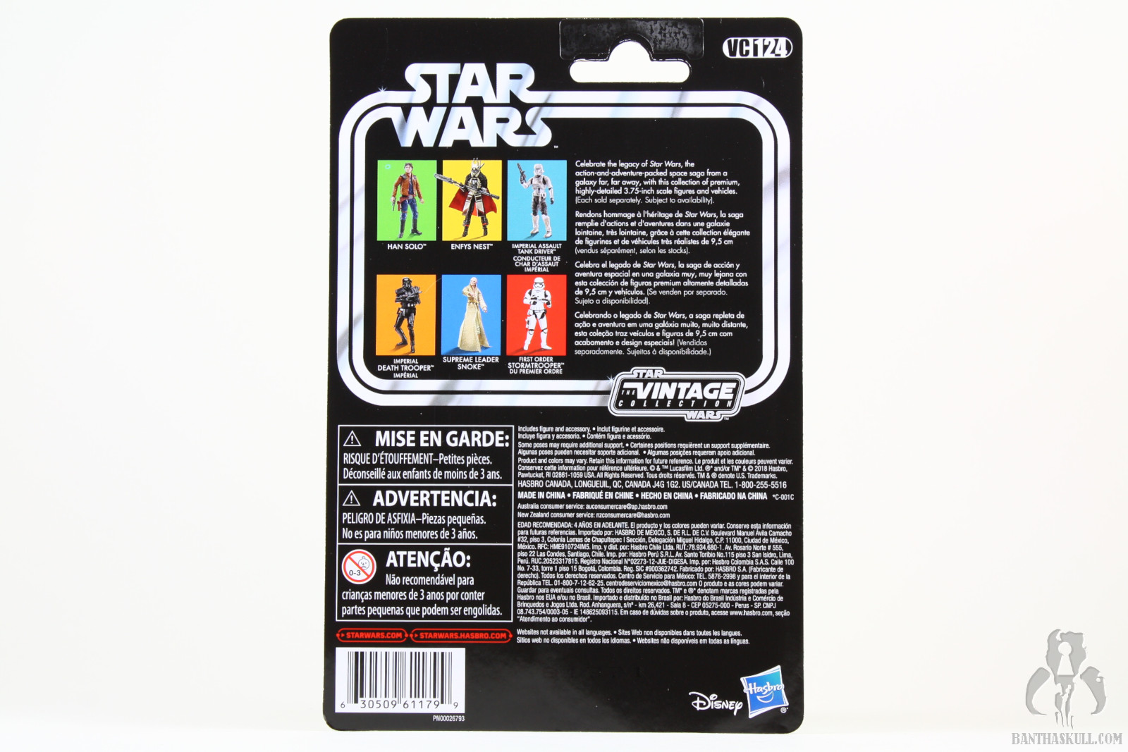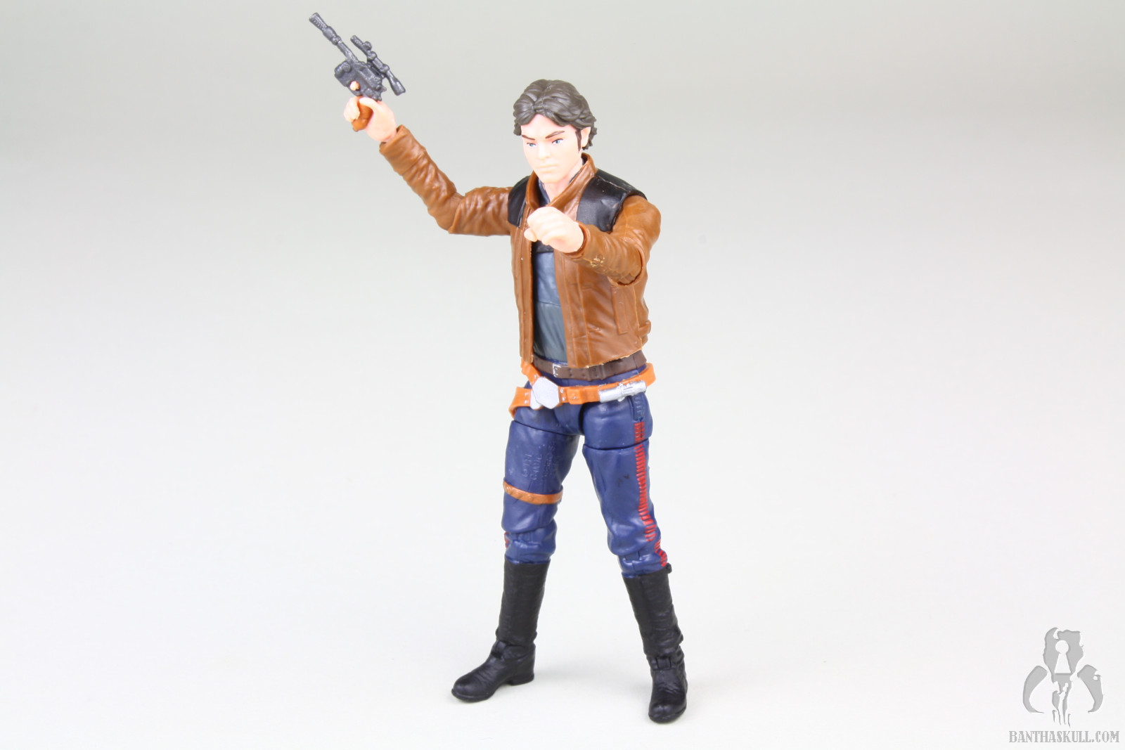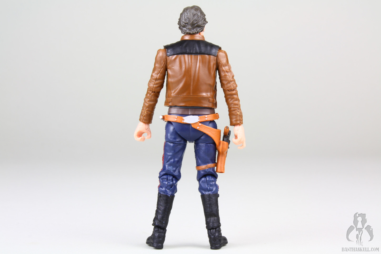 The lower body has all the modern articulation you’d come to expect. I found the ball jointed hips a little difficult to work with when trying to rotate the legs backwards. It can be done, but this isn’t one of those figures that easily flows form one action pose to the next. After years of complaining about mismatch joints, Hasbro listened and the hip ball joint is cast in the same exact blue as the rest of the lower body…except that the joint represents the continuation of the blood stripe from the rest of the pants. As as result, the stripe prematurely ends at the lower hip. Previous Han Solo figures moved the stripe off center to account for the hip articulation. I’ll accept this compromise. If Hasbro cast the joint in red, it would have been have been glaring in other areas. It Hasbro continued the paint application onto the joint, it would have worn off as the joint was engaged. It is what it is. The figure interacts well with the included DL-44 blaster which has a painted grip. The figure’s trigger finger easily slips into the trigger guard. Additionally the scope appears to be the correct length for the one used in the movie (because in the obsessive compulsive nerd world, this matters). I land this figure at a 9 out of 10. It would be a perfect 10 if the lower body were easier to pose.