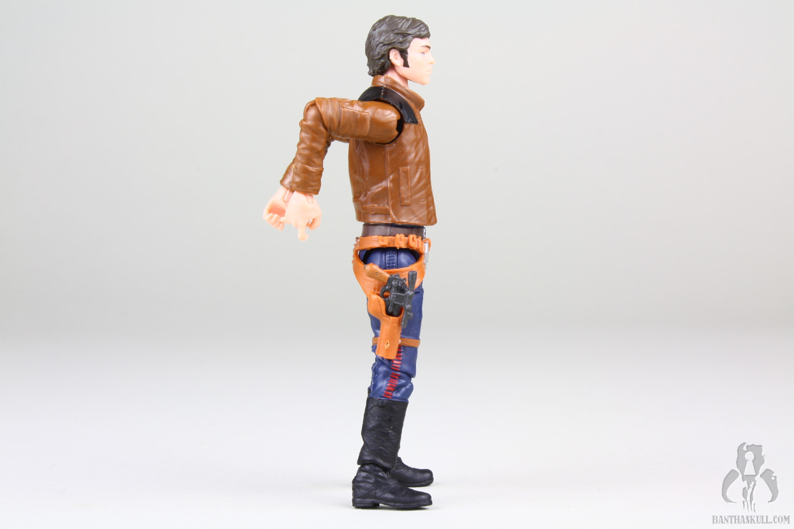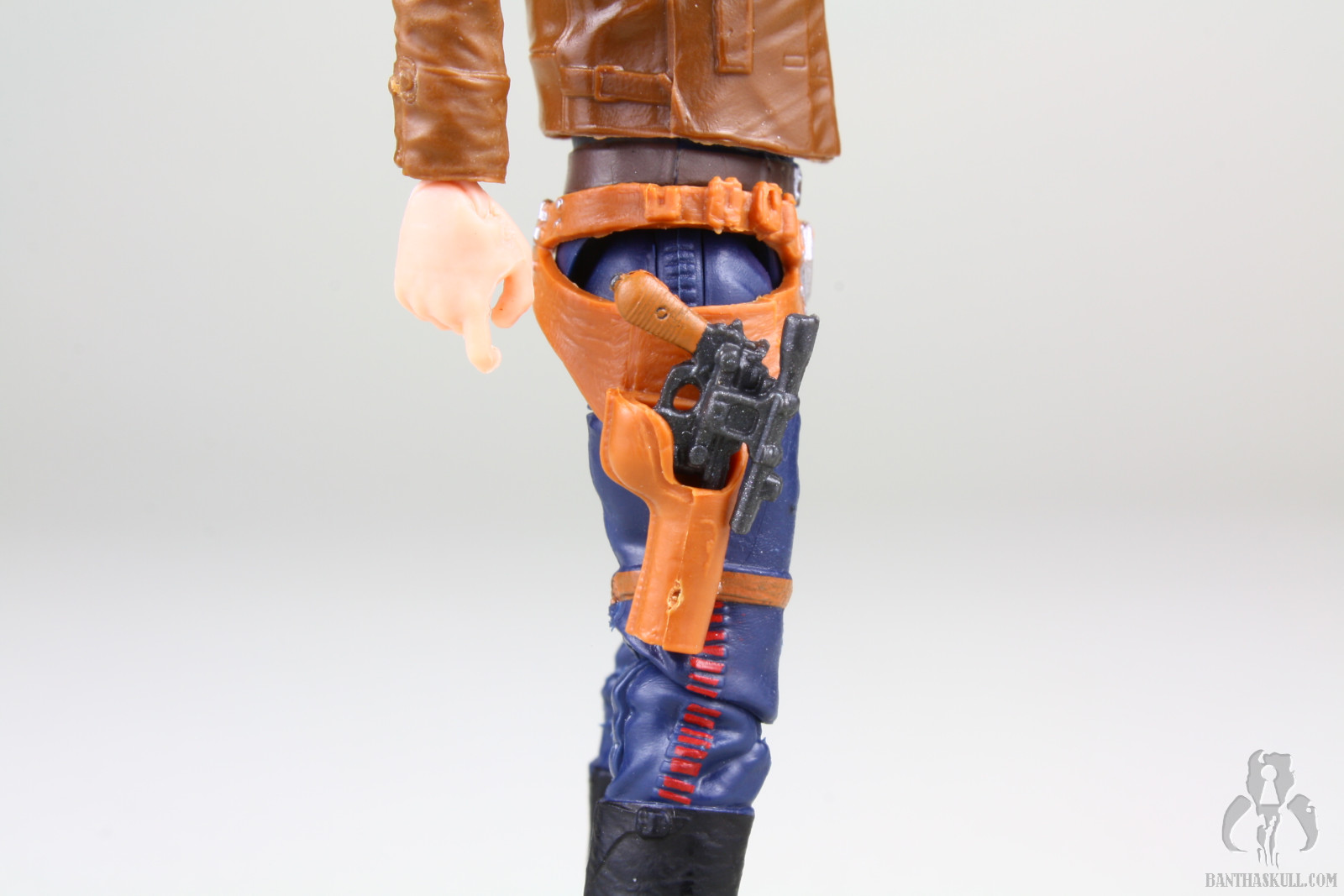 Moving on from my obsession with the gun belt, we’re left with a figure that is aesthetically off the charts. In the looks department, I think Fat Amy’s evaluation says it best. The mad chemical scientists who run the plastics world have zeroed in on the highest and best use of their genius: action figures. Ten years ago, these gun belts were so thick (presumably to avoid breakage) that the action figure had to be sculpted with the equivalent of a fifteen inch waist. That terrible VOTC Han Solo figure that you all think is so fantastic looks like it’s suffering from some sort of wasting disease. Thanks to the proportional thickness of this figure’s gun belt, young Han Solo actually looks like a real human being. Where aesthetics and articulation meet, I’m thrilled that the ball jointed wrists allow the figure to realistically grasp the gun belt which is an iconic pose for Han Solo as seen in the last photo.