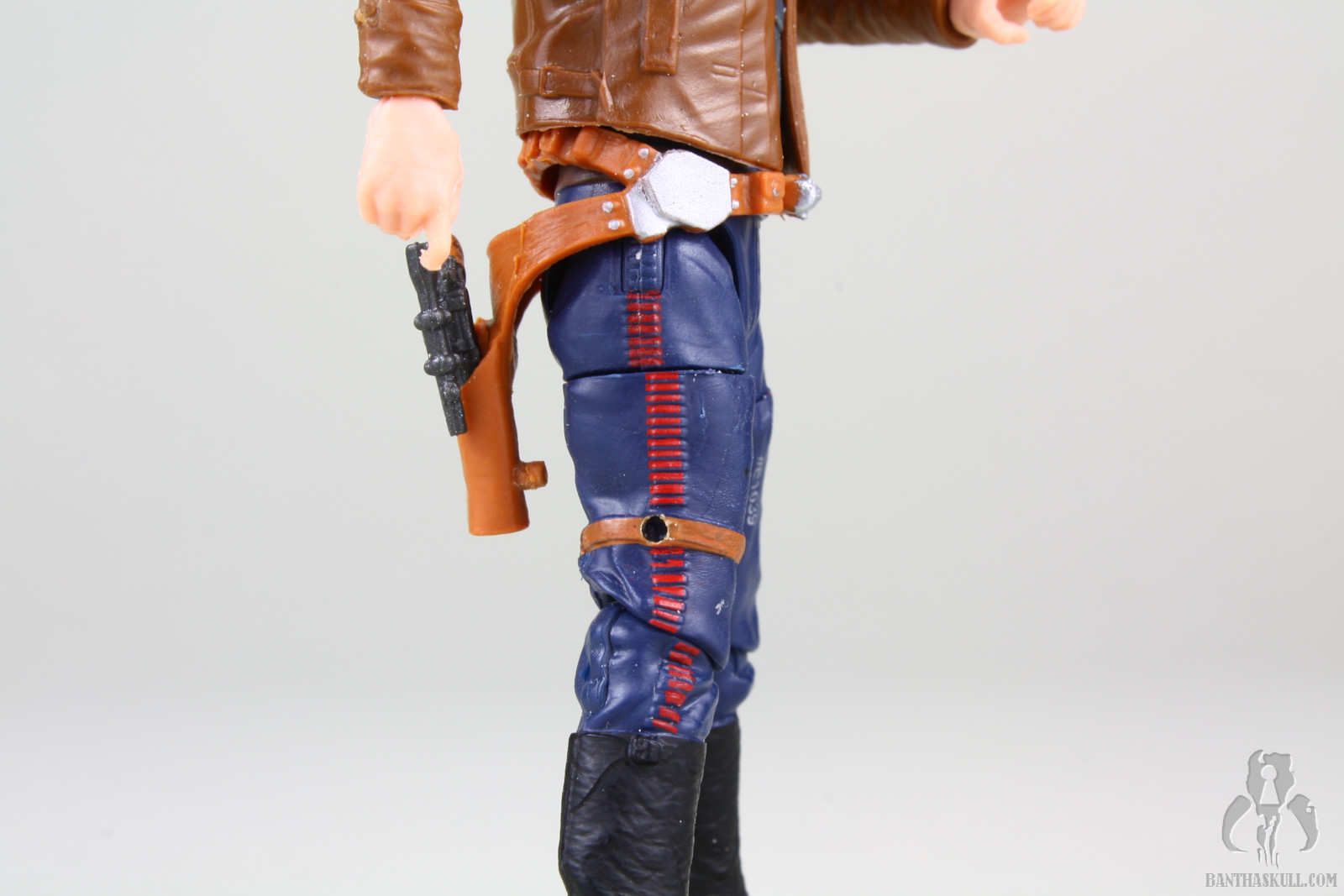 If you want a figure that balances form and function, you’re going to have to work at it, and I blame YOU. I was fine with floating holsters despite their lack of screen accuracy. Solo’s gun belt secures the lower end of the holster to his thigh via a strap. Replicating this on a figure presents an obvious problem: It limits the range of motion of the legs. For that reason, Hasbro has often opted to give the illusion of a strapped holster with the strap painted and some times sculpted onto the figure’s thigh, but the holster floats free. I feel this is an acceptable compromise, but you agitators wouldn’t let it go. Hasbro listened and offered a hybrid solution that combines both aspects. The strap is sculpted onto the thigh, but the bottom of the holster plugs into it. When you need more range of motion at the legs, you unplug the holster, but I’m going to warn you. The amount of force required to free the holster the first time is going to inflame the customization-phobia some of us have. It took a long time before I convinced myself this was the design and that the holster wasn’t permanently affixed to thigh. After you free that “stickiness” form the manufacturing process, it goes much more smoothly.