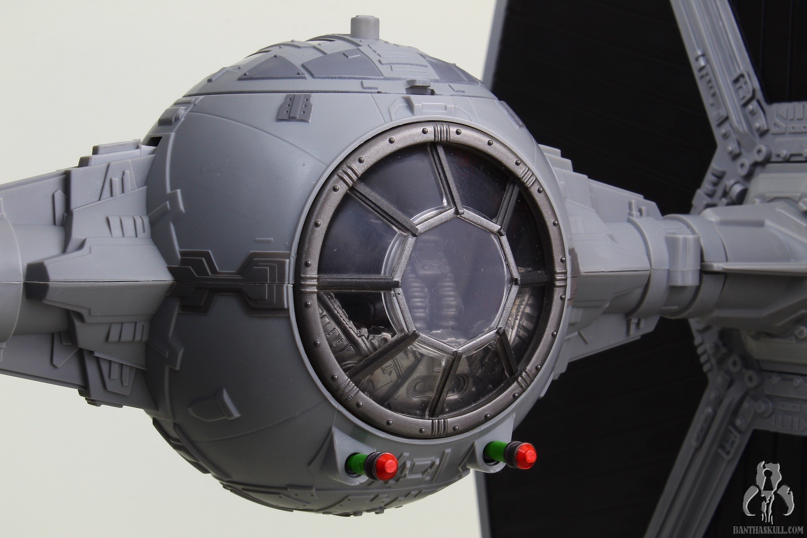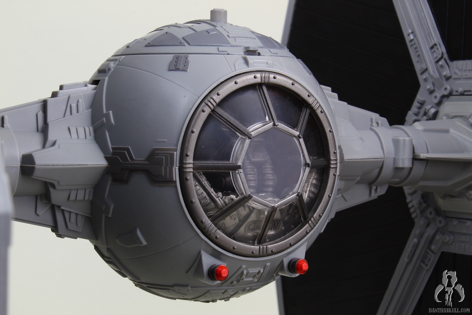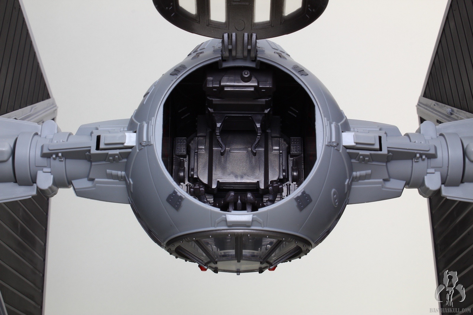 The TIE is excellent, a rehash of the most recently offered Big Wing TIE, but in a slightly different color scheme. Yes, that’s right, it’s a different gray! By my count, we now have TIE Fighters from Hasbro in 49 shades of gray. One more color variant, and we have a real problem on our hands. The ship itself has all the same features you’ve seen a million times before: pop off wings, extendable cannons, windowed top hatch, and a removable ejector seat covered in soft Corinthian leather. Personally, I’m okay if Hasbro ditches the pop off wings going forward. I just feel there’s too much risk to the spring going bad, and the wings either pop off at the slightest provocation, or they don’t stay connected. My sample is fine so far in that regard, but I think a more firm locking fit and elimination of the ejector buttons would make this a sturdier vehicle. The panels are nice and solid. Gone is the rubber plastic we’ve seen recently with FO TIE releases. No warping here (yet) which is surprising given the fairly flimsy interior packaging. I guess they did just enough to keep the panels from bounding around, and there are no wires or twist ties that force the panels to bend unnecessarily.