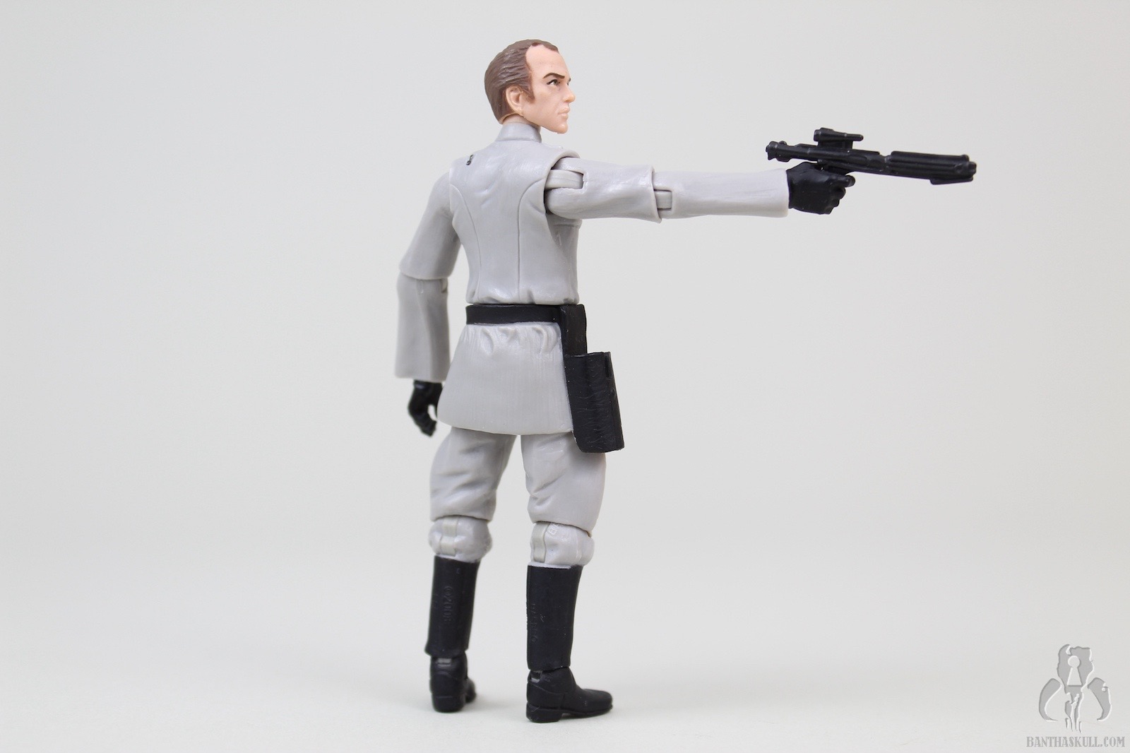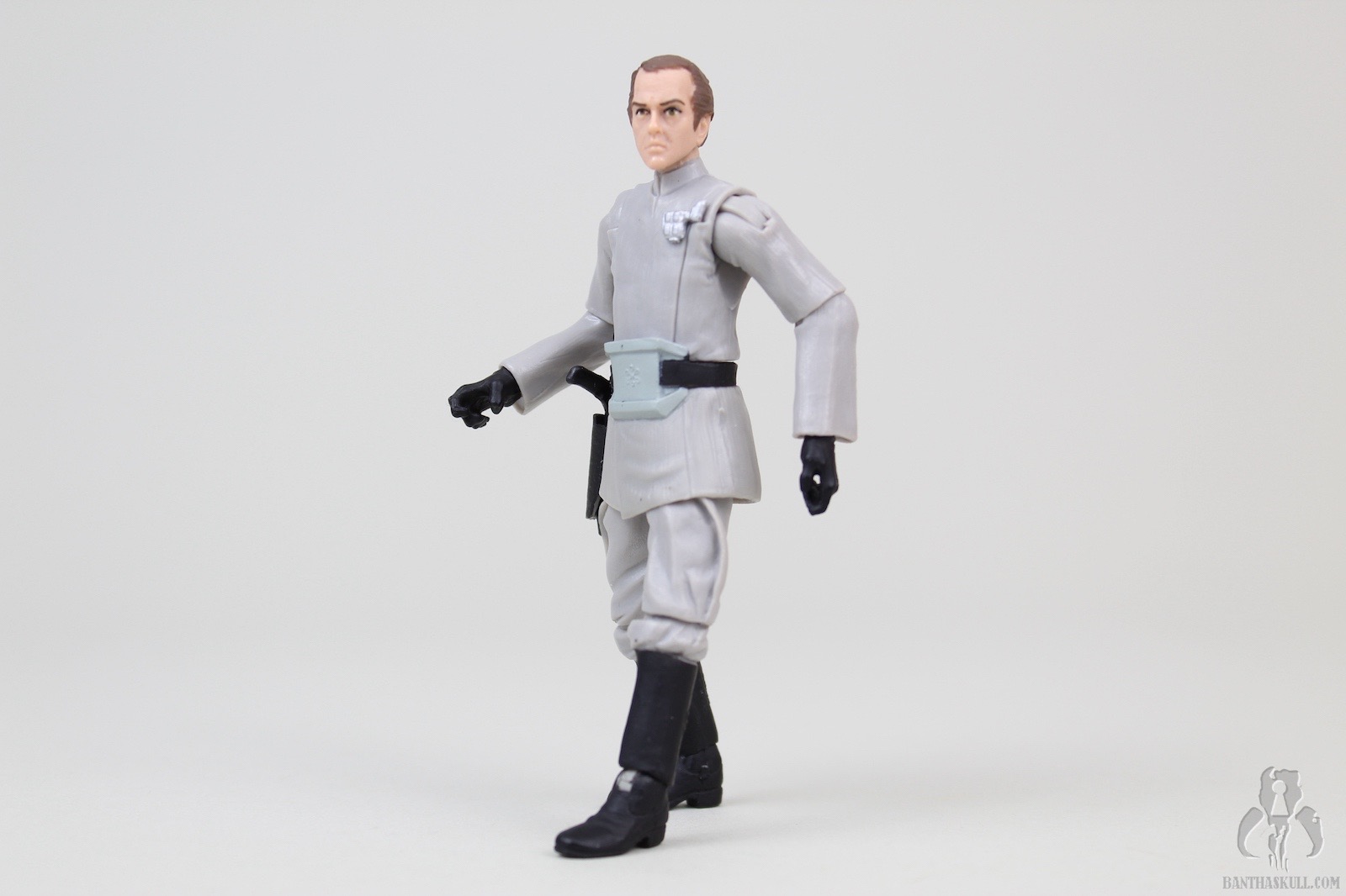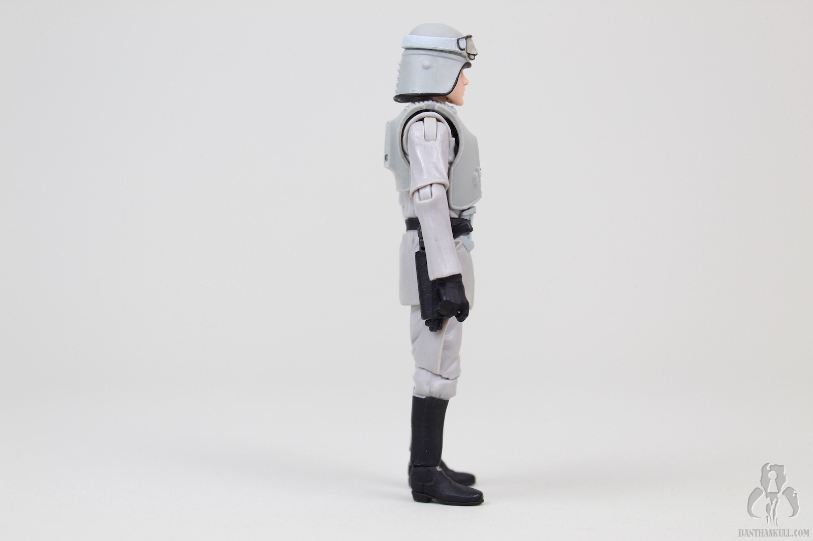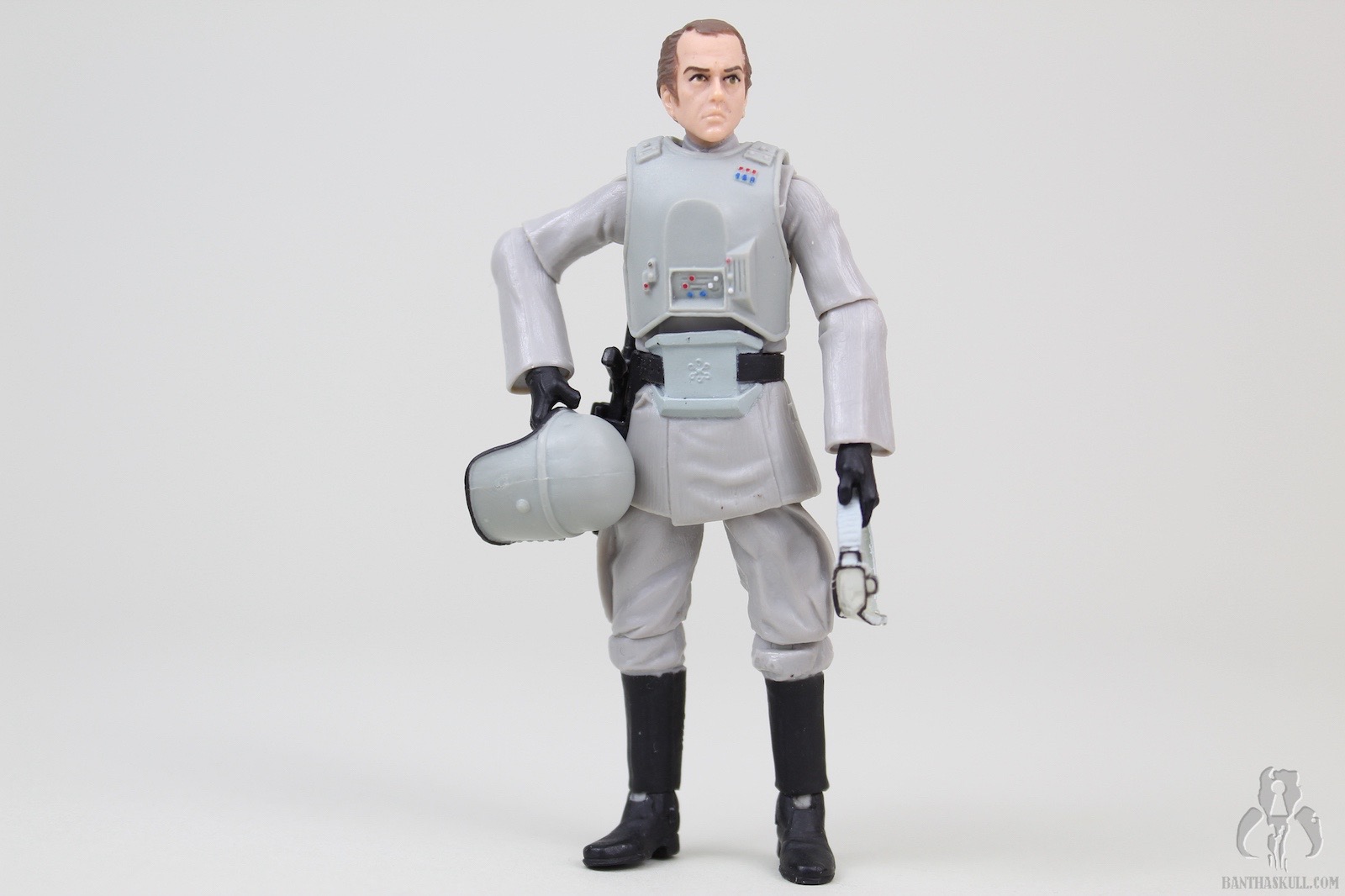 The body sculpt is excellent, with articulation that far exceeds that of Veers. The removable body armor is nice. It is front and back, which is better than Veers, however, this guy’s giant “belt buckle” is not removable. When he’s in standard officer mode, the belt and buckle stand out in a silly way, so this should be removable.