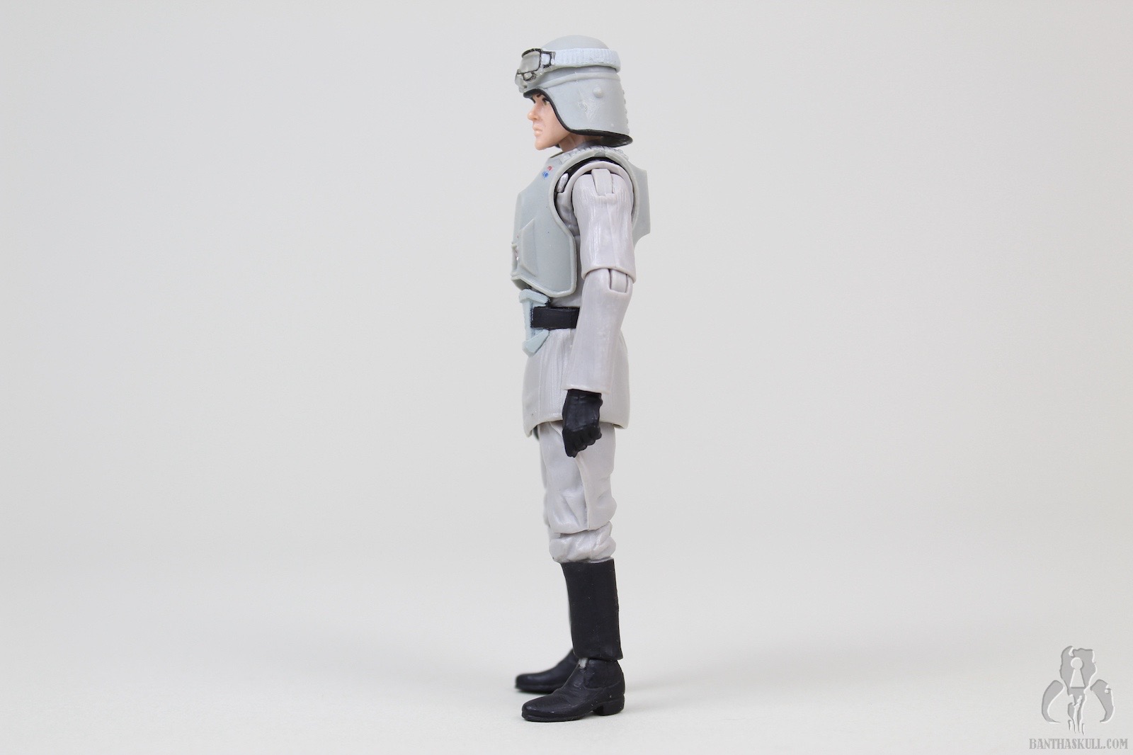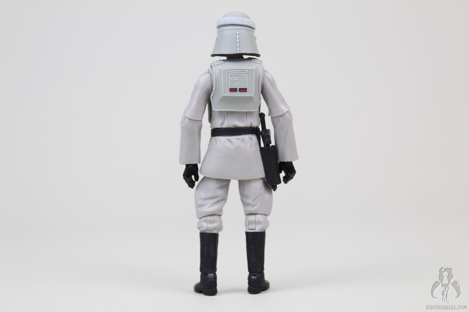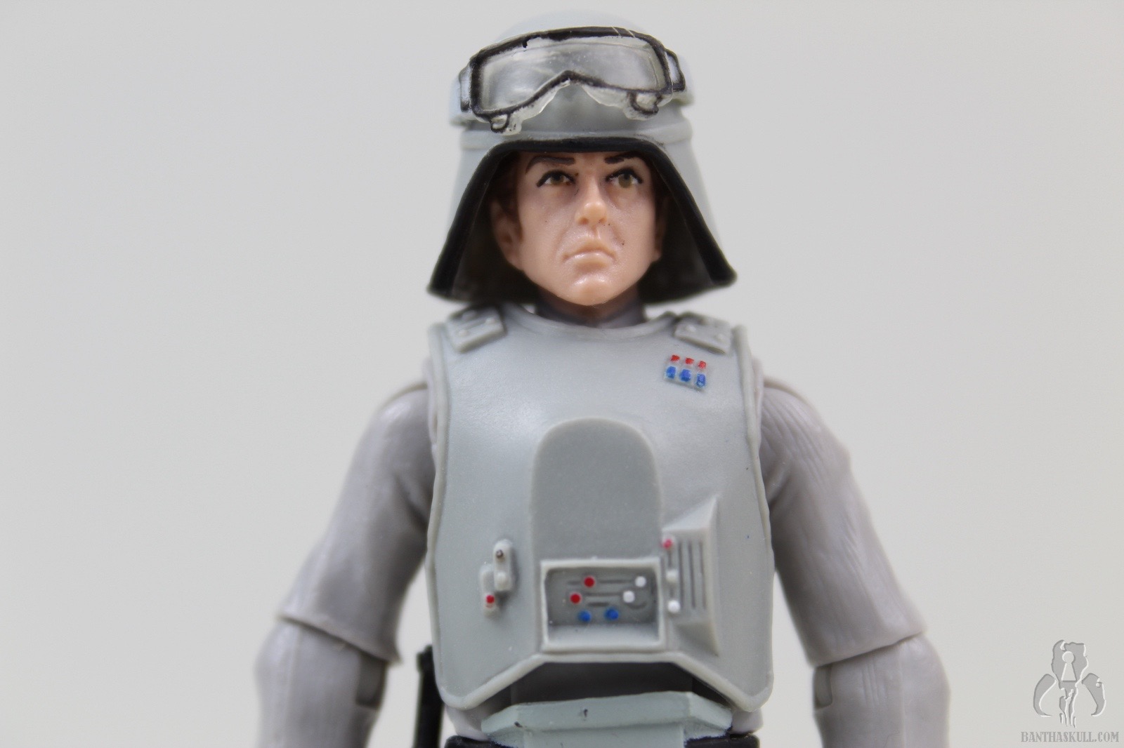 The paint applications are pretty good. There is some random bits of stray paint on the face, which I attribute to being specific to my sample. The armor has 3 red/blue pips, indicating an officer with a rank below that of General Veers’ 4 red/blue pips. He’s probably a colonel, although Wookieepedia’s (Legends) article isn’t that clear on this. The tunic under the armor has a silver insignia (not red/blue), so Hasbro missed this. On the subject of paint, the ankle joints are gray, and therefore show through the black boots, which is annoying. The figure also has black gloves, so in order to complete the standard officer look, there would need to be switch out bare hands.