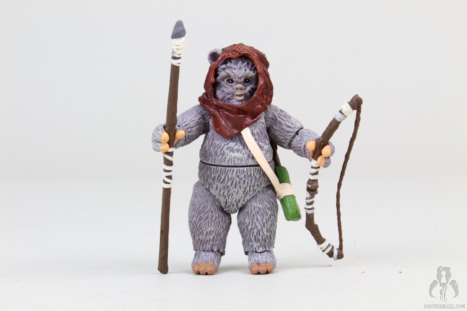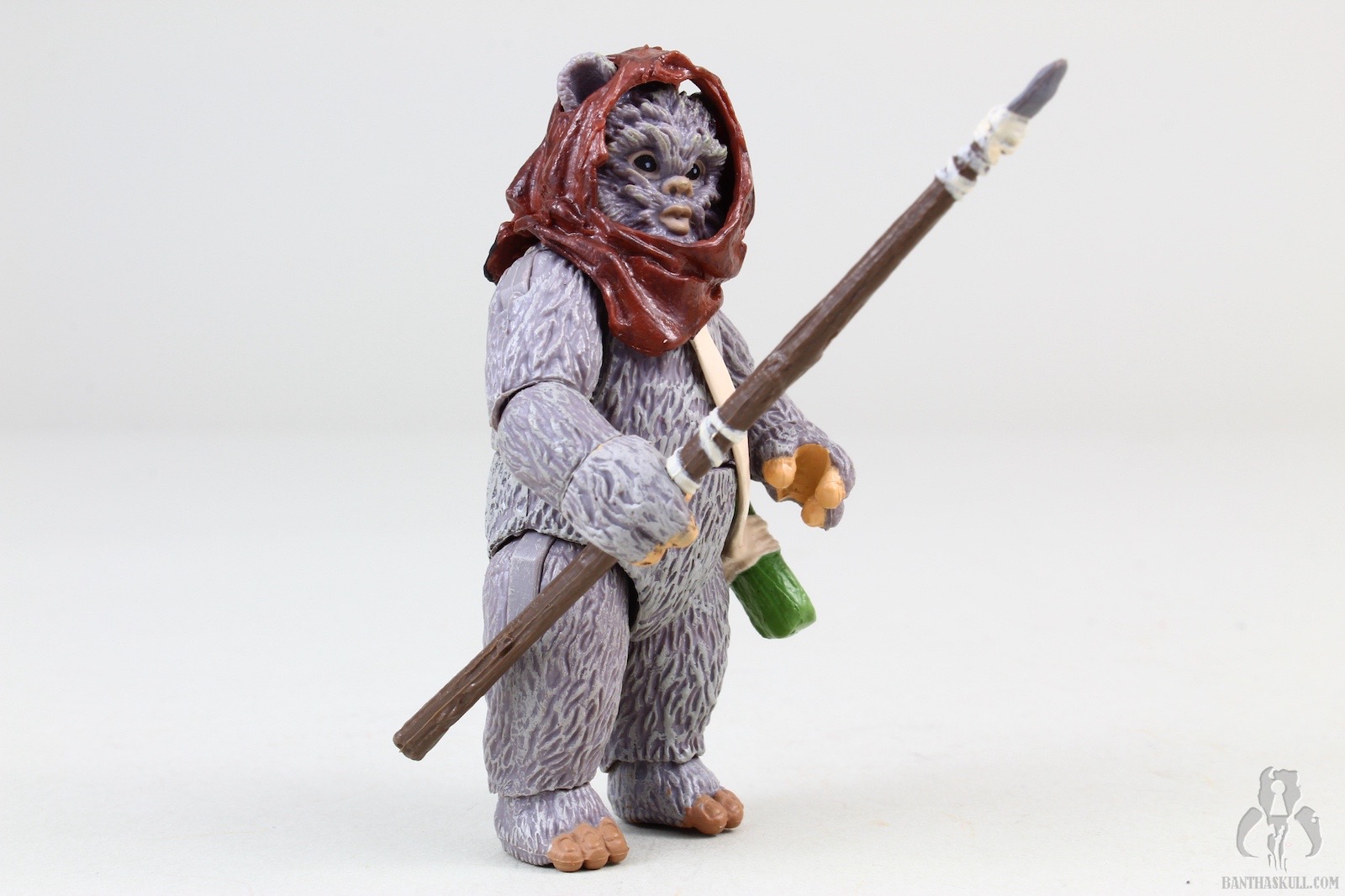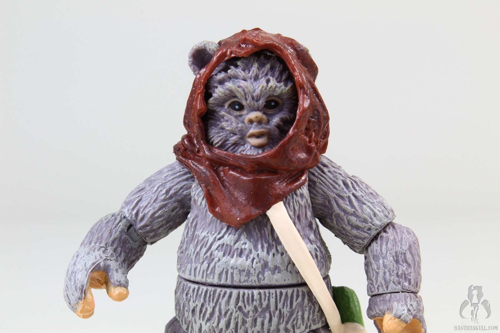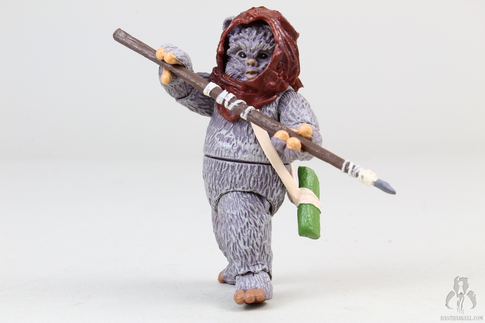 Lumat comes with removable hood/sling, which is attached to a pouch to hold 3 tiny arrows. They fit nicely into the pouch, but you should be careful with these so you don’t misplace any them, which would probably cause even a normally level-headed person to put their fist through a wall. The bow is nicely sculpted, with painted wrappings. The string is thin and flexible, and I don’t get the impression it will break under normal curcumstances. There’s a little notch in the front of the bow so that one of the arrows can clip into it, giving it a more realistic, ready-to-fire appearance. This is pretty awesome. Lumat, stubby arms and all, can actually perform a THWG with the bow. Chris stated that he couldn’t get Lumat into a meaningful shooting pose. I was able to get something close enough to it for the over-the-shoulder shot (with the stormtrooper) in the gallery above, but it’s not perfect. I think the short arms would make a perfect aiming pose very difficult, and I’m satisfied with how it came out. Lumat also comes with a spear, which he can wield with one or two hands, in a variety of casual or aggressive positions. The whole thing is done very well.
