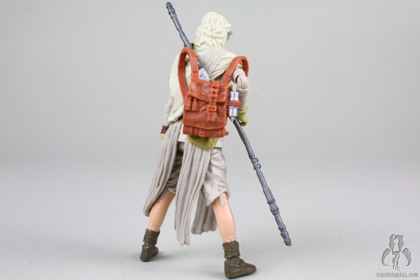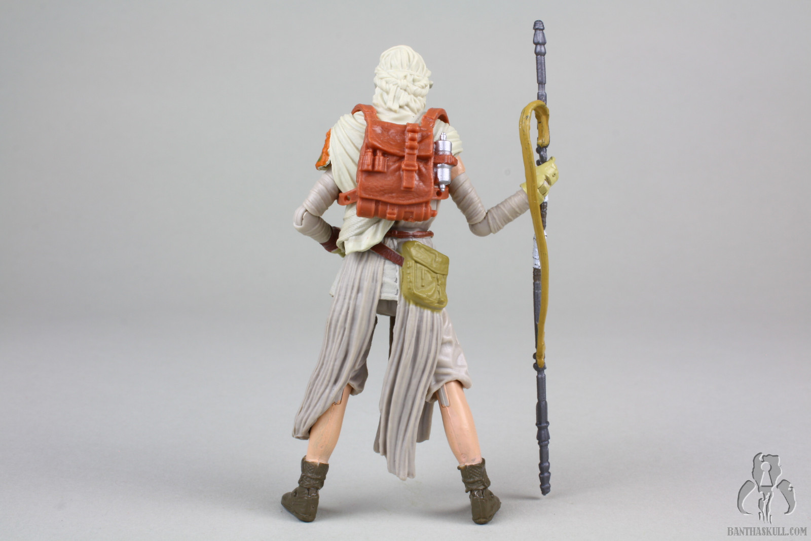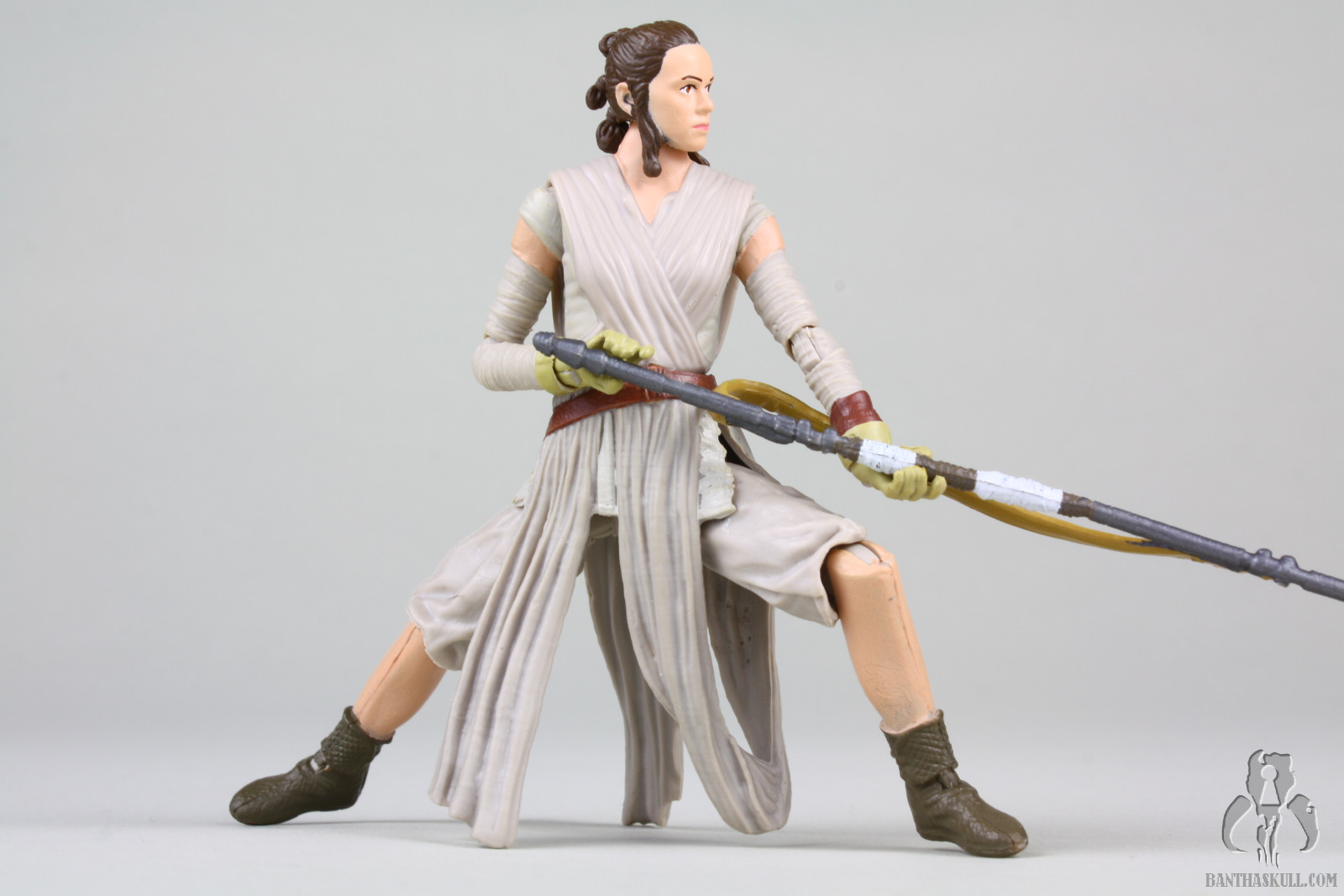 This Jakku Rey figure, which is a re-release of Black Series Rey, is another figure from the “big hits combined with narrow misses” category. The pose-ability has amazing potential. The small ball joints at the elbows give the arms tremendous range of motion, and the ball jointed wrist allow figure to grasp the staff in some dynamic combat poses. If you’ve learned one thing from my reviews, I hope you’ve picked up on the fact that I love figures that can strike natural and aggressive dueling poses, and this is one can.