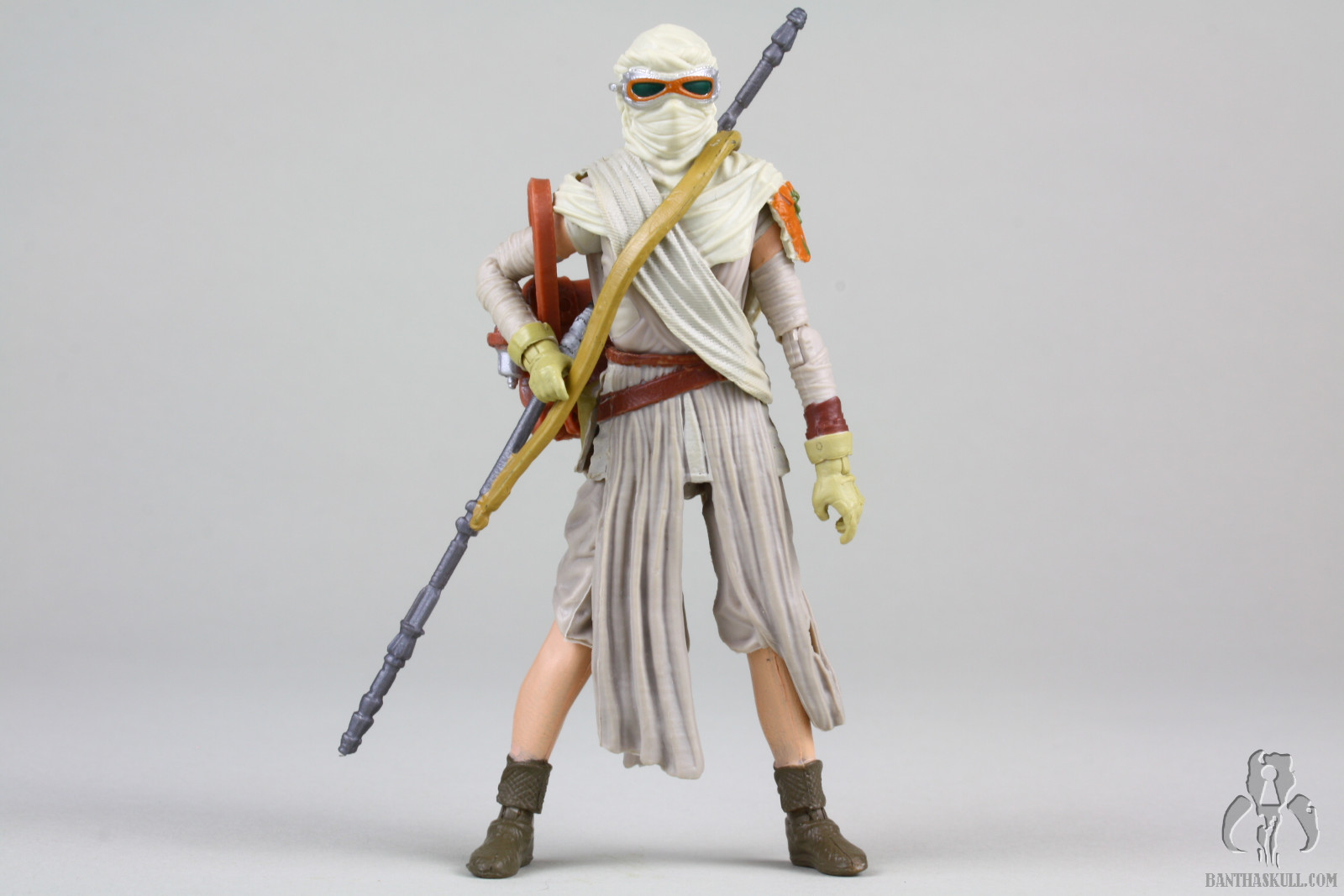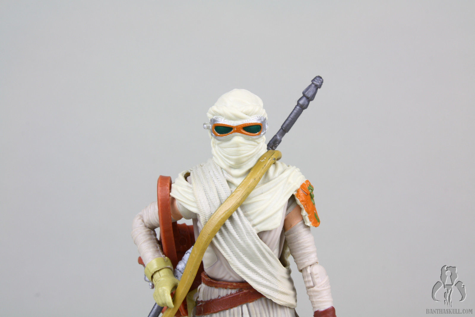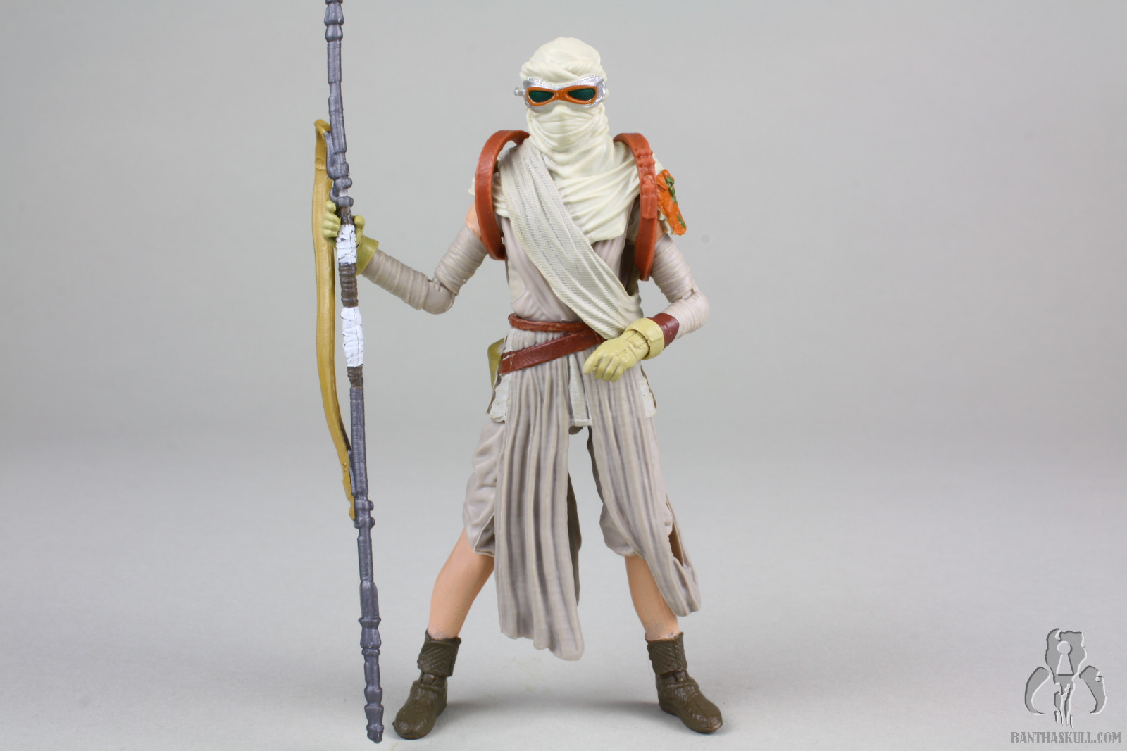 This Jakku Rey figure, which is a re-release of Black Series Rey, is another figure from the “big hits combined with narrow misses” category. The pose-ability has amazing potential. The small ball joints at the elbows give the arms tremendous range of motion, and the ball jointed wrist allow figure to grasp the staff in some dynamic combat poses. If you’ve learned one thing from my reviews, I hope you’ve picked up on the fact that I love figures that can strike natural and aggressive dueling poses, and this is one can.