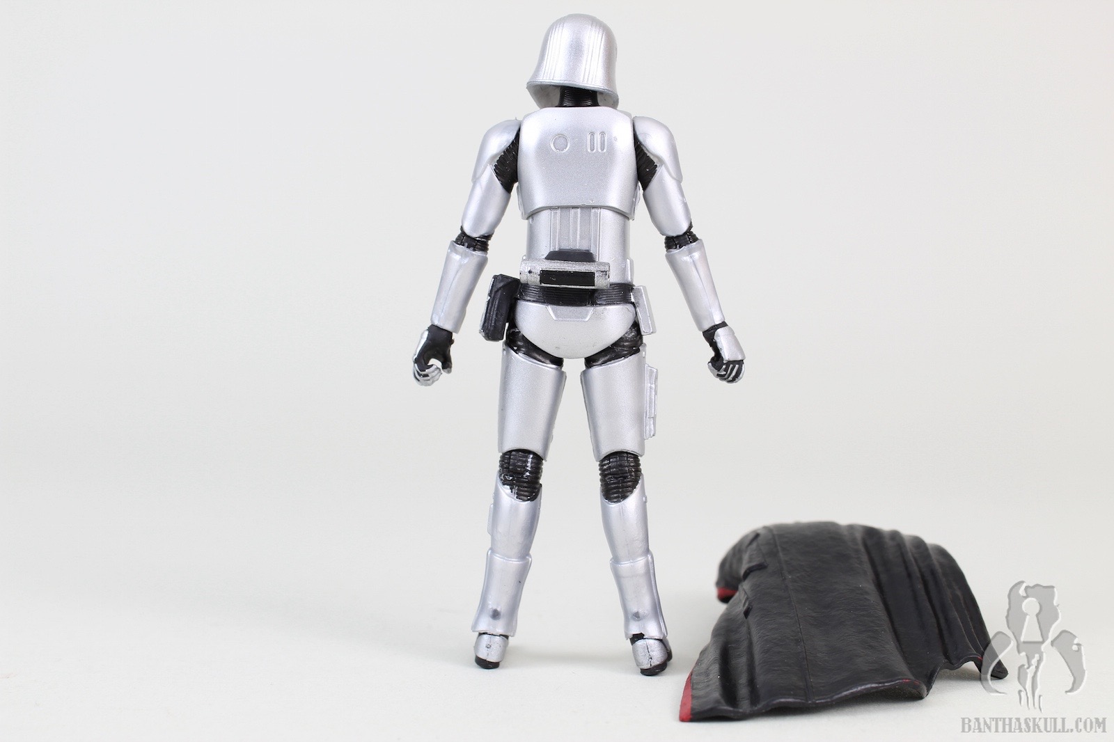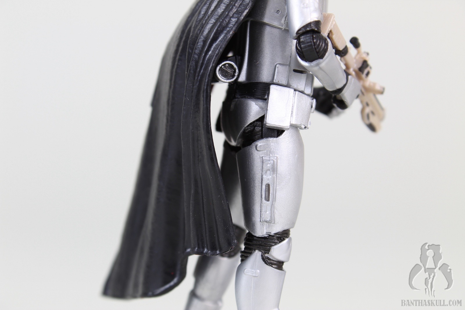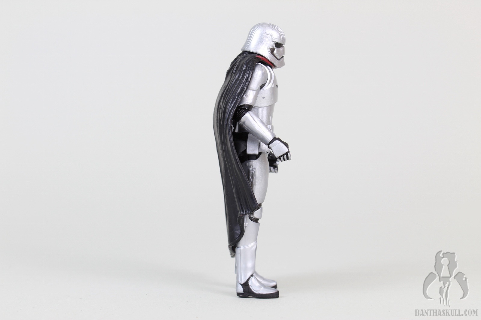 The cape is soft plastic. The good thing is that it doesn’t really hamper the articulation much, so this is a success. But I would have preferred soft goods, and left the hard plastic to the 5POA budget figure. The one area where the cape is a bit of a problem is at the neck. Phasma’s head is slightly limited in movement options with the cape on, but when the cape is removed, the head has a full range of motion. The figure holds the included blaster well - and of course can achieve the vaunted THWG*. The weapon can be stowed in the notch located in the armor of the right hip.