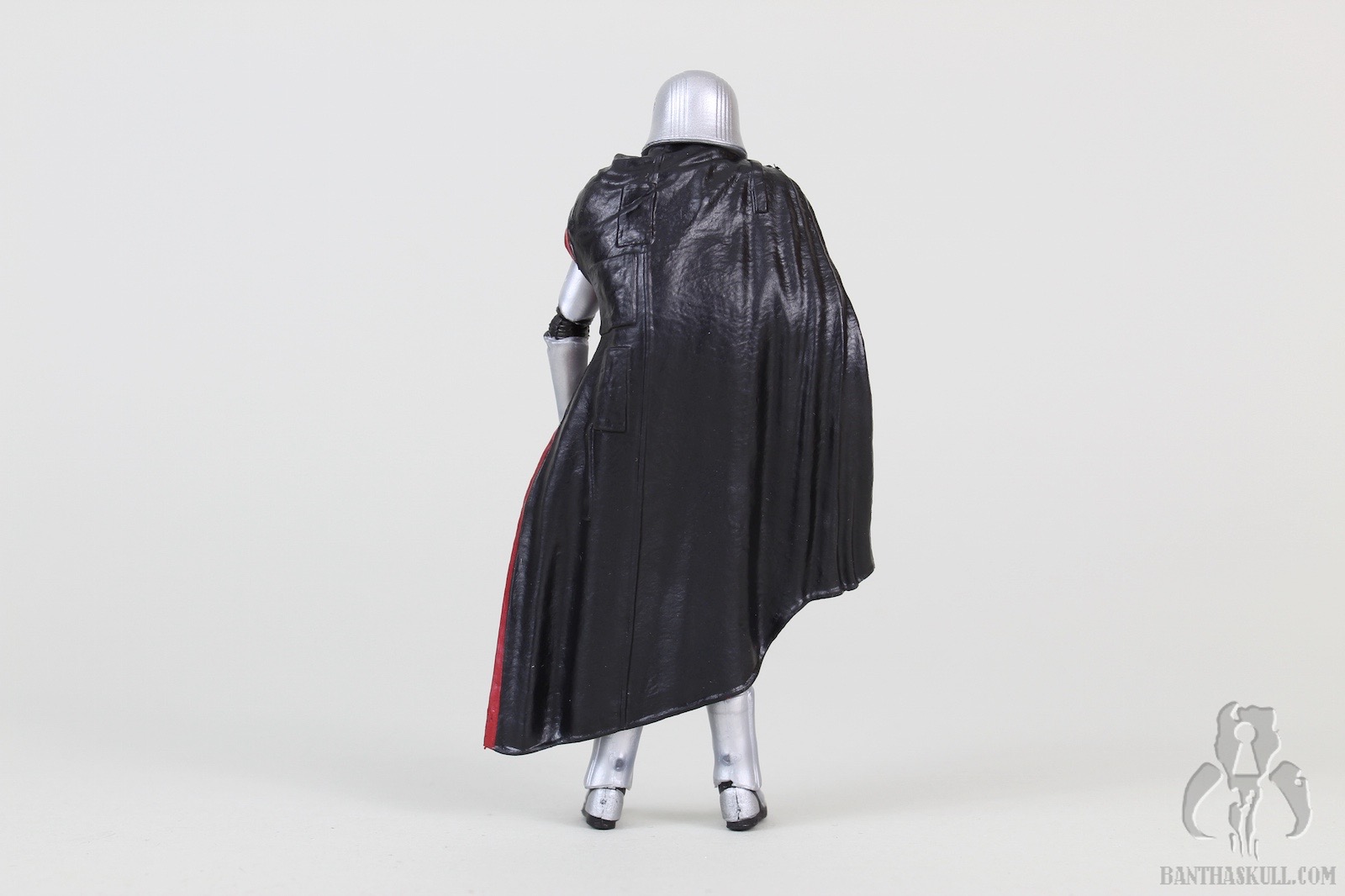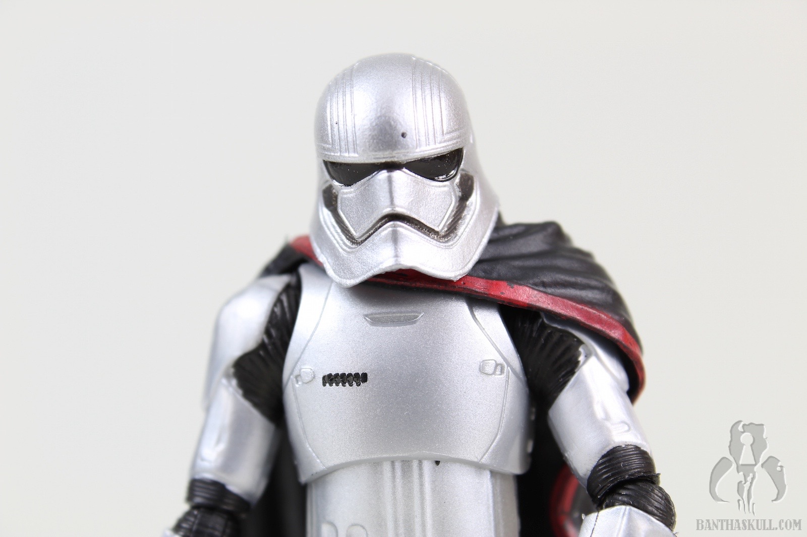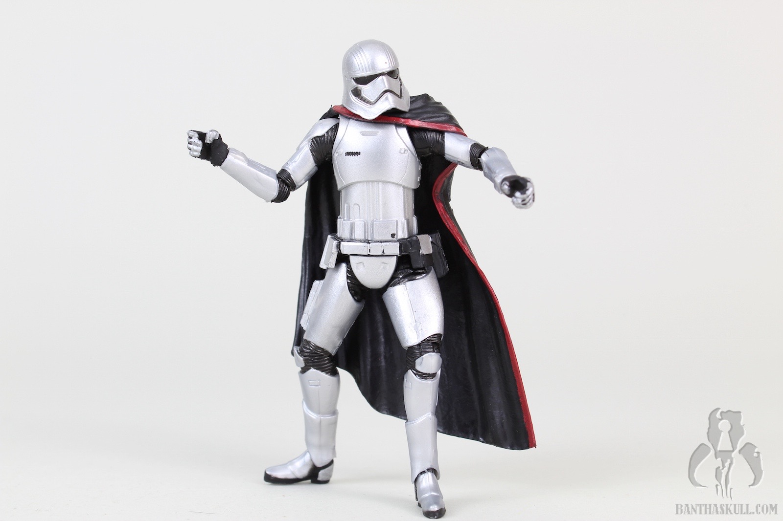 The cape is soft plastic. The good thing is that it doesn’t really hamper the articulation much, so this is a success. But I would have preferred soft goods, and left the hard plastic to the 5POA budget figure. The one area where the cape is a bit of a problem is at the neck. Phasma’s head is slightly limited in movement options with the cape on, but when the cape is removed, the head has a full range of motion. The figure holds the included blaster well - and of course can achieve the vaunted THWG*. The weapon can be stowed in the notch located in the armor of the right hip.