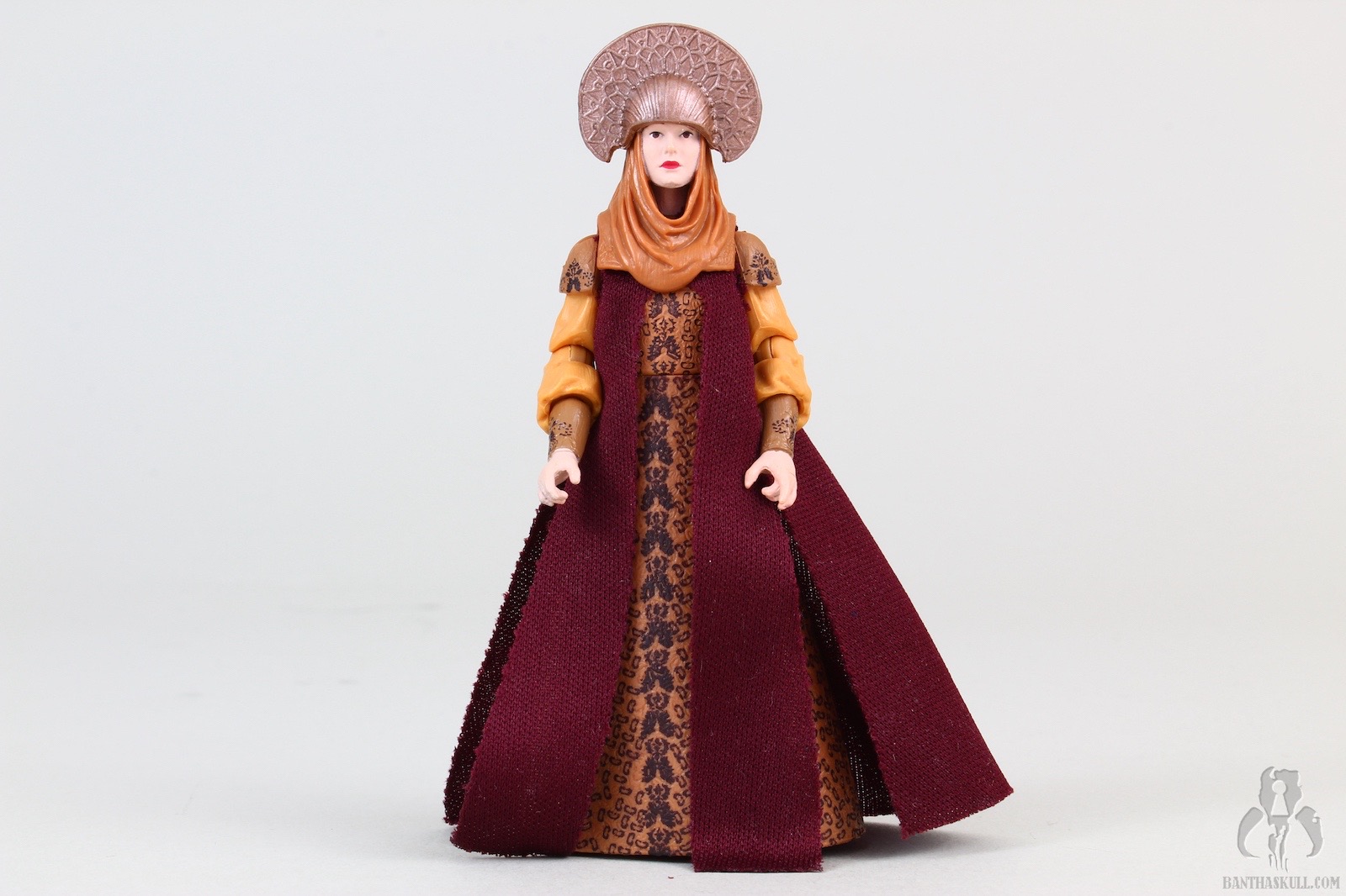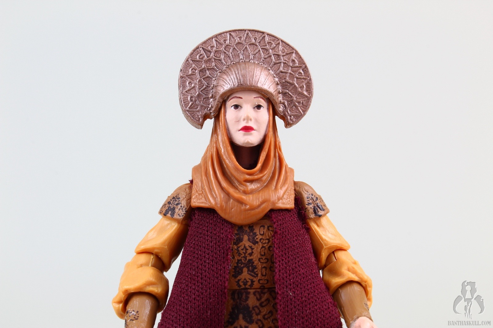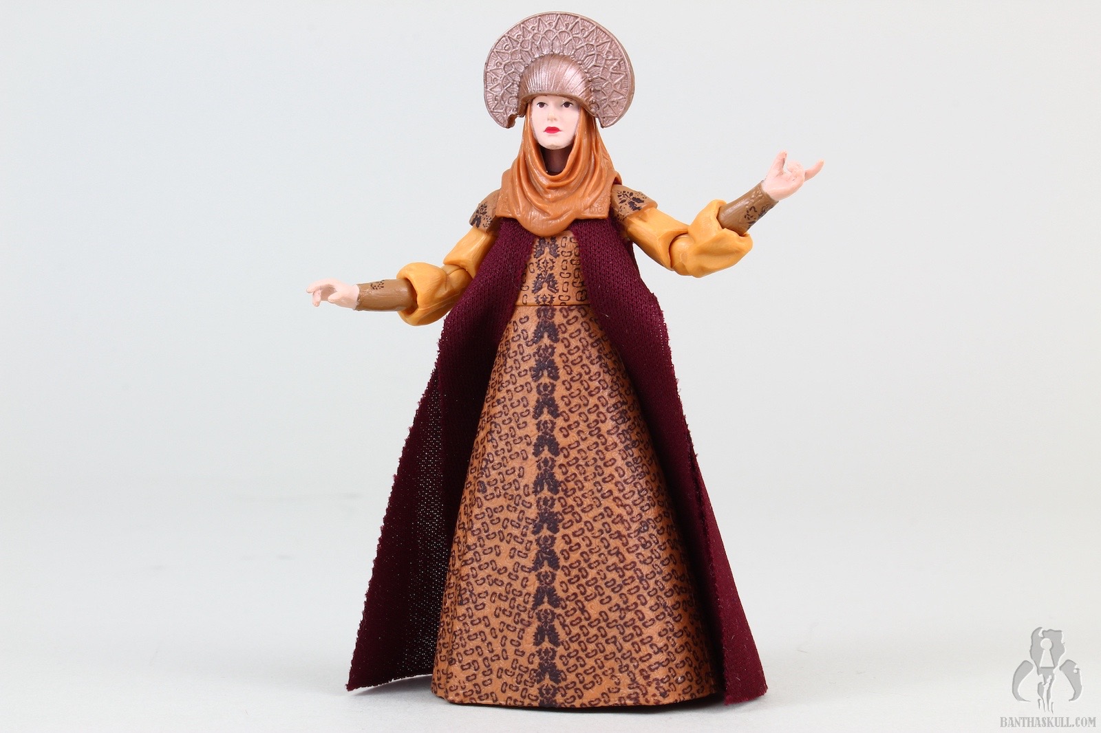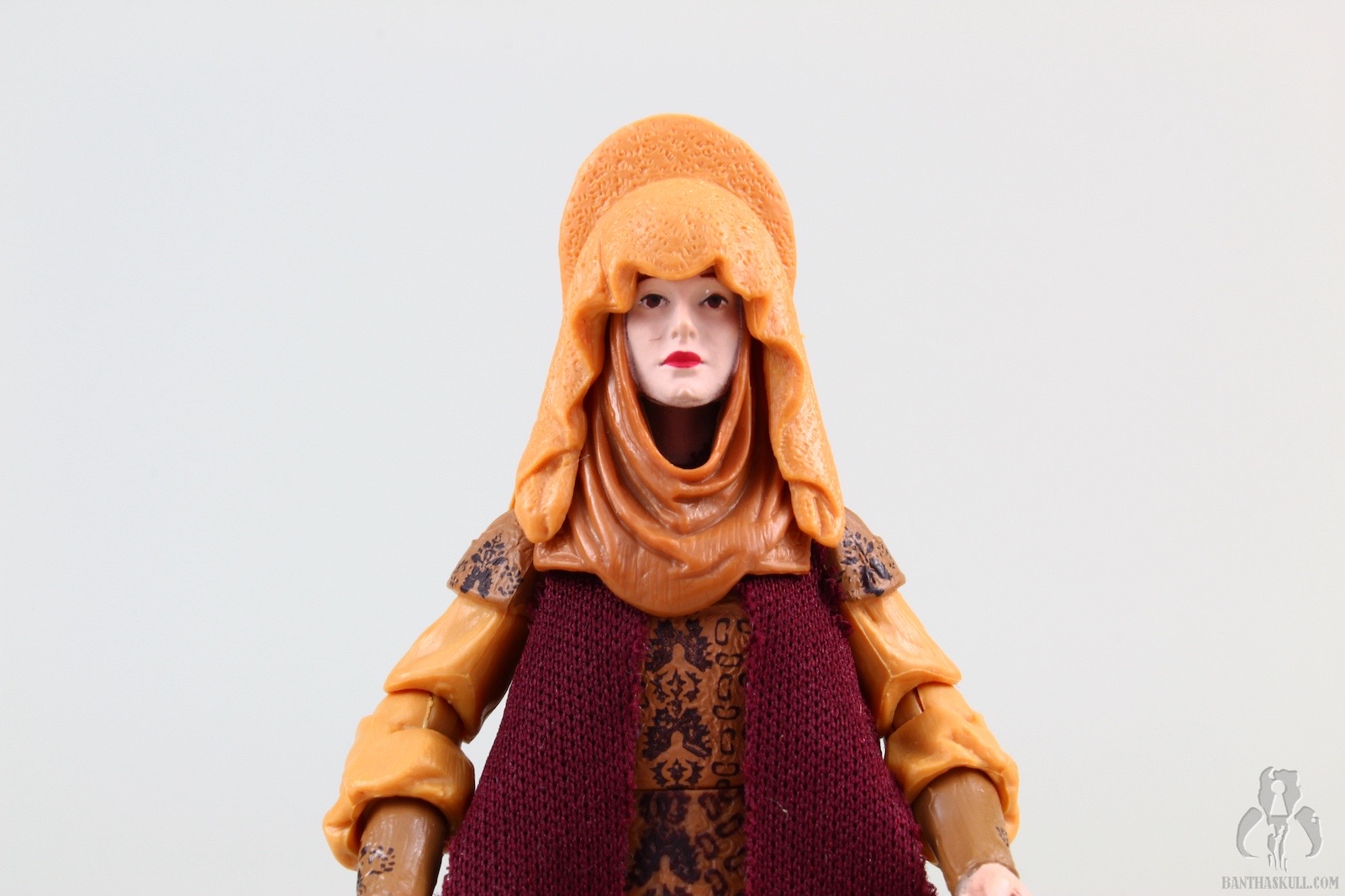 The figure is 100% collector-driven, wearing a costume from a trio of minor scenes with zero action and tons of cringeworthy dialogue (mostly from Anakin). It’s beautifully done. The outfit has tremendous detail and depth, mostly sculpted in plastic with some soft goods highlights. The head sculpt isn’t awesome, but it’s passable. It comes with two different headdress accessories, one being an odd hat, and the other a lovely shmata to go along with Anakin’s. The only articulation is from the waist up. We get a salt shaker figure, which, as we discussed in our review and comments for the 2018 Solo figure, Moloch, can be OK in TVC if executed well and done for a figure that doesn’t make you miss the underarticulation, as is the case with this one.