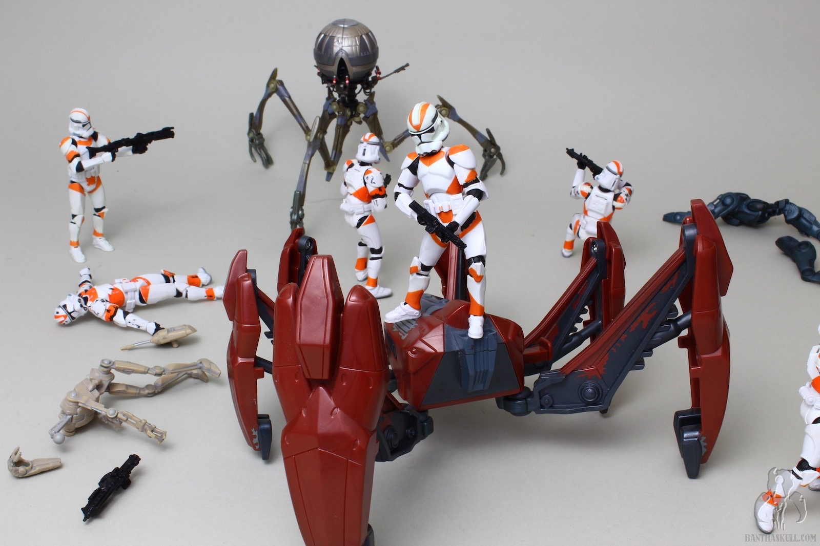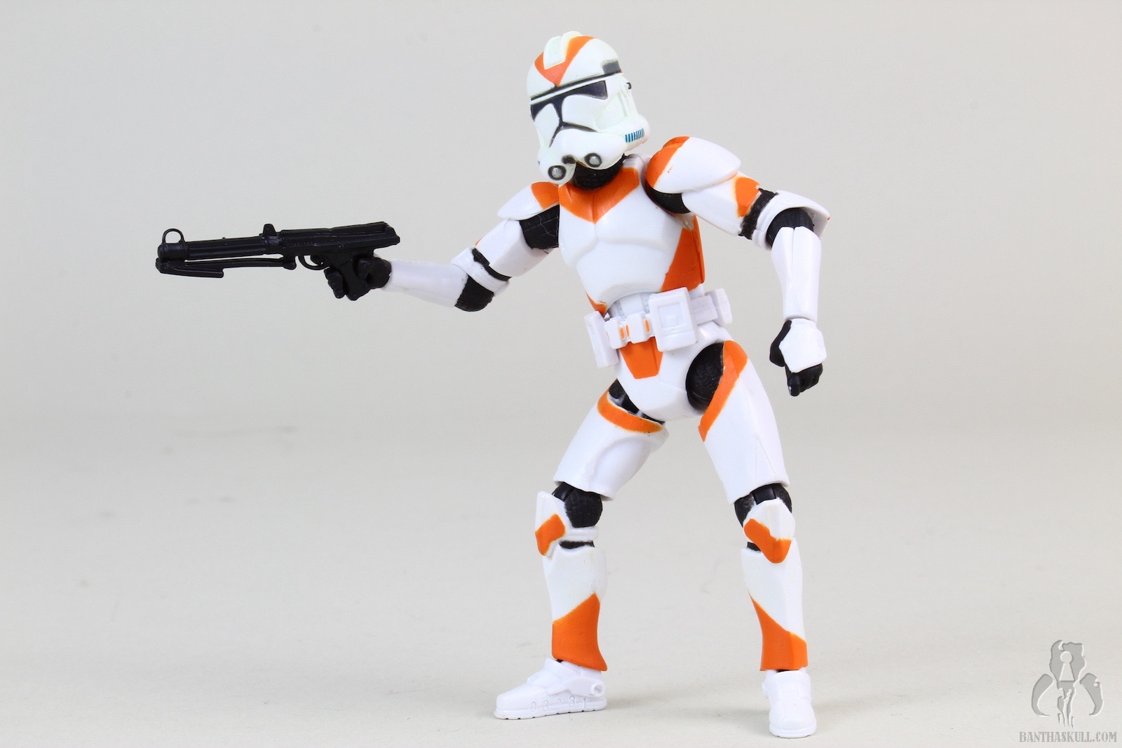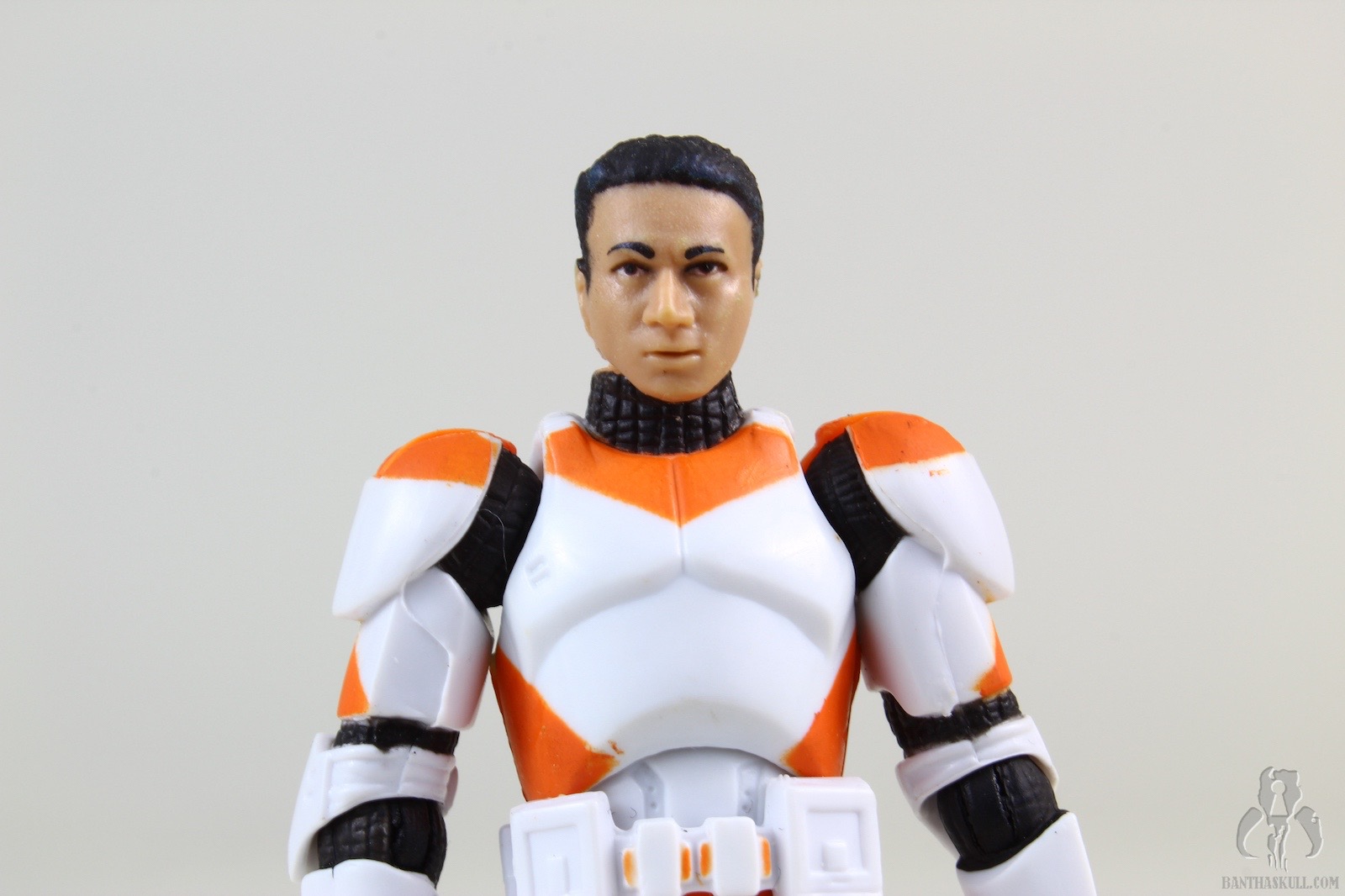 The quality of the figure itself is also suspect, as the soft plastic of my sample has allowed the legs to warp a bit, to the point where it was really hard to get the figure to stand up straight for the purposes of this gallery. The paint applications at first seem ok, but this figure, and almost every other 212th clone, seem to suffer from a lack of consistent orange. When placed together on display, the differing orange shades of the troop variants can be a bit off putting. (Fortunately in this case, I’m somewhat colorblind. But that doesn’t matter right now.) My complaint with the paint is that this may be the only 212th released to date that is clean; the figure includes neither carbon scoring, nor orange paint chips/scrapes anywhere on the armor.
