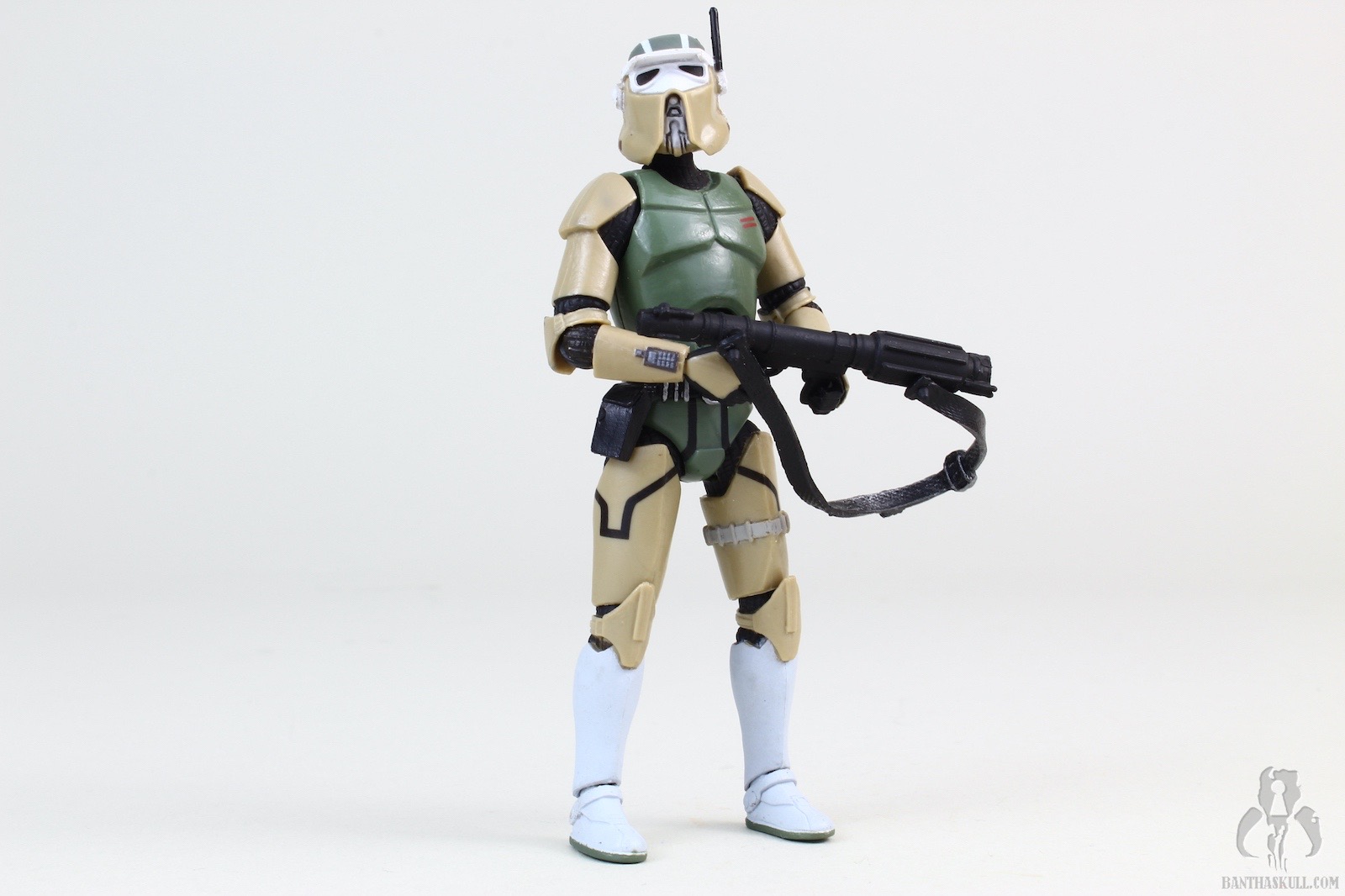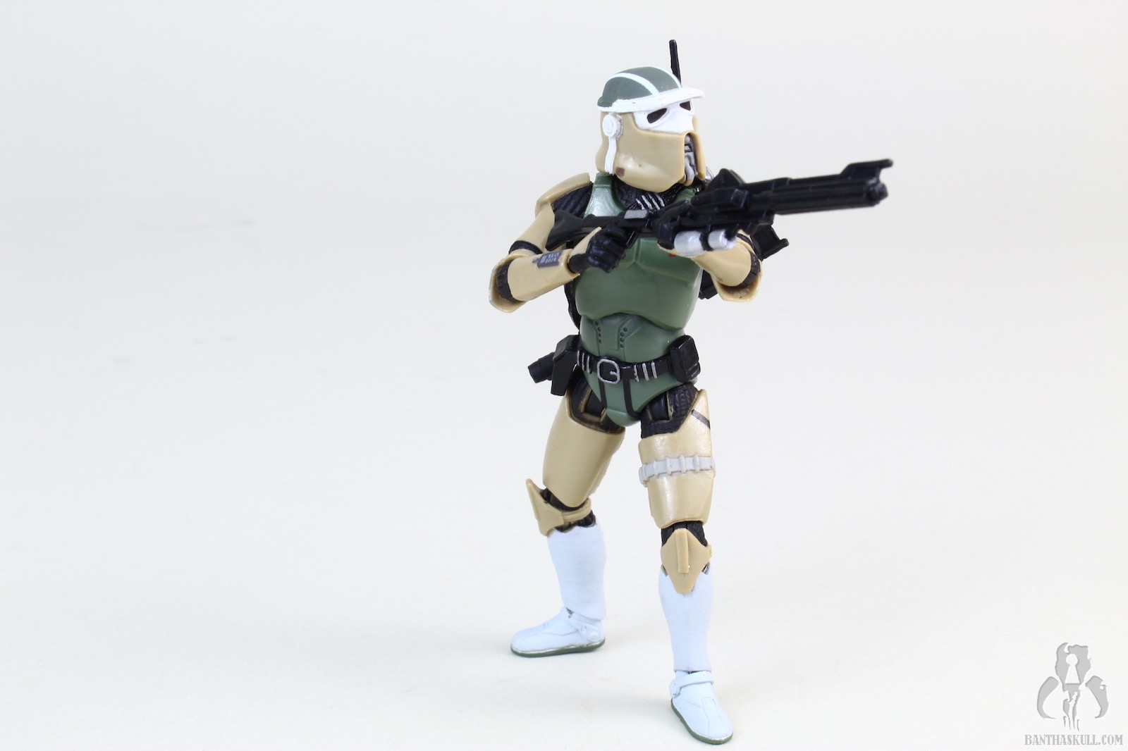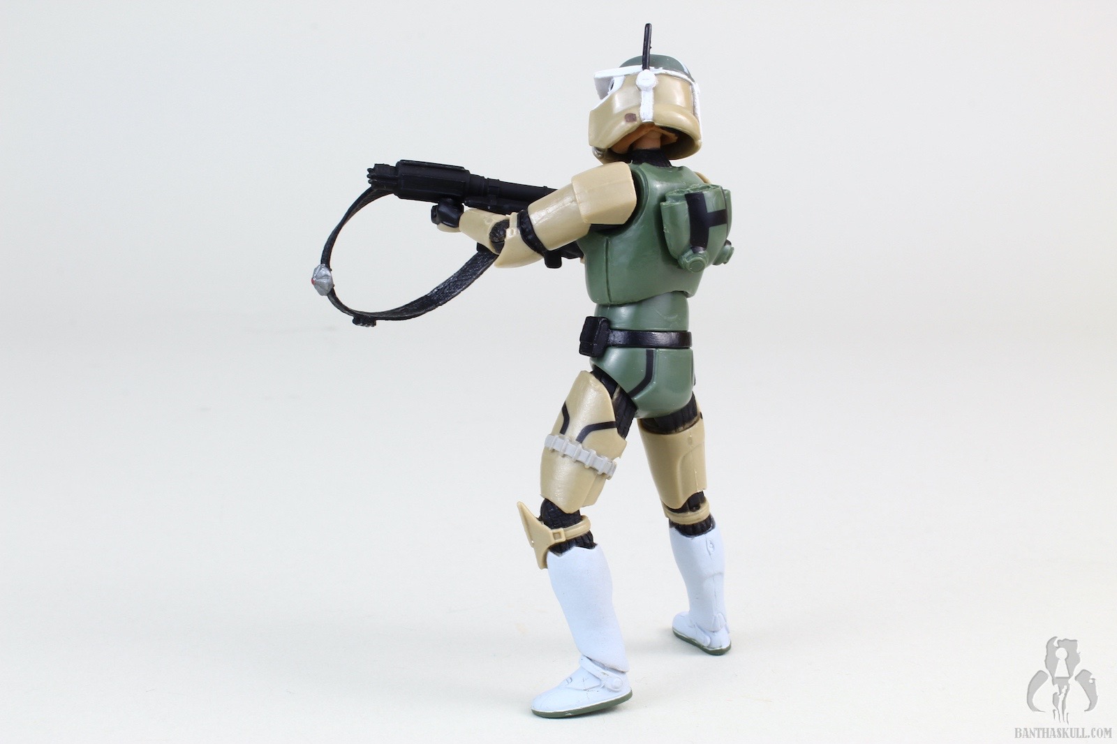 The sculpt and paint applications are excellent. While removable helmets are usually frowned upon by most collectors, it works well with this particular figure. The articulation allows for a variety of poses, including the sitting position required to interact with the AT-RT, although yes, it’s a little frustrating to get it there due to the hips. The driver comes with a pair of weapons, including an unusual type that slings over his shoulder. The figure is able to perform a THWG, so that’s a big plus.