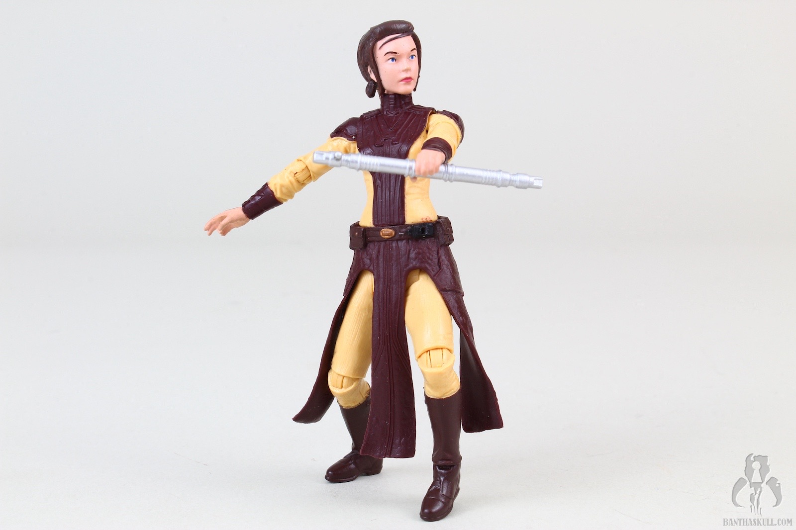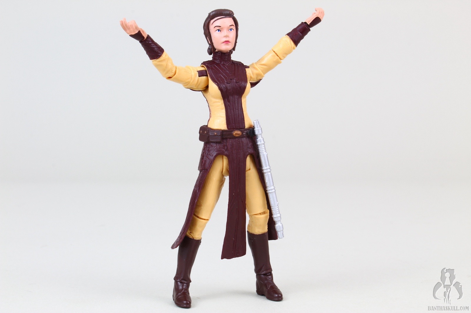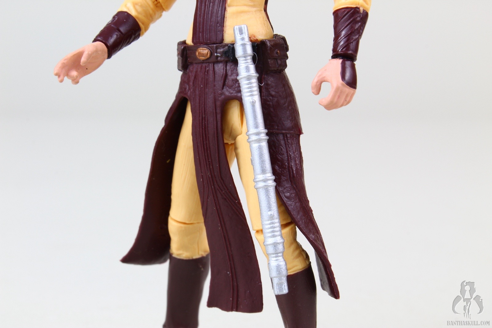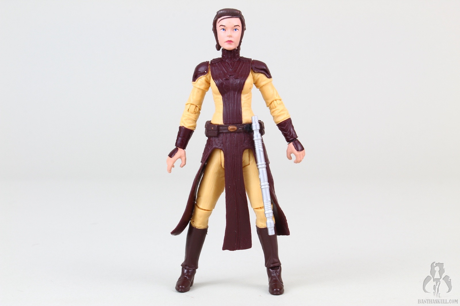 The figure is excellent, if not perfect. The actual sculpt is quite good, with all the basic articulation expected. It would have been better if she had the full range of Jedi-caliber articulation, but there are no ball jointed hips. The paint applications are adequate, although the face could be a little better. Likeness isn’t really a concern, as the source is a video game with rather dated (but still good) graphics. Bastila can hold onto her lightsaber in any number of ways, including an effective THWG. She also comes with an unlit hilt, which can hook into the hole on her belt, although it does look a little odd because of the length.