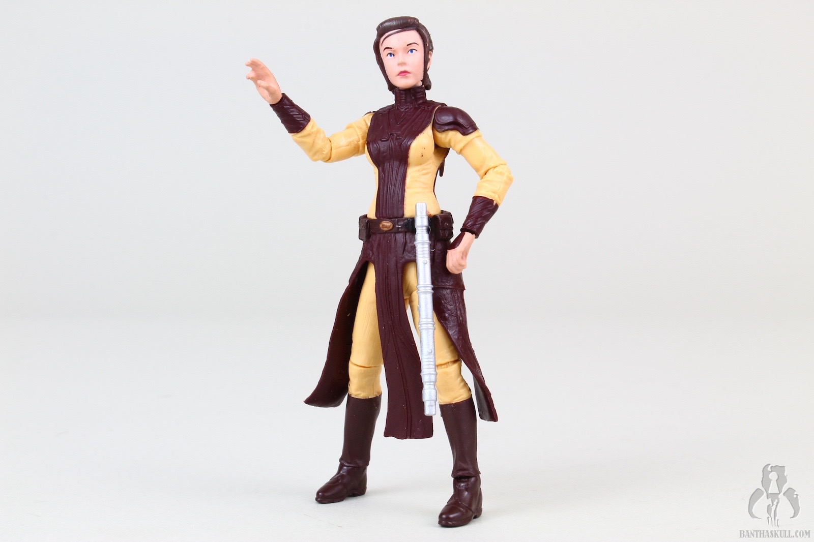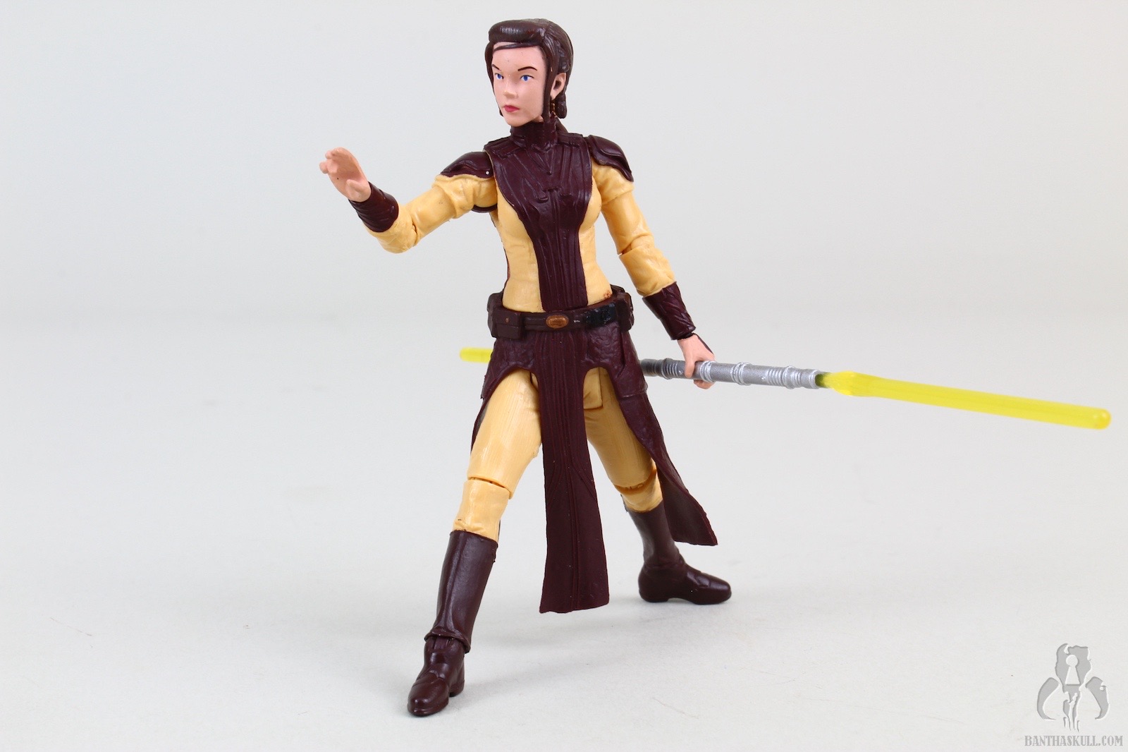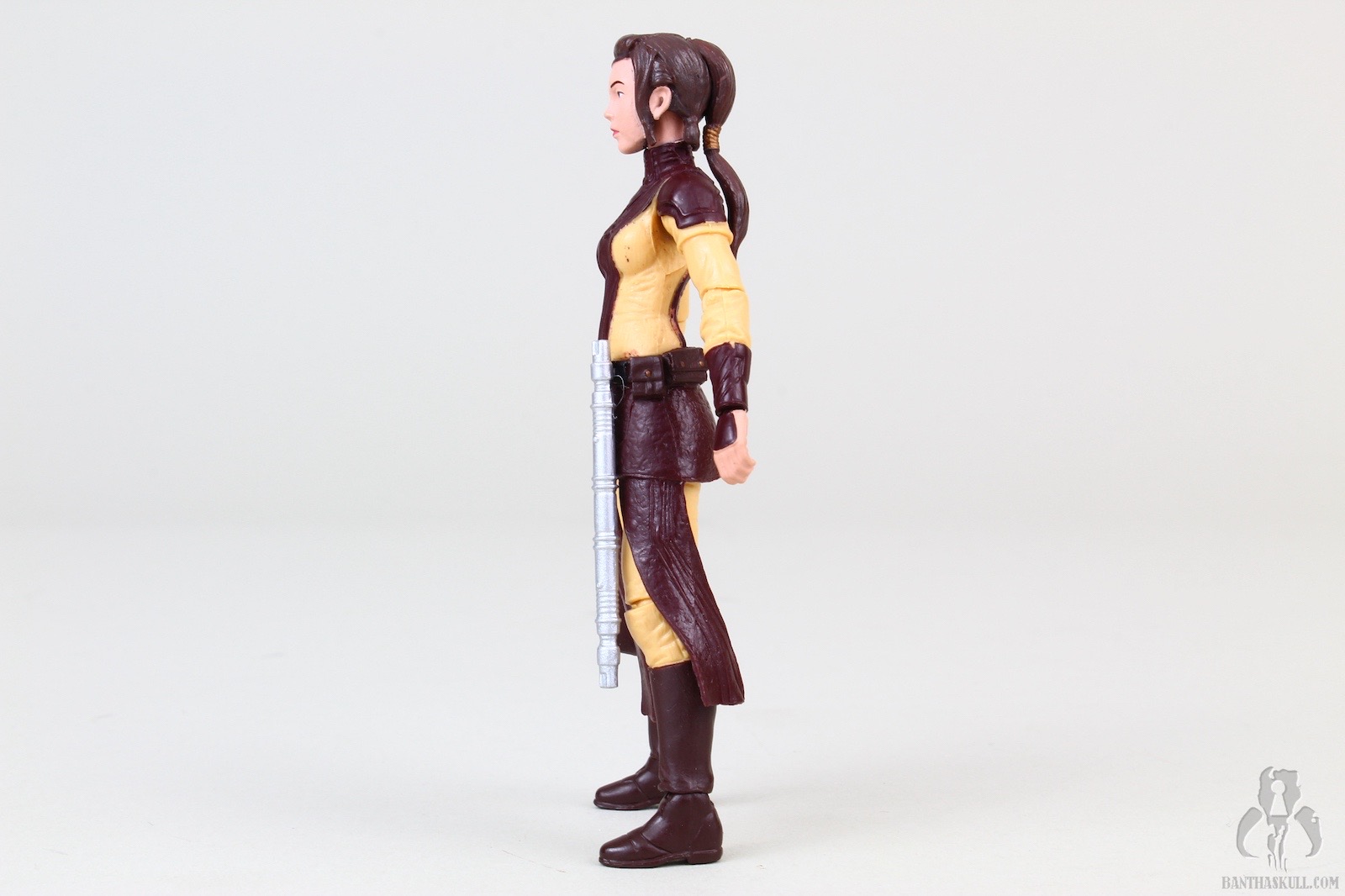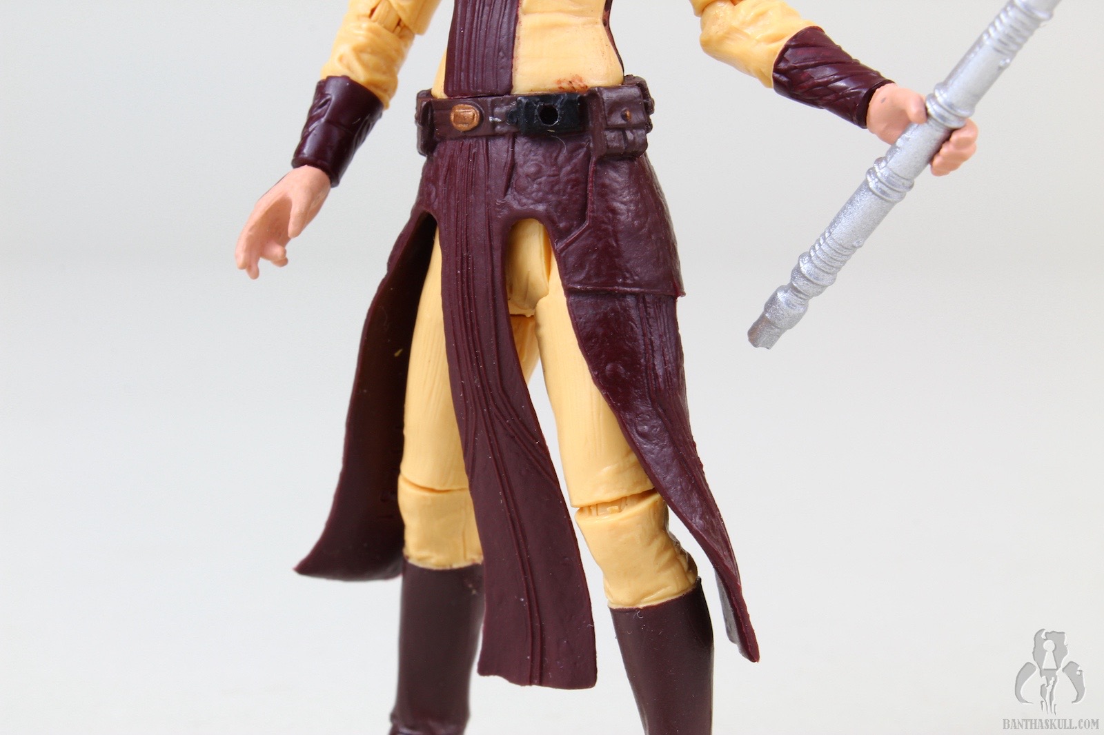 The figure is excellent, if not perfect. The actual sculpt is quite good, with all the basic articulation expected. It would have been better if she had the full range of Jedi-caliber articulation, but there are no ball jointed hips. The paint applications are adequate, although the face could be a little better. Likeness isn’t really a concern, as the source is a video game with rather dated (but still good) graphics. Bastila can hold onto her lightsaber in any number of ways, including an effective THWG. She also comes with an unlit hilt, which can hook into the hole on her belt, although it does look a little odd because of the length.
