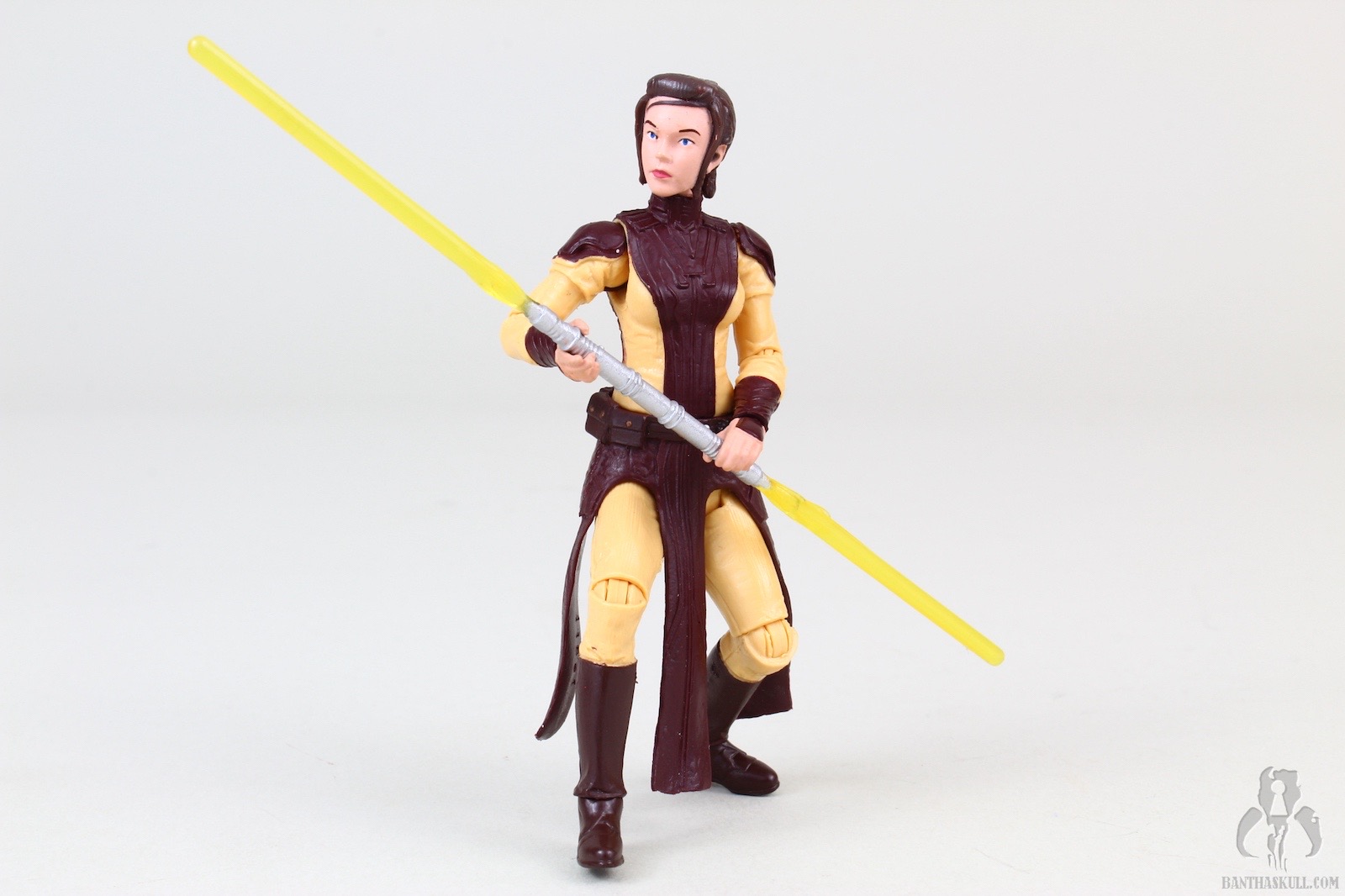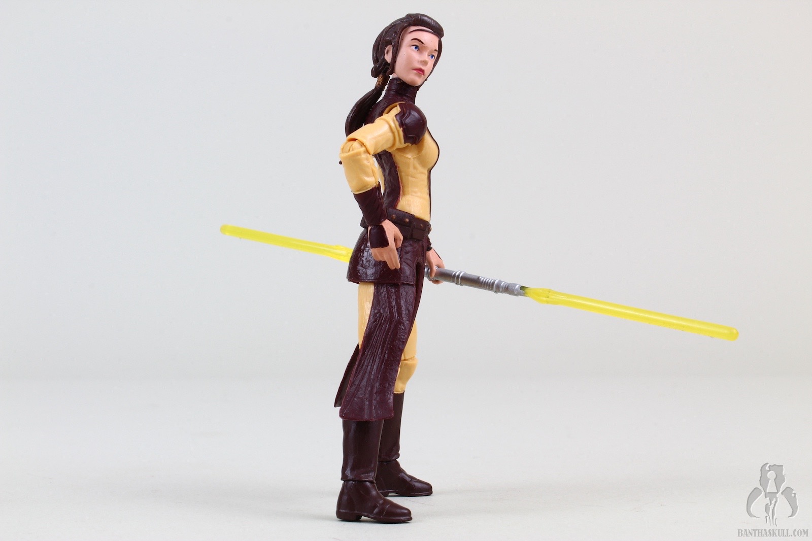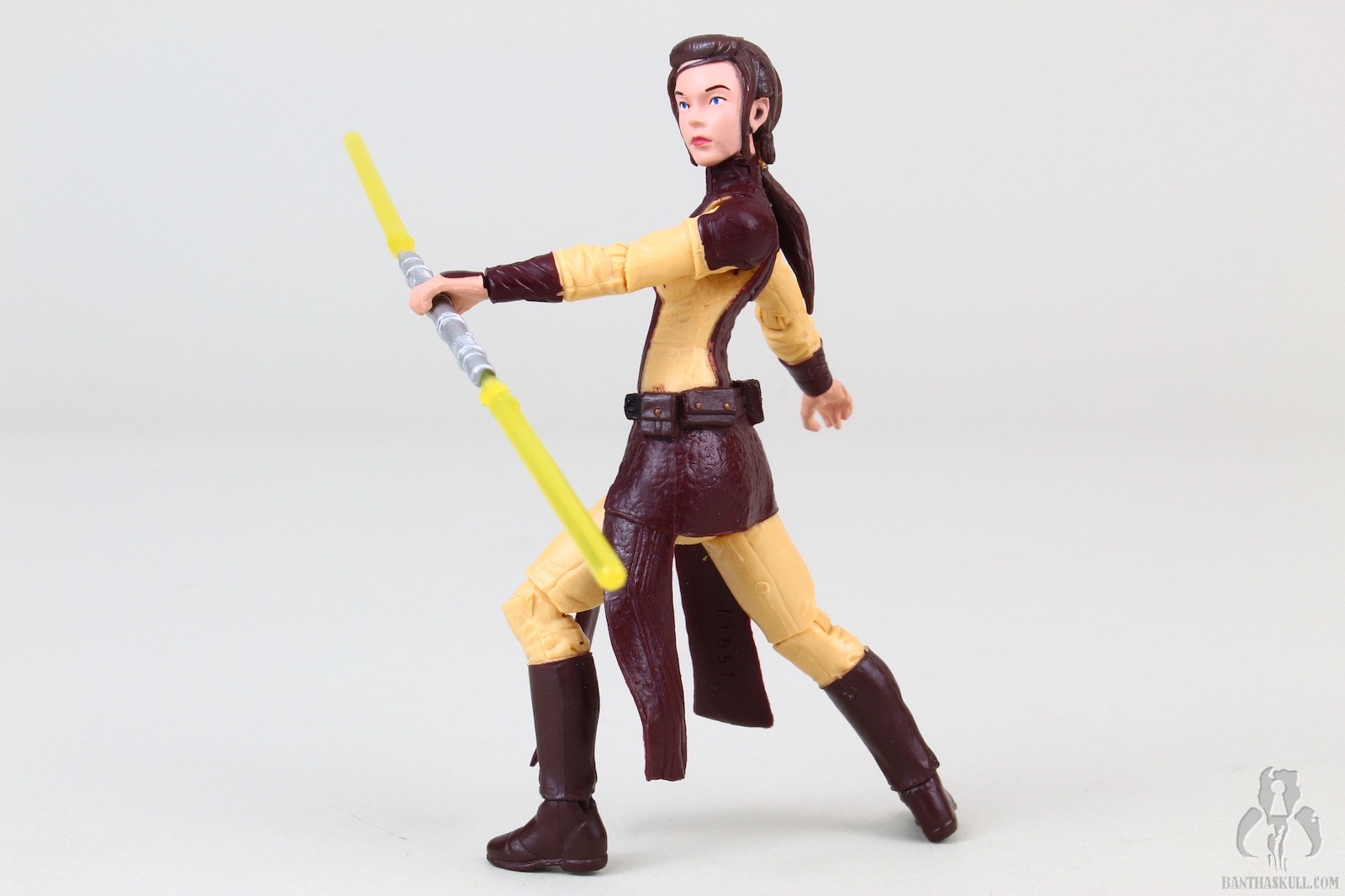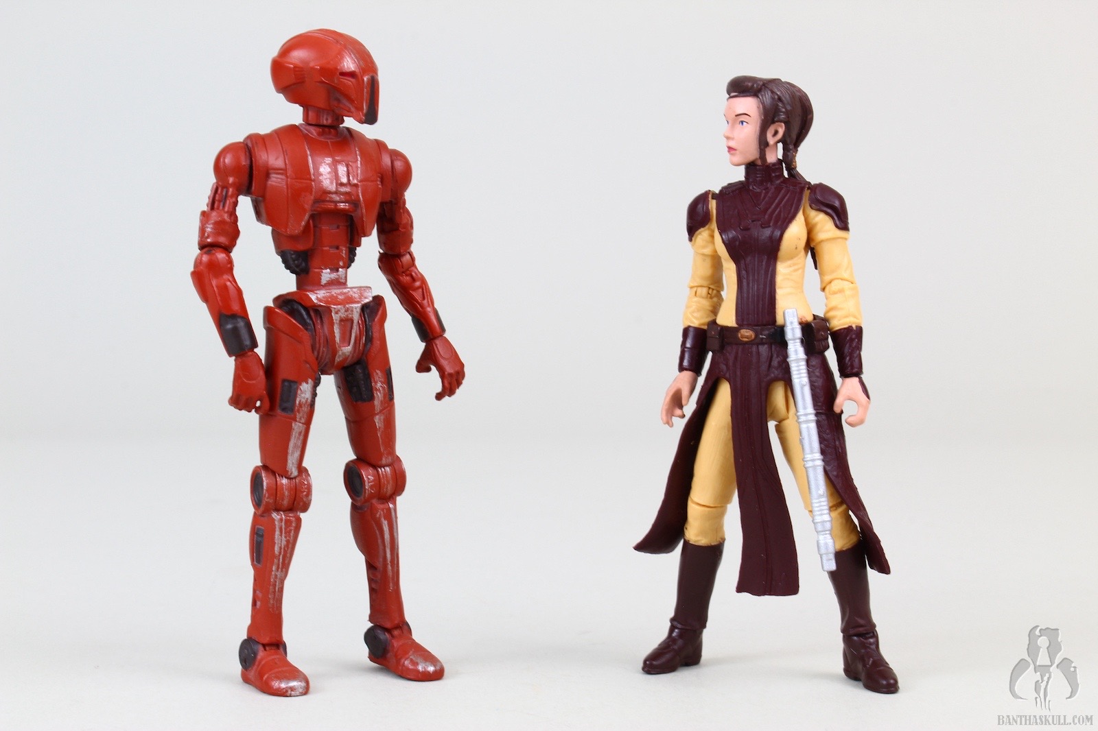 The figure is excellent, if not perfect. The actual sculpt is quite good, with all the basic articulation expected. It would have been better if she had the full range of Jedi-caliber articulation, but there are no ball jointed hips. The paint applications are adequate, although the face could be a little better. Likeness isn’t really a concern, as the source is a video game with rather dated (but still good) graphics. Bastila can hold onto her lightsaber in any number of ways, including an effective THWG. She also comes with an unlit hilt, which can hook into the hole on her belt, although it does look a little odd because of the length.