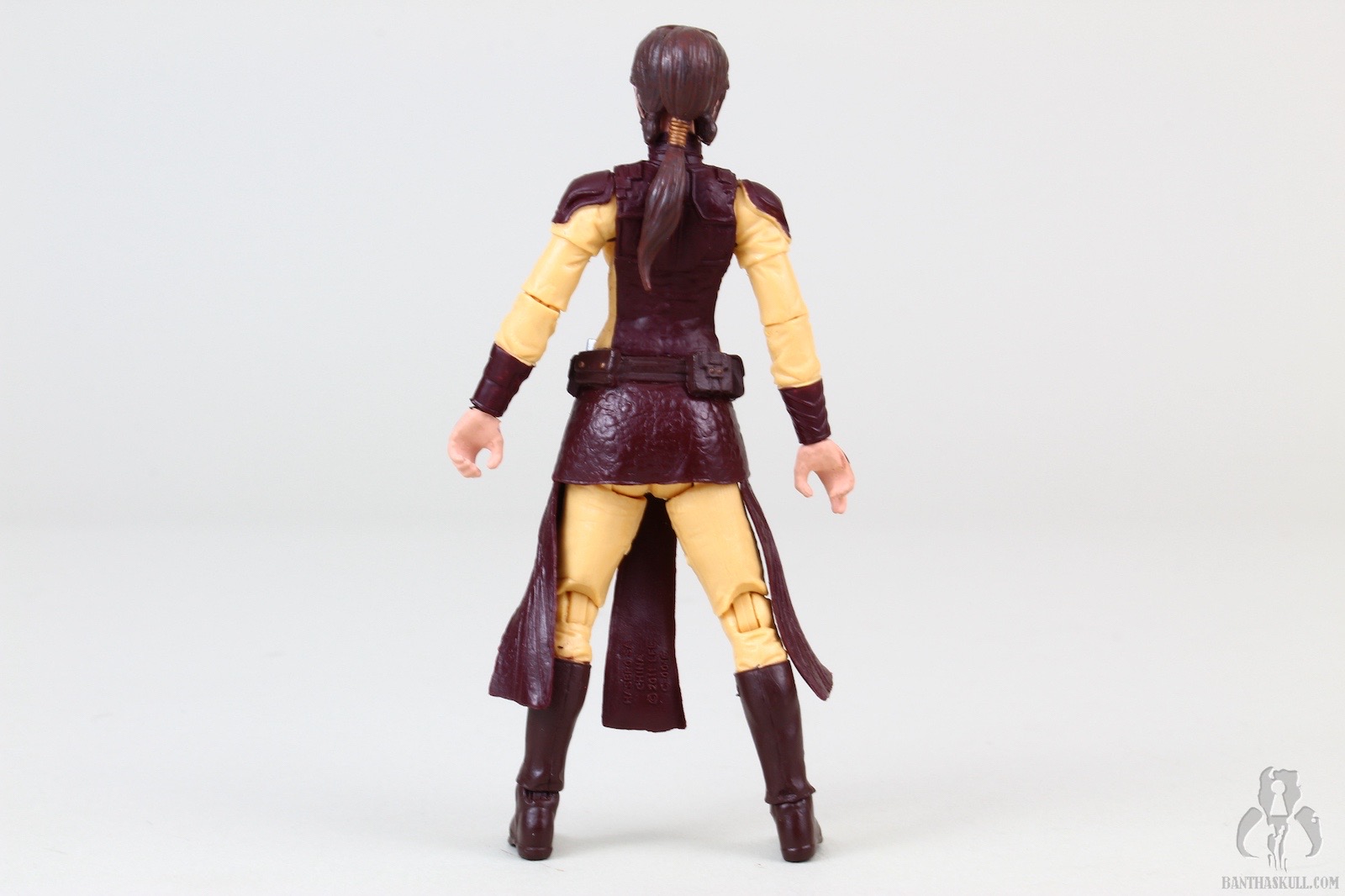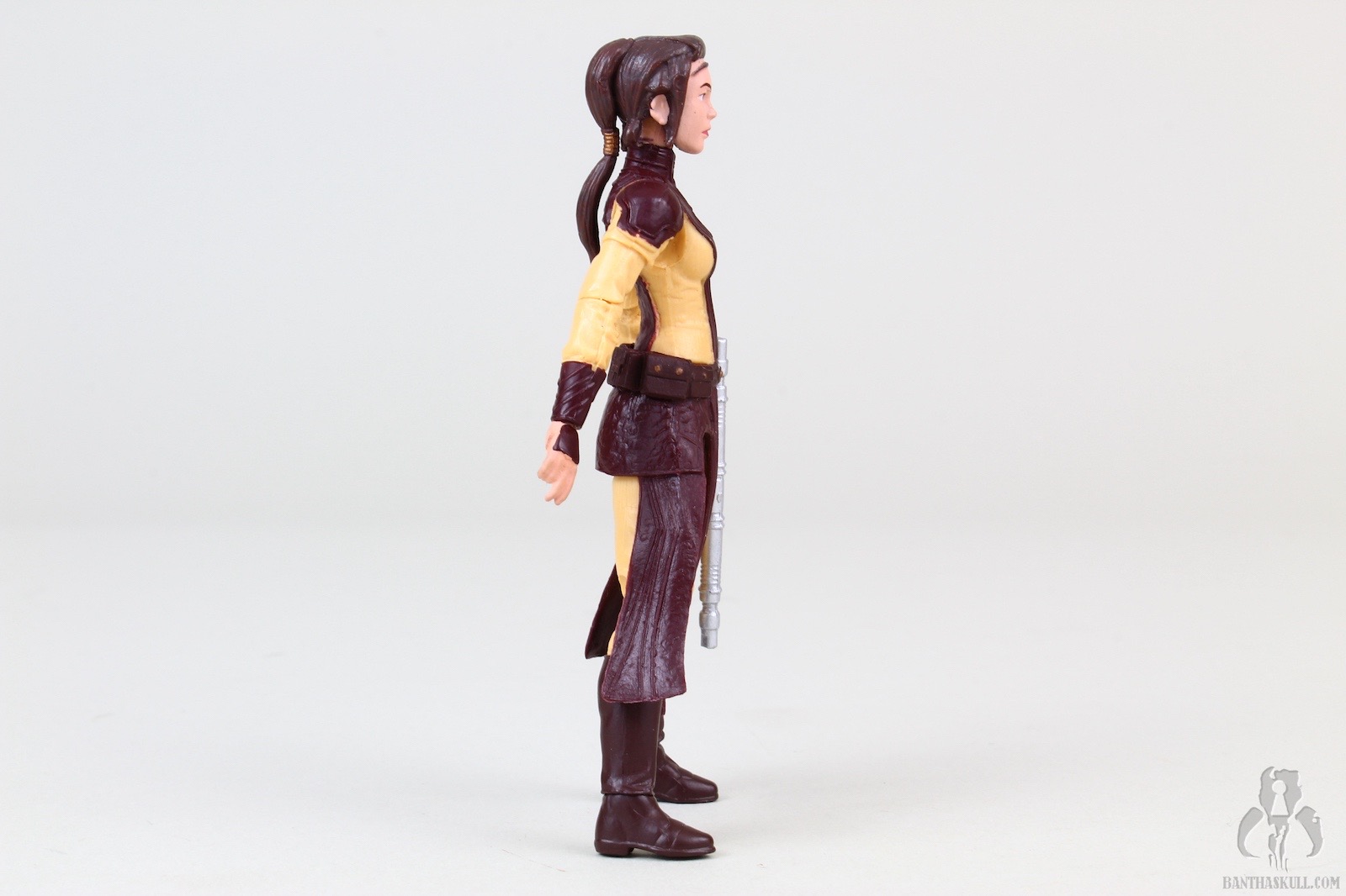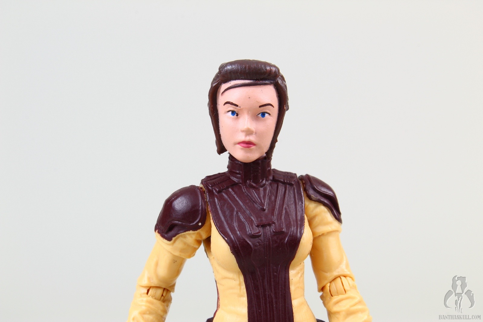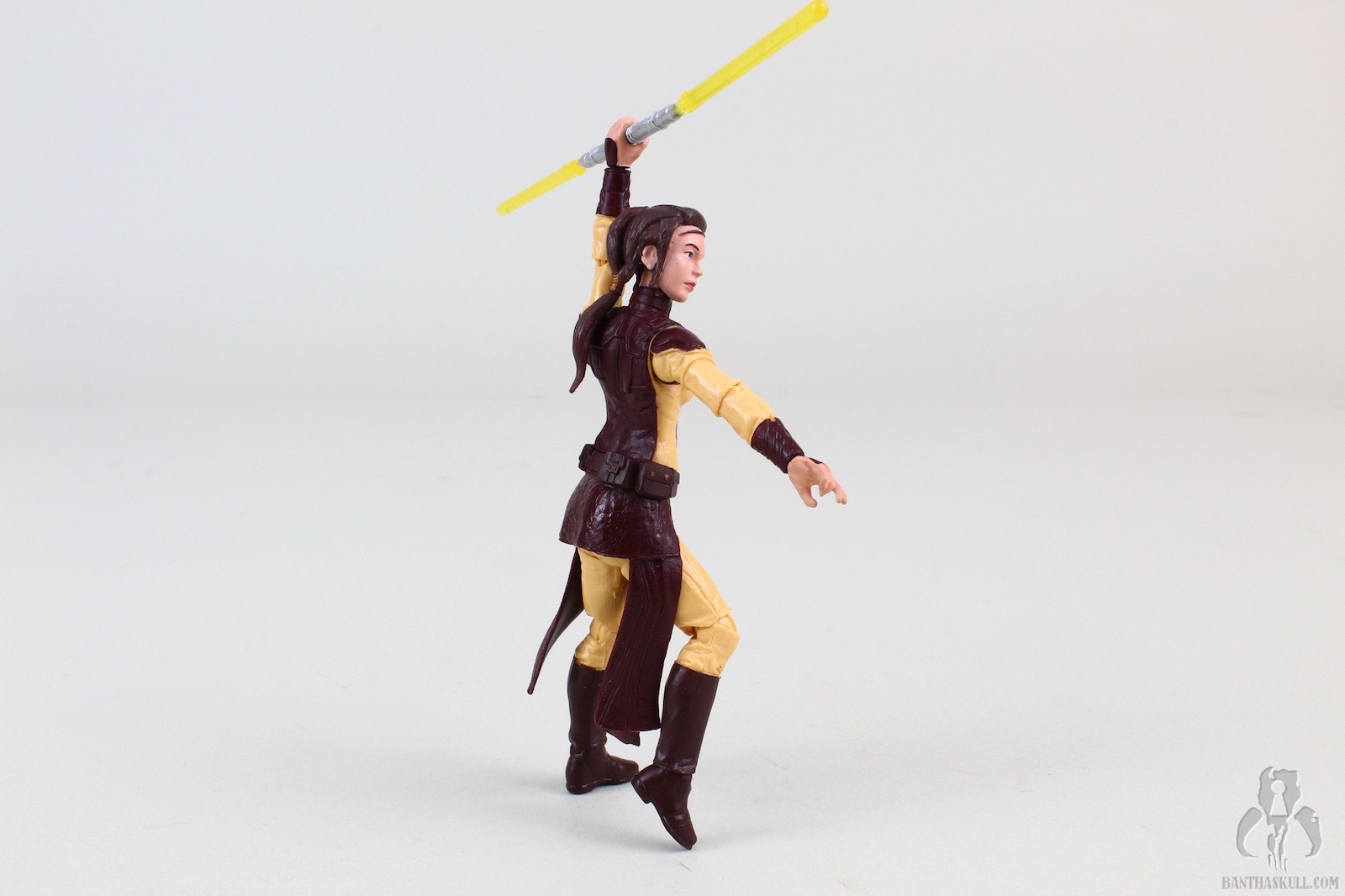 The figure is excellent, if not perfect. The actual sculpt is quite good, with all the basic articulation expected. It would have been better if she had the full range of Jedi-caliber articulation, but there are no ball jointed hips. The paint applications are adequate, although the face could be a little better. Likeness isn’t really a concern, as the source is a video game with rather dated (but still good) graphics. Bastila can hold onto her lightsaber in any number of ways, including an effective THWG. She also comes with an unlit hilt, which can hook into the hole on her belt, although it does look a little odd because of the length.