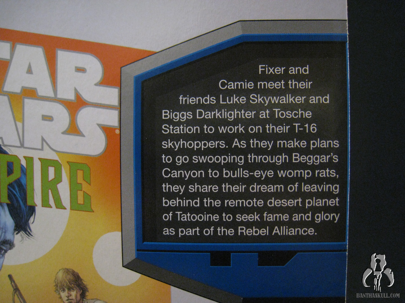 The idea here is that we get two “legendary” characters that were friends with a young Luke on Tatooine, but whose scenes were left on the cutting room floor. Once Hasbro decided to go ahead and produce a figure of Biggs Darklighter wearing his academy duds, it seemed that fans started clamoring extra loudly for these guys in order to “complete the scene.” Well, about 3 years after Biggs hit the shelves, and after several false starts and rumors of cancellation, Camie and Fixer are finally here, immortalized in plastic.