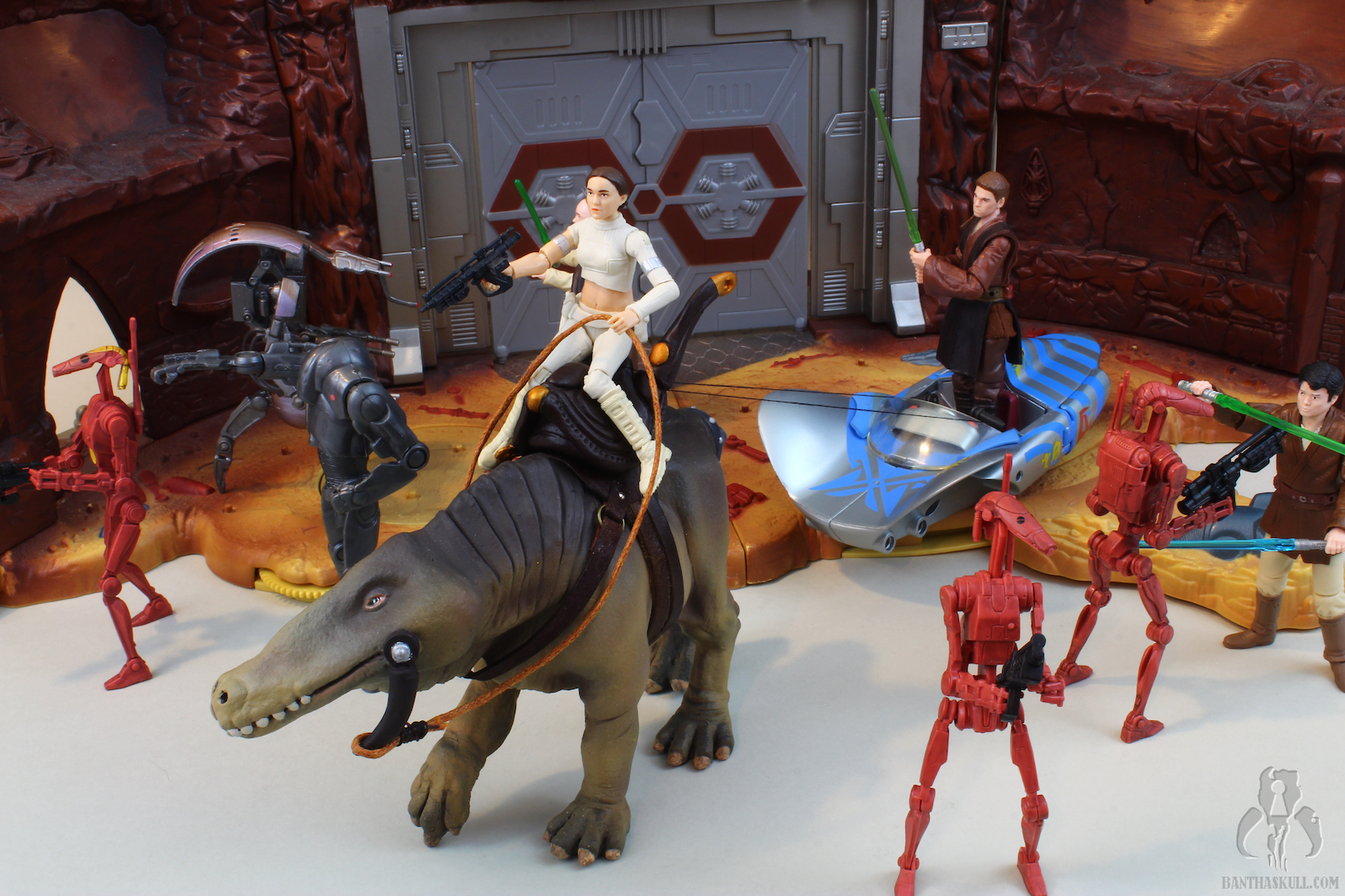 15. The lack of ball jointed hips makes it difficult for Padmé to sit on the Reek (although it is otherwise an outstanding figure). TBS Anakin and TVC Obi-Wan sit well. Throw in a bunch of Droidekas, and you've just completed the execution phase of Geonosis.