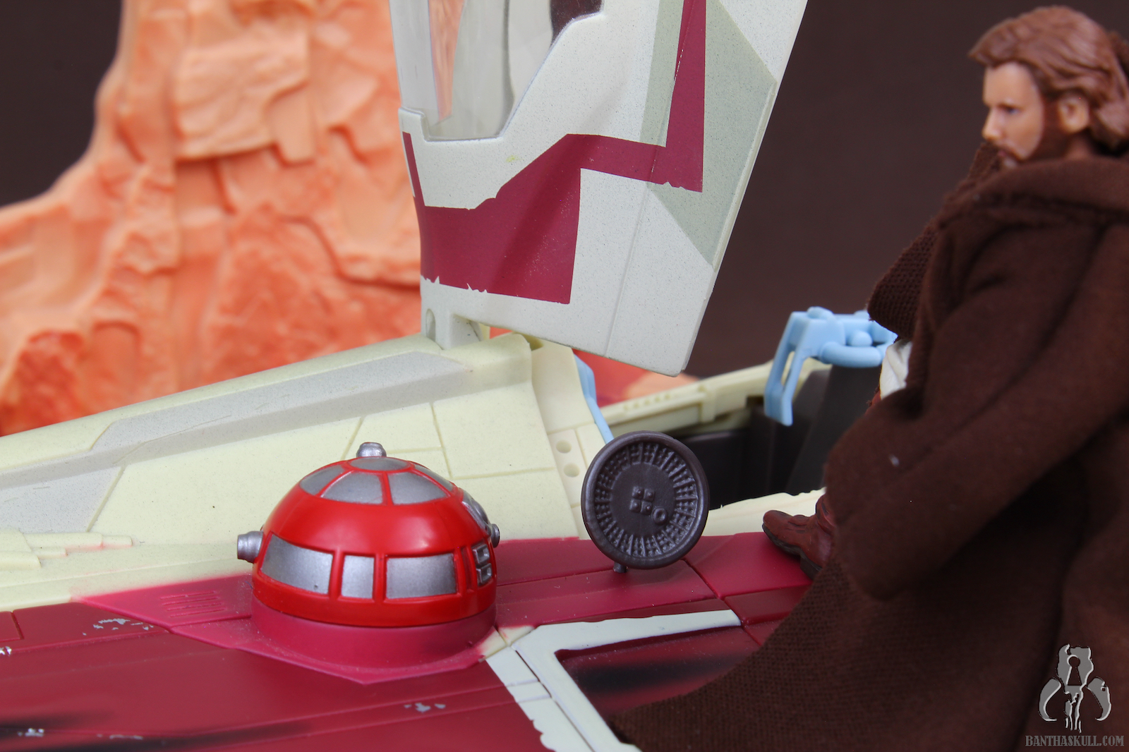 7. A really neat little bonus from Hasbro is that the radar dish that comes with the Saga Obi-Wan Pilot figure can plug into a small hole in the hull of the Jedi Starfighter.