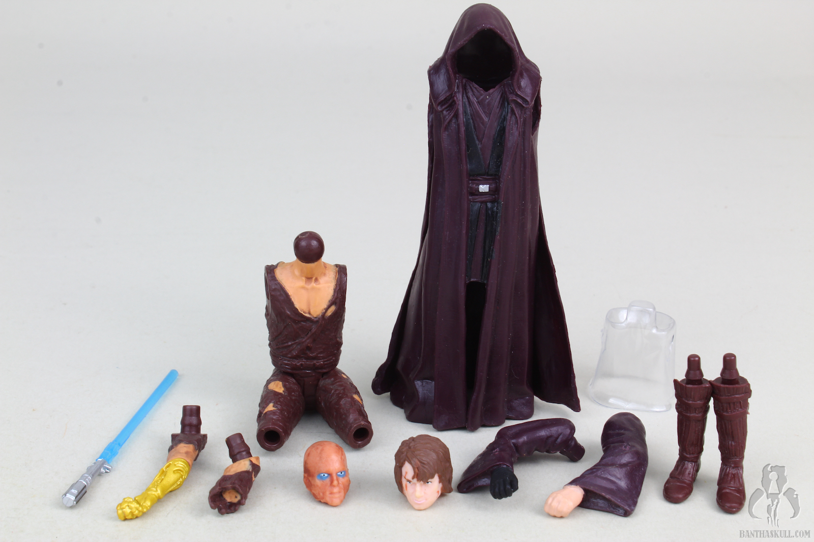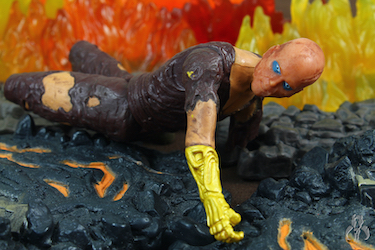 Here it is. #1. The most gruesome 3.75" Star Wars figure made by Hasbro. It's a basic figure, but you get just about everything you need to display Anakin both before and after his epic duel with Obi-Wan Kenobi. You can create a (sort of) basic Anakin with a regular face and a robe that covers his body. But switch out the head, remove the robes, and lose the shins and arms, and you've got a burnt, stubby, nightmare of a paraplegic volcano victim. He's the stuff of nightmares. Scorched skin, tattered clothes melted onto his body, 3 missing limbs, the exposed mechanical right forearm/hand, and a face bereft of hair and utterly scarred and burnt almost beyond recognition. His piercing eyes are filled with hate. Anakin looks like he barely survived the apocalypse.