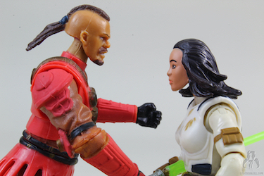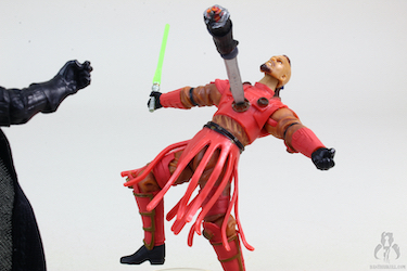 The comic figure pack included Bultar Swan, who seems to serve no purpose other than to be murdered so Arana could get her lightsaber. The cortosis blade, complete with Vader's severed hand, is included so that you can use it to impale Arana right in the chest, which Hasbro makes possible by sculpting a wound into which the cortosis blade can can be inserted. It's dark stuff, and Hasbro decided to reach into this EU source for the inspiration, so you can have it all in 3.75" scale!