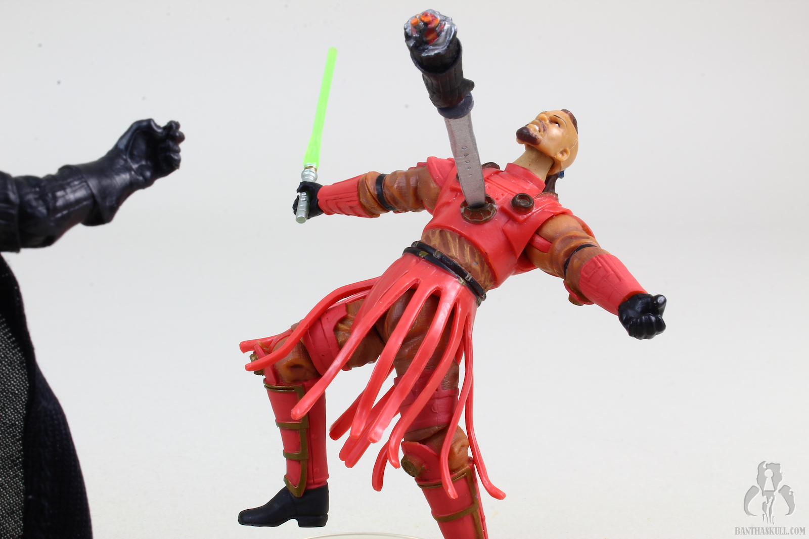 This EU-inspired comic pack is really one of the more dark and gruesome products ever released by Hasbro. We put these two items together because they go, uh, hand in hand. As the story goes, Koffi Arana was a member of a covert team of post Order 66 Jedi survivors that tried to ambush Darth Vader. A brawl ensued, in which Vader's lightsaber was deactivated by a cortosis blade (that's a thing, I guess) wielded by another Jedi. He then killed that Jedi with his bare hands, took the cortosis blade, and in turn, deactivated several more lightsabers, including Arana's. Tsu Choi then managed to slice off Vader's hand. Weaponless, Vader pretended to surrender. Koffi Arana demanded Bultar Swan's lightsaber so he could end Vader's life, but Swan rebuked him for not following the Jedi way. In a fit of rage, Arana grabbed Swan's lightsaber, and murdered her with it, then turned on Vader. At that moment, Vader used the Force to throw the cortosis blade, which was still gripped by his own severed hand, and impaled Arana in the chest, killing him. Vader eventually killed all 8 of the Jedi present at the ambush.