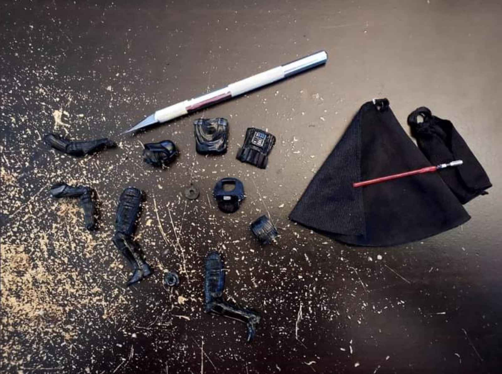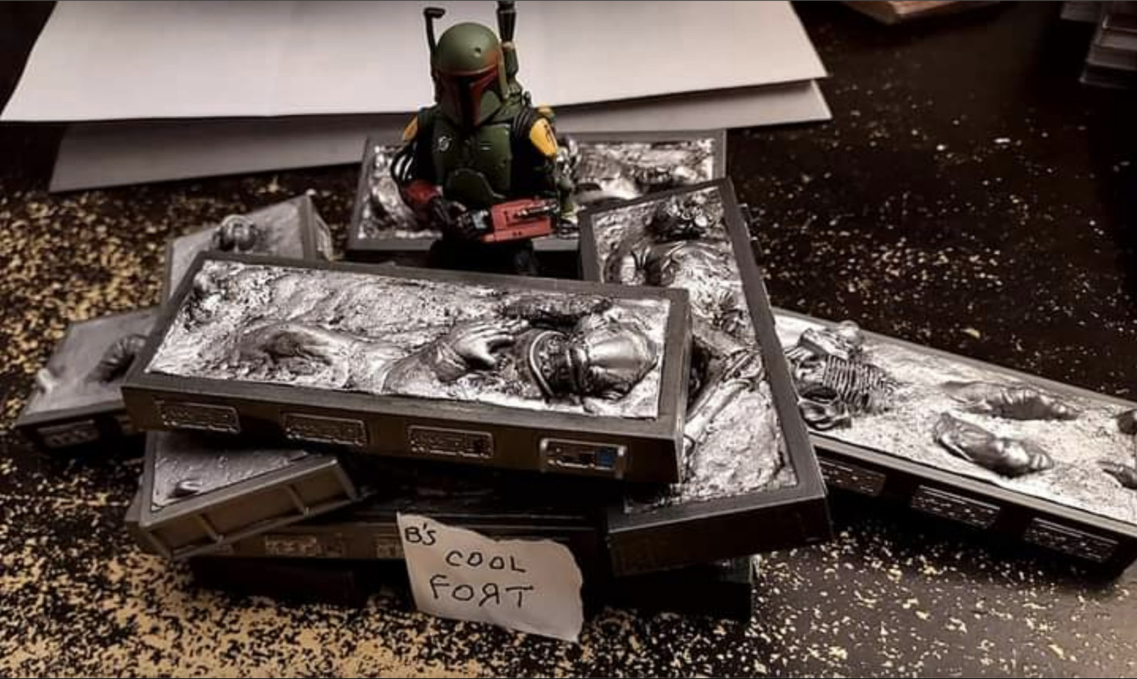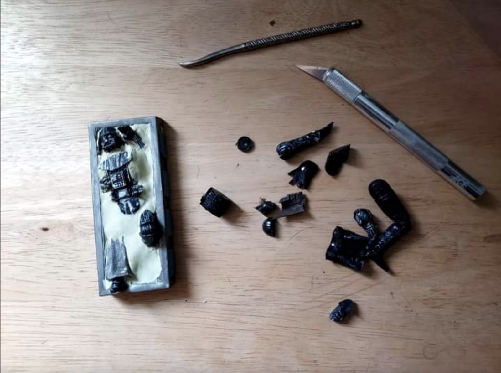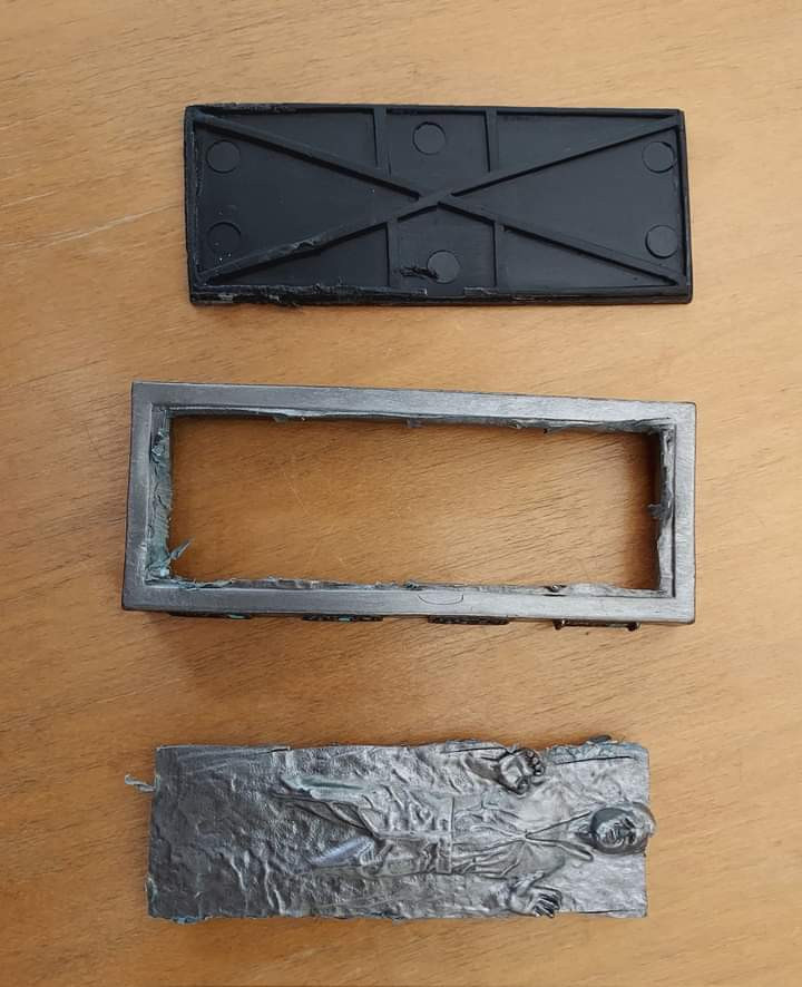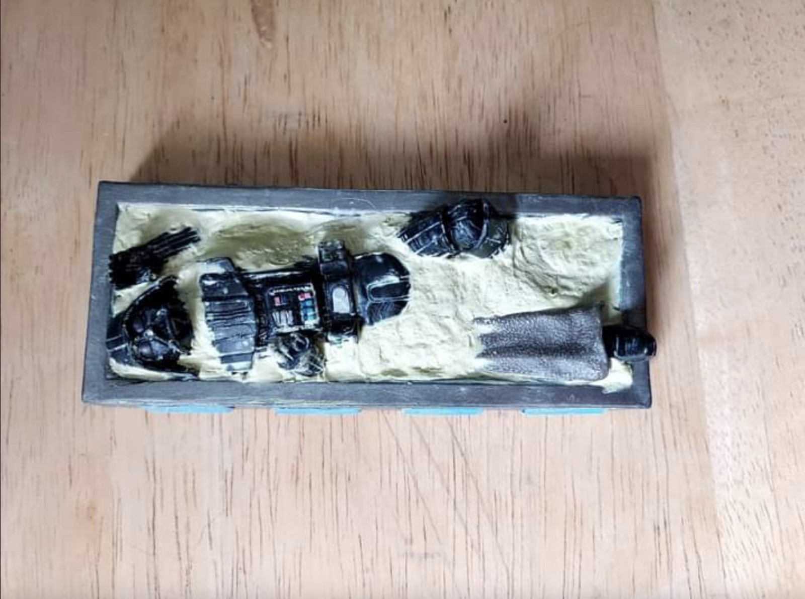 1) Get a carbonite block and a target figure. Modern TVC blocks are ideal because they're hollow so easy to trim. The 3.75 black series one looks almost the same but is much thicker plastic and has a lot of internal struts.