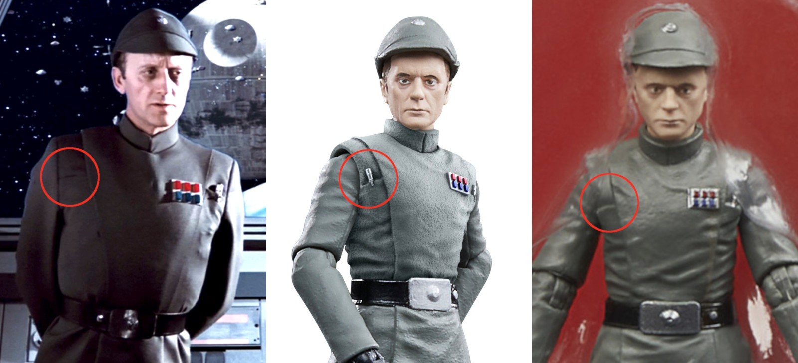 The only negative I can come up with is that the removable hat is definitely too big. I don't know why this was done. One interesting thing to note is that Piett didn't have the code cylinder in his right pocket. The loose figure shown has the cylinder, but if you look at the figure in the carded sample, it does not: