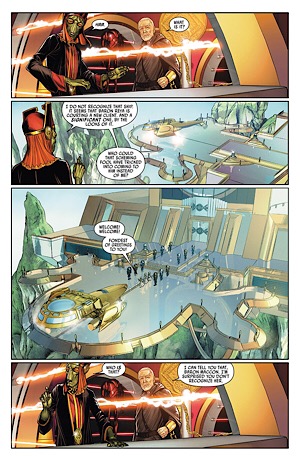 “Legend Found” brings to a conclusion the series main storyline begun in issue one. The series was originally scheduled to end with issue 25, but was continued based on its sales. The final storyline that follows is really an addendum to The Force Awakens and an epilogue to The Last Jedi. The search for Lor San Tekka, the conflict with Terex, they all come to an end here. It’s a fitting end. “Legend Found” starts off on a bit of a pessimistic note, with Leia bemoaning the complacency in the galaxy that has led to the threat of the First Order, Snap and Kare putting their relationship on hold, and Jess struggling to find an astromech willing to fly with her because she has gone through so many it has earned her the moniker “the great destroyer”. The story does not allow itself to become weighted down by all of this, however; and really takes off when the heist starts to go down. Soule and Unzueta plot the whole thing very cinematically, with the story alternating between the scam actually going down and flashbacks to Leia explaining the plan to the group. Leia gets some great time in the spotlight and really shines in this story. Her remarks about spending time with smugglers, schemers, and thieves; hearing their stories and seeing them operate is really nice. The references to Padme and other PT/CW era events is a great treat. Leia and the other legacy characters tie the Sequel Trilogy back to the Original Trilogy; but Lor San Tekka, even though he is a “new” character, feels like someone who ties all three trilogies together with his knowledge both of the Jedi & Sith in general and the Skywalker family in particular. It seems only fitting that this final storyline in the quest to locate him should pretty heavily callback the Prequel Era.