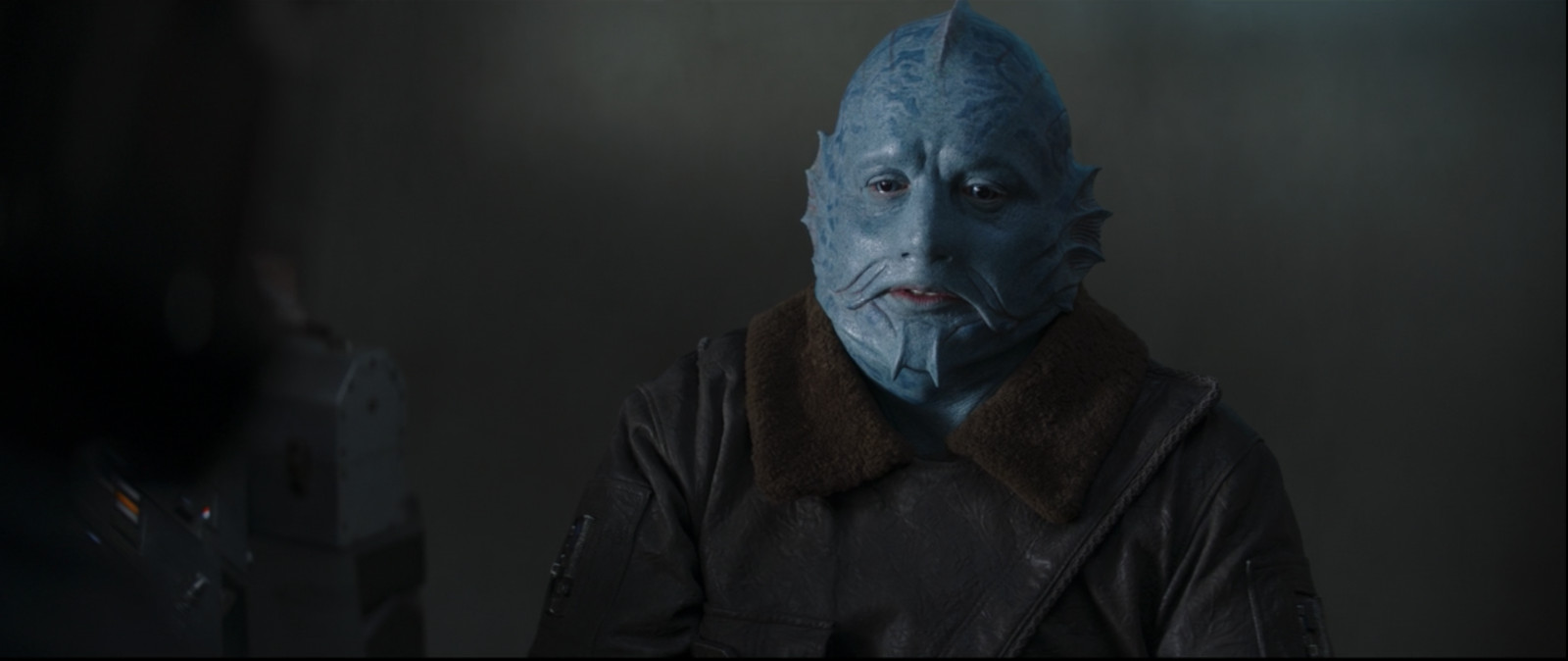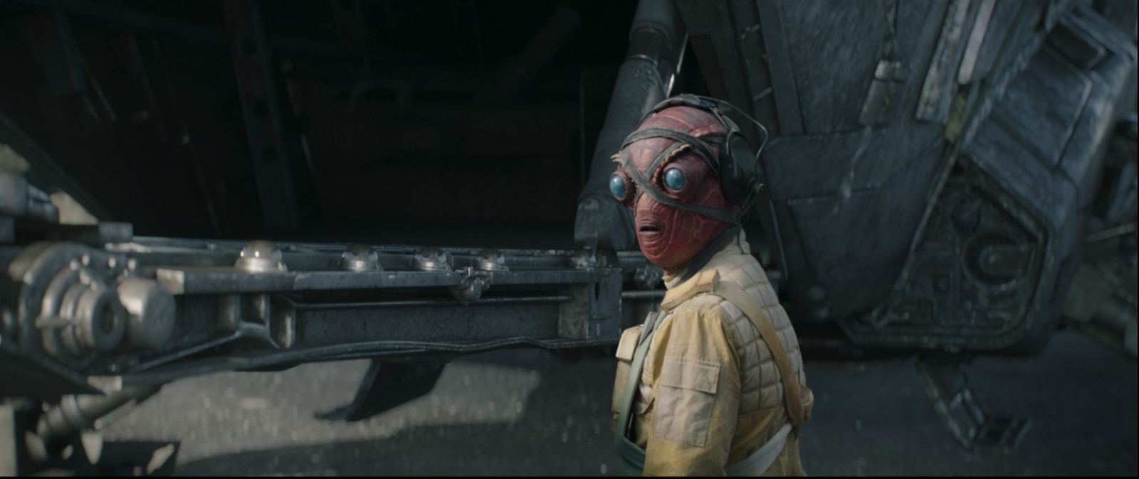Mando sets his flotsam-in-waiting Razor Crest down in the nameless Nevarro settlement from season one, and is greeted by old friends Cara Dune and Greef Karga. We learn that Cara is now the marshal, which is suddenly a big deal title in Star Wars. Karga tells Mando that he will put his best men on repairing the Crest. One of these top-flight mechanics is a Mimbanese who seems to dwell a little too long on Mando and The Child. I don't like the way this looks. He's up to somethin'!