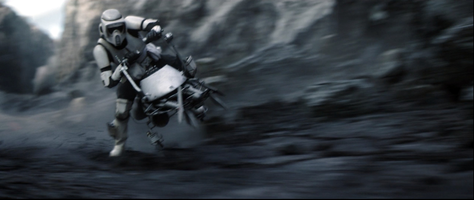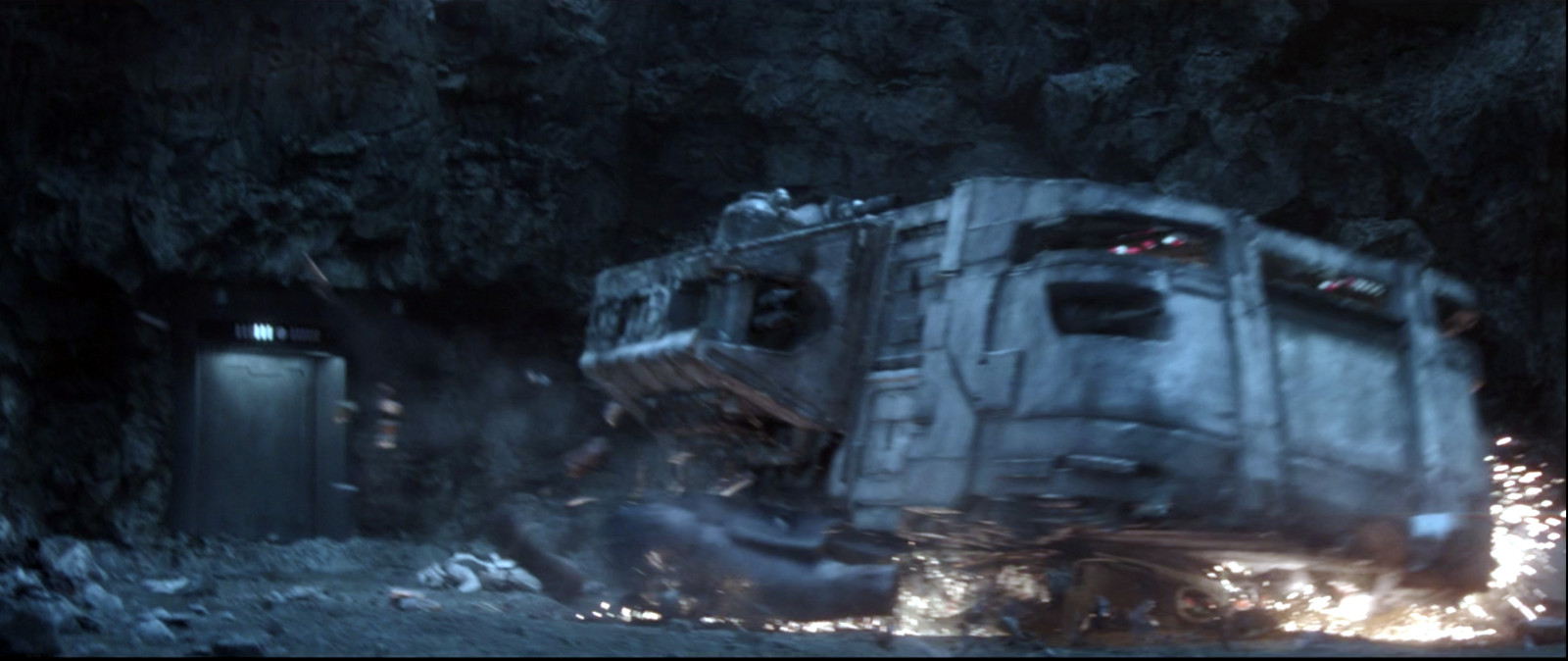En route to the base, Karga explains that the plan is to overload the base's reactor. Mythrol pulls them up to the front door in his fancy speeder. He even agrees to help on the mission, but he's not happy about leaving his speeder unattended. Gosh, I hope nothing happens to it. Mando breaks into the base, which he quickly notes isn't as empty as Greef promised. Meanwhile, Mythrol notices the mint Trexler Marauder which will fetch a fortune on the black market. The Trexler Marauder looks like a beefed up Imperial Troop Transport. It's a land based vehicle, so naturally it's sitting on what looks like a landing platform some one hundred feet in the air...right above Mythrol's fancy speeder.