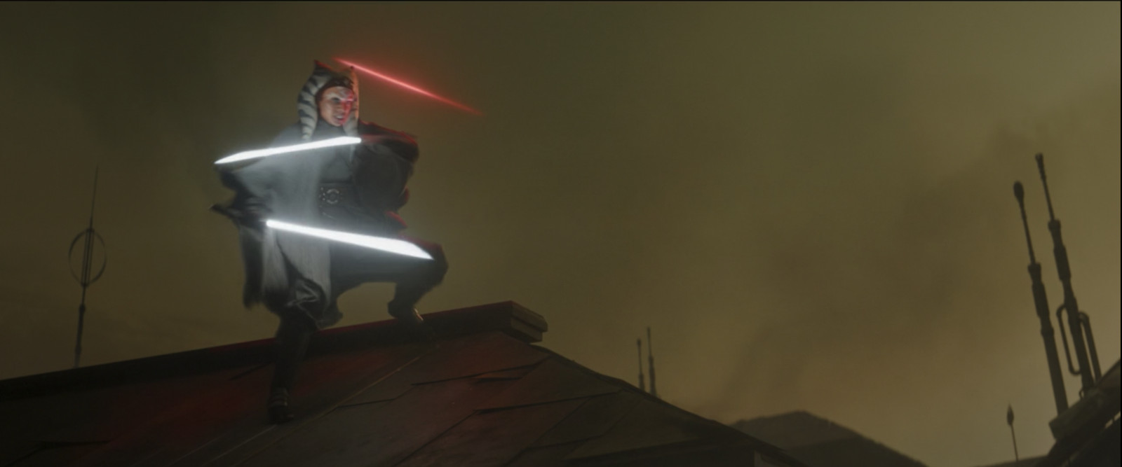 The show opens in a walled village which is surrounded by a misty dead forrest. An alarm bell rings as armed guards spring to action. Clearly Sunny and Bajie must be about to attack The Window’s stronghold! Oh wait. This isn’t Into The Badlands. It just looks exactly like it. No, this is Star Wars, and soon a white lightsaber ignites, and I literally cheered out loud. The village is under attack from Ahsoka Tano who systematically picks off the guards one by one.