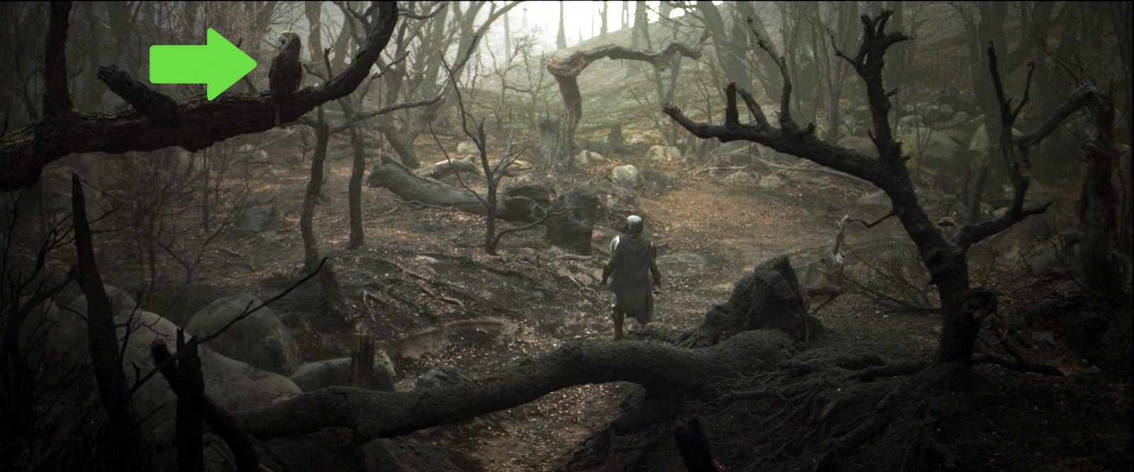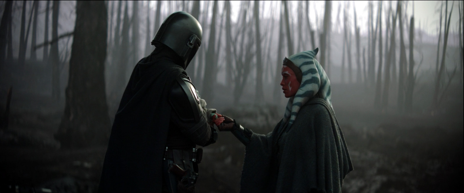 Eventually the village guards tell Mando that the Magistrate wants to speak to him. He meets with her, and she tells Mando that she's being plagued by a Jedi, and plays up the "enemy of my enemy is my friend" angle to entice him to take up the bounty. The payment will be a spear made of pure beskar if he kills the Jedi. Mando plays along since this is dovetailing perfectly with his mission to find Ahsoka. Back in the ghost forest, Mando is tracking Ahsoka when he gets "a bad feeling about this" and grabs his fancy spyglass. He declares it a false alarm when he sees one of the "legs go all the way up" cows eating one of the dead trees. As he lowers his spyglass, he is set upon by Ahsoka. This is a nice callback to the similar scene in A New Hope when Luke is attacked by the Tusken Raiders. The kerfuffle lasts only a few moments before Mando tells Ahsoka he was sent by Bo-Katan and only wants to talk.