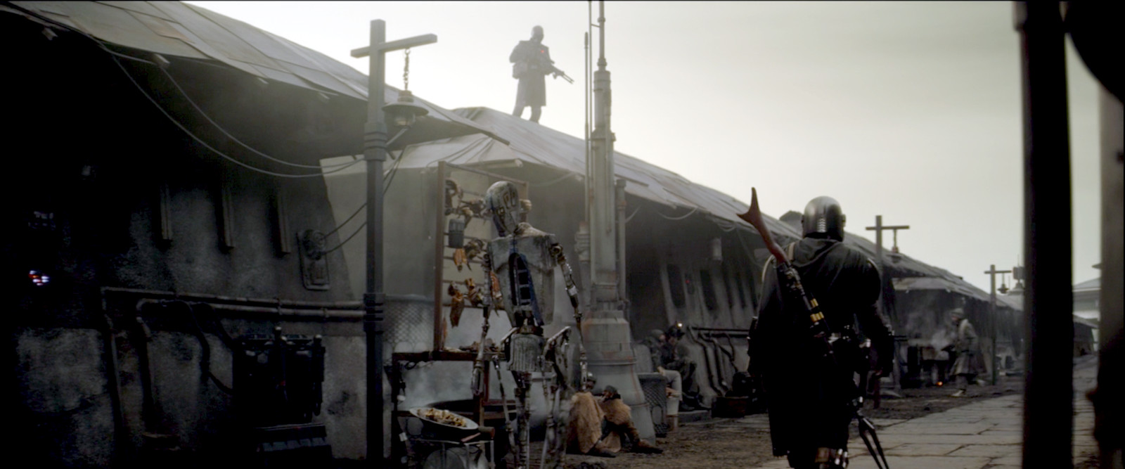 We next cut to the cockpit of the Razor Crest on approach to Corvus. The Child is still trying steal the knob off the Crest’s gear shift, but Mando insists he take his seat and put his tray in the upright position. The Crest sets down in the ghost forest, and after reclaiming the pilfered knob from The Child, Mando heads to town for some information. He gains entry into the walled village under the auspices of Bounty Hunter Guild business. Upon entry, the townsfolk give Mando the same icy reception that Popeye got when he first set foot in Sweethaven. Note: Mando missed a massive opportunity to break out into song with a rendition of Blow Me Down.