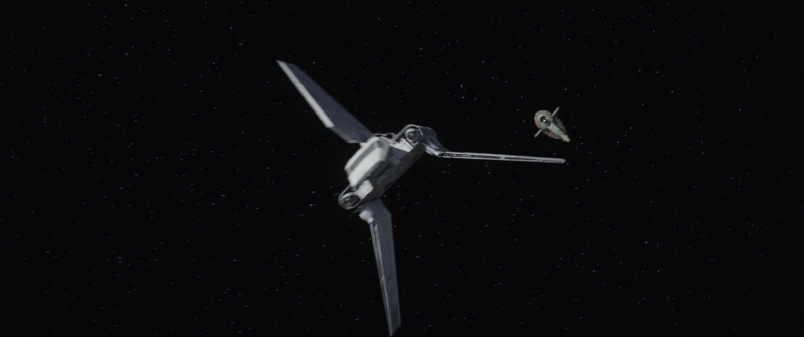 The episode starts off with Slave I in pursuit of an Lamda-class Imperial Shuttle. It's Dr. Pershing's transport, and Boba Fett disables it with an ion blast. Mando boards and starts grilling Pershing about Grogu's status. He's alive. Cara "the Barber" Beefcake boards, and the pilot tinkles himself. He grabs Pershing realizing he's an invaluable intelligence source to the New Republic if Dune can capture him alive, and threatens to kill him. The co-pilot simply wants to surrender, and the pilot shoots that stunted slime for attempting to give up the ship. The pilot, recognizing Dune's Alliance Starbird tear tattoo, starts taunting her about Alderaan. He witnessed its destruction from the Death Star. Dune dishes back the taunts about how the Rebellion blew up Death Stars like it was picking daisies. The rhetoric escalates until Dune takes the headshot and kills the pilot with the blaster bolt whizzing past Dr. Pershing's ear.