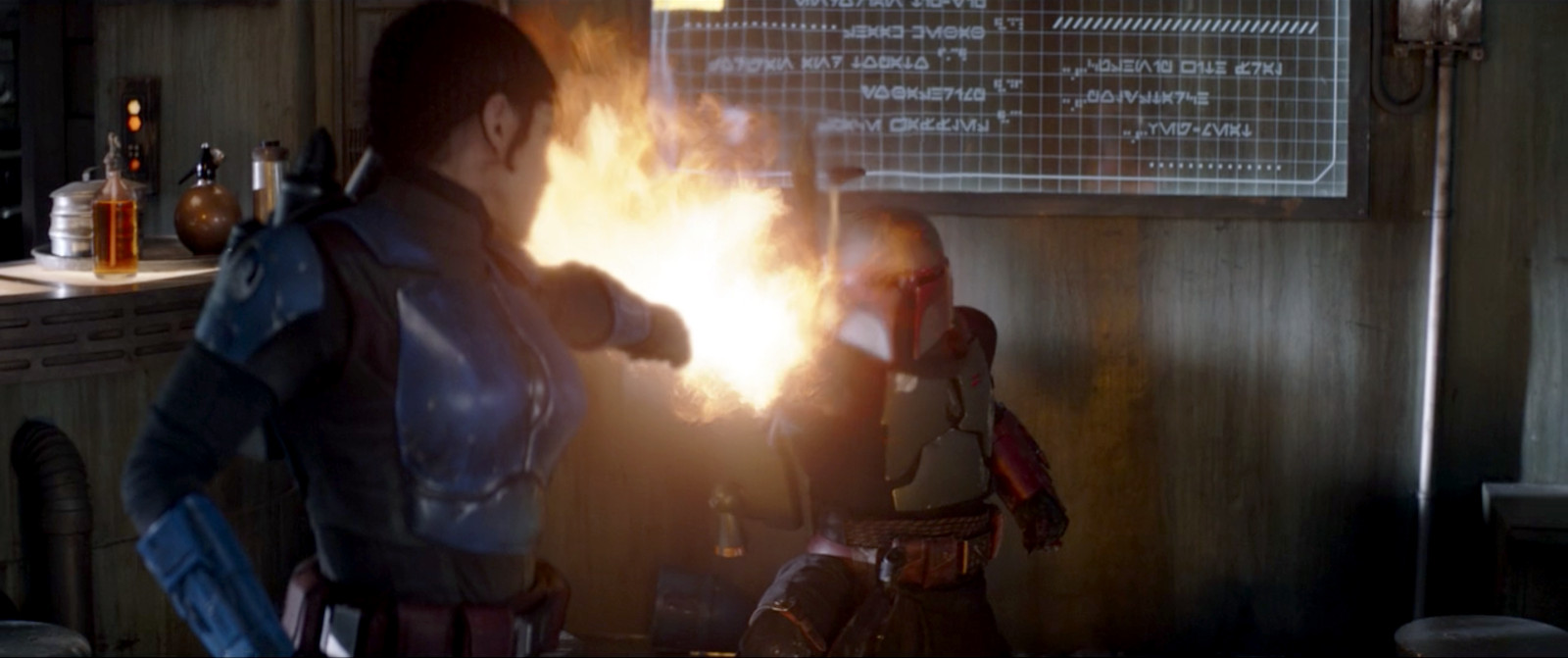 Slave I next travels to a planet that is mostly plains dotted by repeated industrial buildings. It lands and we see the familiar Kom'rk-class fighter/transport, better known to fans of The Clone Wars as the Mandalorian bus. Inside a cantina, Din and Fett find Bo-Katan and Kasoka Reeves. Mando ask Katan for help in rescuing Grogu from Moff Gideon, but she quickly dismisses the effort as futile since they will never find him. Fett urges Mando to stop wasting time with the pair. His clone voice visibly gets the attention of the lady Mandos. Mando interjects that he has Gideon's coordinates, and now Katan is interested. He further offers that the Moff's light cruiser could aid her in recapturing Mandalore. Fett scoffs at the notion insisting the Empire turned Mandalore into a glass parking lot. For the second scene in a row, escalating rhetoric leads to violence as Fett and Reeves fight until the point of a flame-thrower stand off. Katan calls them off, and offers their help on two conditions. One, she gets to keep Gideon's cruiser. I feel like Mando already offered that, so it was the worst negotiating since Kramer accepted unlimited free refills. Two, she will kill Gideon and retake the Darksaber. Mando could care less about the spoils. He just wants his kid.