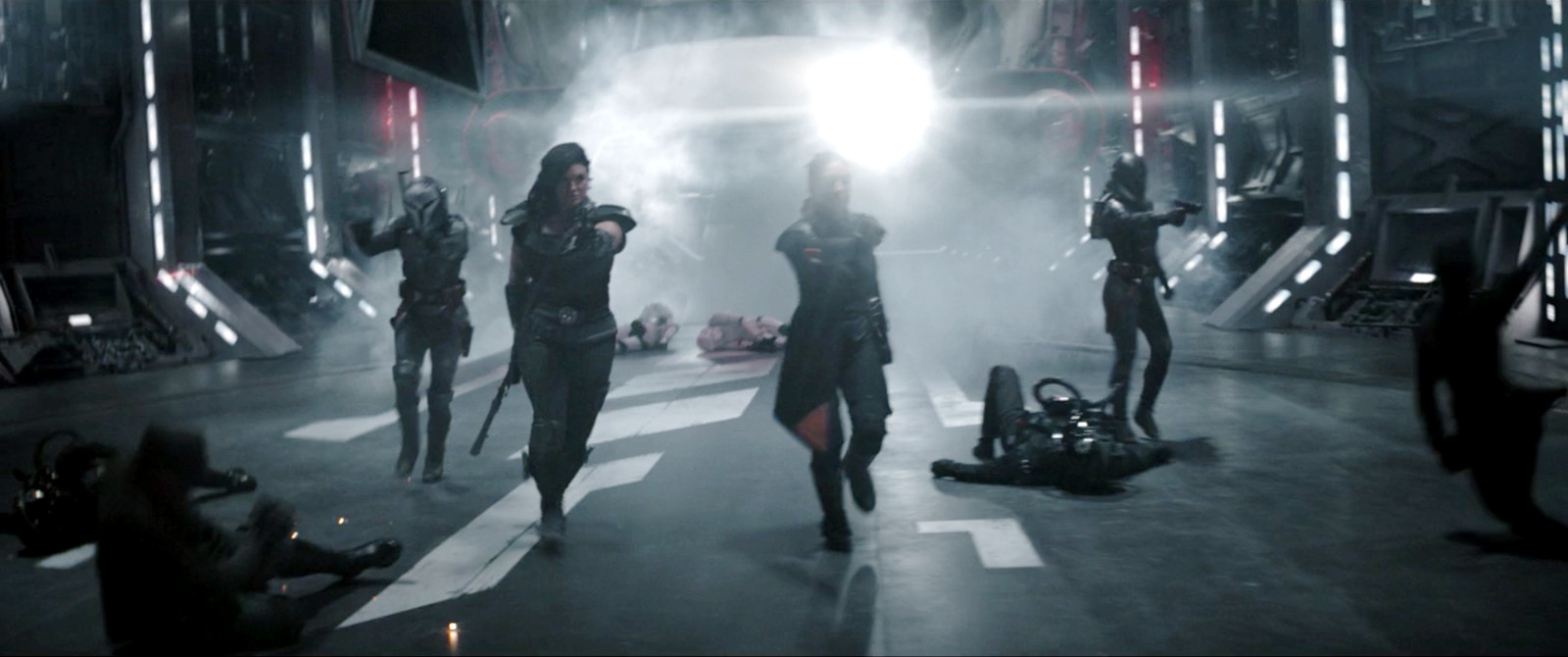 As Slave I and the shuttle are traveling in hyperspace to Gidoen's coordinates, Dune insists they capture him alive due to the invaluable intelligence he could provide as an ex-ISB operative. Bo-Katan agrees, but insists that Gideon surrender to her. Upon exiting hyperspace, the plan goes to pot almost immediately. Fett puts on a good show of trying to take down the shuttle. Bo-Katan requests emergency landing, but Gideon's Spider-Sense is up. Instead, he orders fighters to be launched, and the shuttle is commanded to stay clear of the launch tube. Bo-Katan improvises and insist the attack is too relentless. She crash lands in the landing bay. There's a clear metaphor playing out, but we'll leave it. Something about penetrating a launch tube. The plan gets back on track as Mando's Angels launch their shock attack laying waste to anyone in the landing bay. On cue, Gideon orders the Dark Troopers to be brought on line. They don't have solid state drives, so they'll take a tick or two to boot.