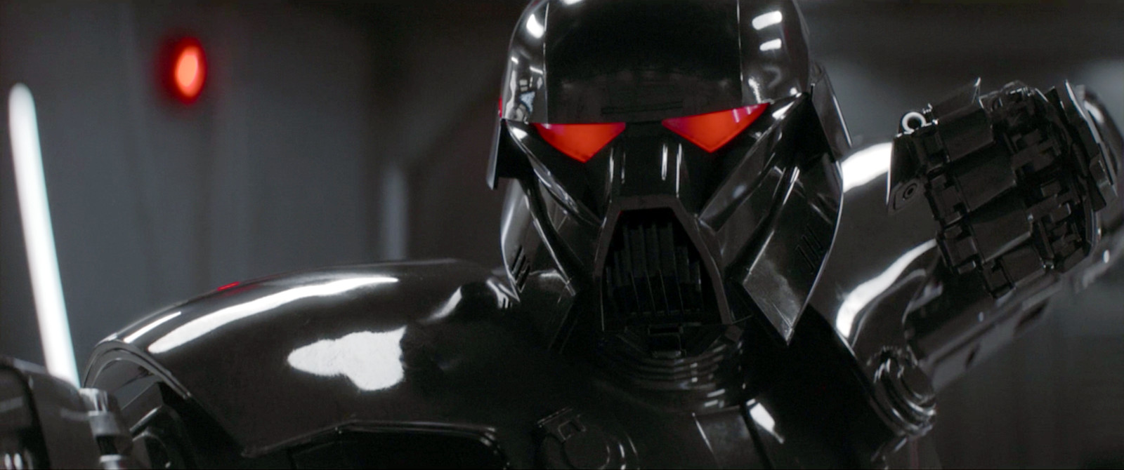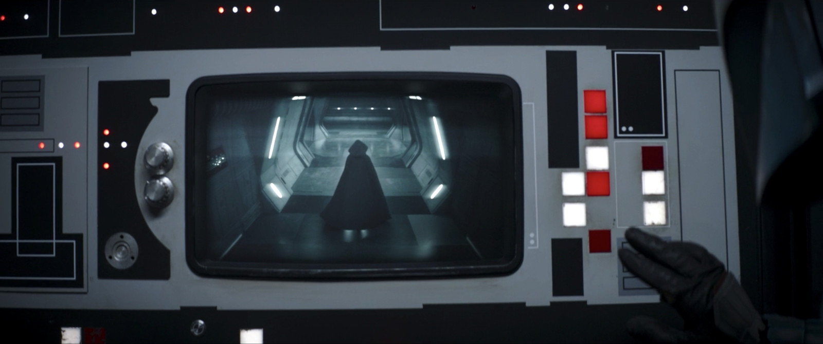 As the doors are about to be breached, and Gideon is licking his chops with glee, another alarm sounds. A lone X-Wing approaches. The chests of middle aged fan boys and girls across the globe tighten under the weight of daring to hope as tears well. Cara Dune sarcastically says, "we're saved" in response to the solitary rescue ship. You can stuff your sarcasm in a sack, sister, because you're gall-dern right you're saved. EVERYTHING IS SAVED! Grogu perks up. The Dark Troopers halt their assault. For the first time, Gideon grows visibly concerned. A cloaked figure appears on a monitor and confidentially strides down a hallway. Is it happening? The black and white monitor reveals the mysterious figure using a lightsaber to take down Dark Troopers with ease. Is it happening? Gideon's breath grows shallow and rapid. We cut to the figure and the saber is green. IS IT HAPPENING? The entire platoon of Dark Troopers barely slows the stranger on the way to the bridge as a combination of saber slashes and Force pushes makes quick work of them. Gideon uses the distraction to wield his concealed blaster and shoots Bo-Katan. He then attempts to kill Grogu, but Mando jumps in front of him and blocks the shots with his beskar. The rest of the team takes aim at Gideon, and he attempts to take his own life, but not before Dune knocks him out with the butt of her rifle. The stranger nearly reaches the bridge, and goes on a hallway rampage that mirrors Vader's at the end of Rogue One. The Dark Troopers are no more.