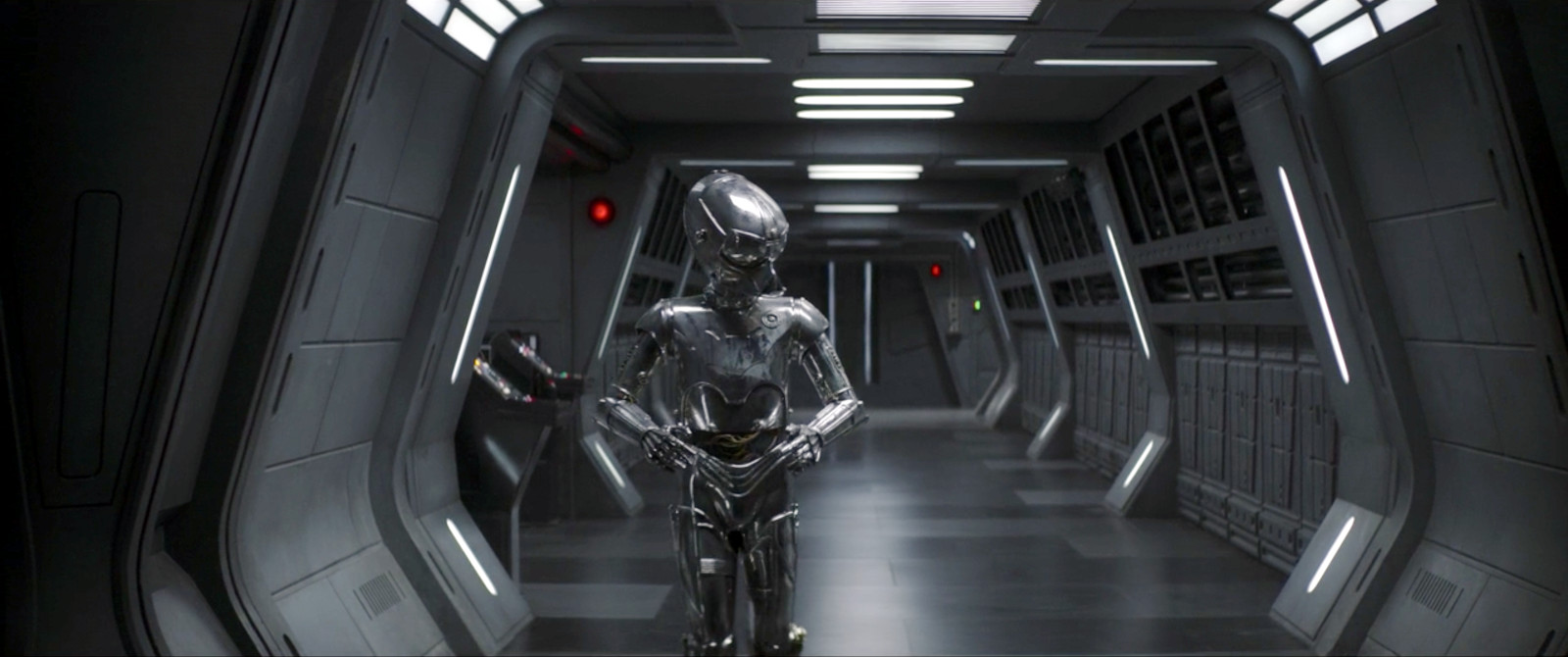 We return to the bridge and we quickly learn why Gideon was so delighted. Mando has earned the Darksaber. It can't be given or stolen. It must be won in combat. It's like the Little Brown Jug. The saber in and of itself is meaningless. The story or legend of the saber is what carries its weight. Mando tries to yield to Bo-Katan, but that won't satisfy the tradition. Esposito does a brilliant job of channeling Palpatine from Return of the Jedi and tries to goad Bo-Katan into attacking Mando right then and there. Hmmm. Return of the Jedi. I wonder if a Jedi will return soon. The tension is cut by alarms sounding. The ship is being boarded. The Dark Troopers who were sucked out into space have found their way back. Gideon once again revels in the proceedings, and Dune shove him to the deck. In doing so, he finds a lost blaster on the ground and conceals it. The Dark Troopers make their slow and steady march toward the bridge, and Reeves seals the blast doors. The droids begin to punch their way through as the assault team prepares for a futile last stand.