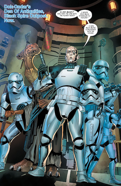Eh, it’s all right. It’s not terrible, but it’s inadequacies, which do seem to come to the fore when you see just how hard it pushes it’s theme park parent to the detriment of coherent story, can be glaring. The main part of the story, labeled “now”, takes place some time after TFA/TLJ. Kendoh, who is from Serreno, and her crew have acquired half of an ancient Sith sword and are looking to get the other half from Dok-Ondar. Apparently when the two halves are joined the bearer will have great power. Now, am I crazy, or was that not the original storyline to Masters of the Universe? Anyway, first Dok tells Kendoh and them about how he once hired Han Solo to get him the baby Sarlaac he has on display; then the First Order troops come a callin’ and he tells them how he came into possession of Ki-Adi-Mundi’s lightsaber after Greedo stole it from someone on Mygeeto. Of course, Kendoh already knows Dok has the other part of the sword and plans to steal it, but first she meets Hondo in Oga’s Cantina so she can arrange for him to help her get it off the planet. He tells her about the time he and Dok stole a statue from the Kyber Temple on Jedha. We then learn that Dok first came into possession of this sword (called the Sword of Kashyun) when he hired Dr. Aphra to retrieve it from an ancient Sith temple.