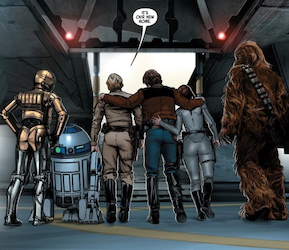 Leia begins her task by recruiting Benthic and the surviving Partisans from Jedha and the shapeshifter Tunga Arpagion (from the Mon Cala storyline). She says that her plan is to simply permanently disable Shu-Torun’s production capabilities, making it useless to the Empire. She insists that it is not about personal revenge or incurring a significant loss of life; and no reason to doubt her comes up in the story. That’s kind of a shame. I was hoping that Leia would at least be tempted to deliver the same level of destruction to Shu-Torun that Trios helped deliver to the Rebel Fleet. It really seemed like that’s where we were headed in the previous storyline, The Escape. Of course, in the end it is right that Leia doesn’t want to destroy the planet utterly, but I would have liked for her to be tempted to. Leia’s potential dark side is not something that has really been explored that I know of; at least not in the new canon. In a completely not shocking turn of events, it is Benthic and the Partisans who decide to break from the plan and pursue their own agenda, which is to turn Shu-Torun into a counterpart to Jedha.