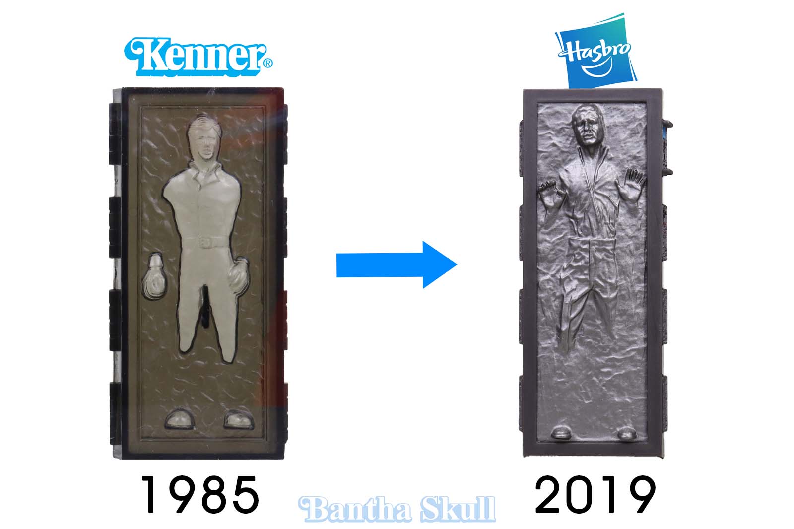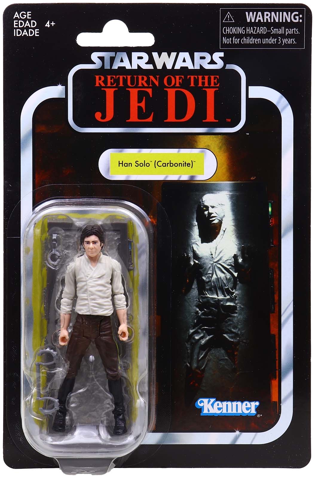 He's also no longer shackled somehow. A lot happened in that few seconds in the belly of the chamber before he was frozen. It's clearly just a continuity between scenes shot three years apart. Nonetheless, tucked shirt equals Episode VI and untucked shirt equals Episode V. The vintage Kenner figure clearly has his shirt inside his pants and thus represents Han in Jedi. The Vintage Collection figure, which is a repack of 2014's Black Series 3.75" #19 - Han Solo, has his shirt blousing over his pants and thus represents Han from the Carbon Freezing platform in Empire. It was technically wrong to put it under the Return of the Jedi banner in the Vintage Collection (and someone from Hasbro might have acknowledged that on the floor of Toy Fair).
